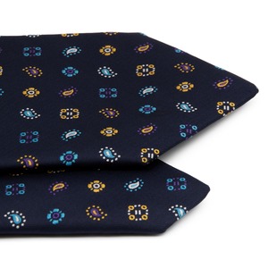 深みのあるネイビーブルーの地に、ペイズリーや小花がカラフルに散りばめられました。