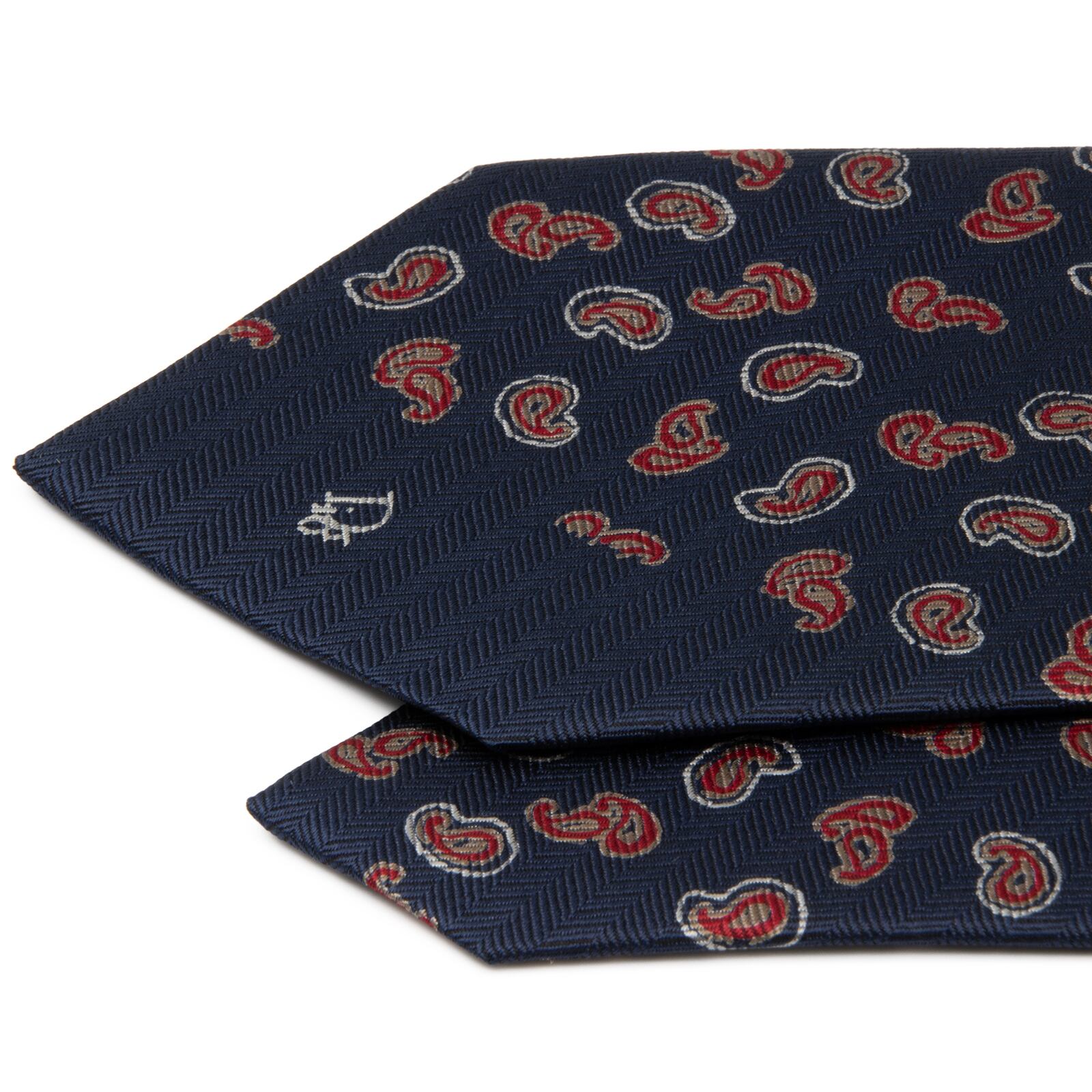 ネイビーブルーの地に、ワインレッドとグレージュで描かれた伝統的なペイズリーが、Y2Kのムードを纏って力強く浮かび上がります。