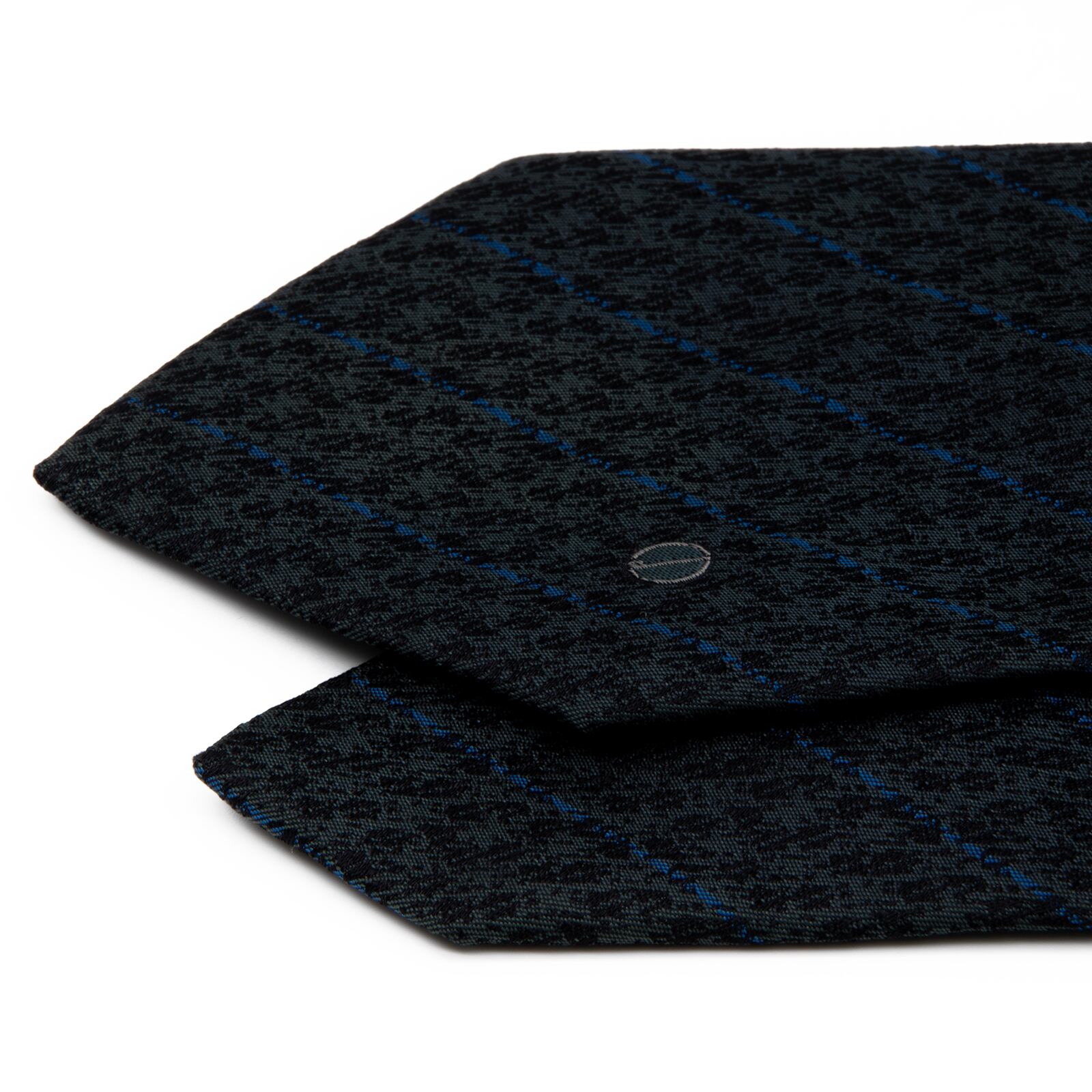 特筆すべきは、その複雑な織りのテクスチャーであり、一見無地にも見えるネイビーの部分に豊かな表情を生み出しました。