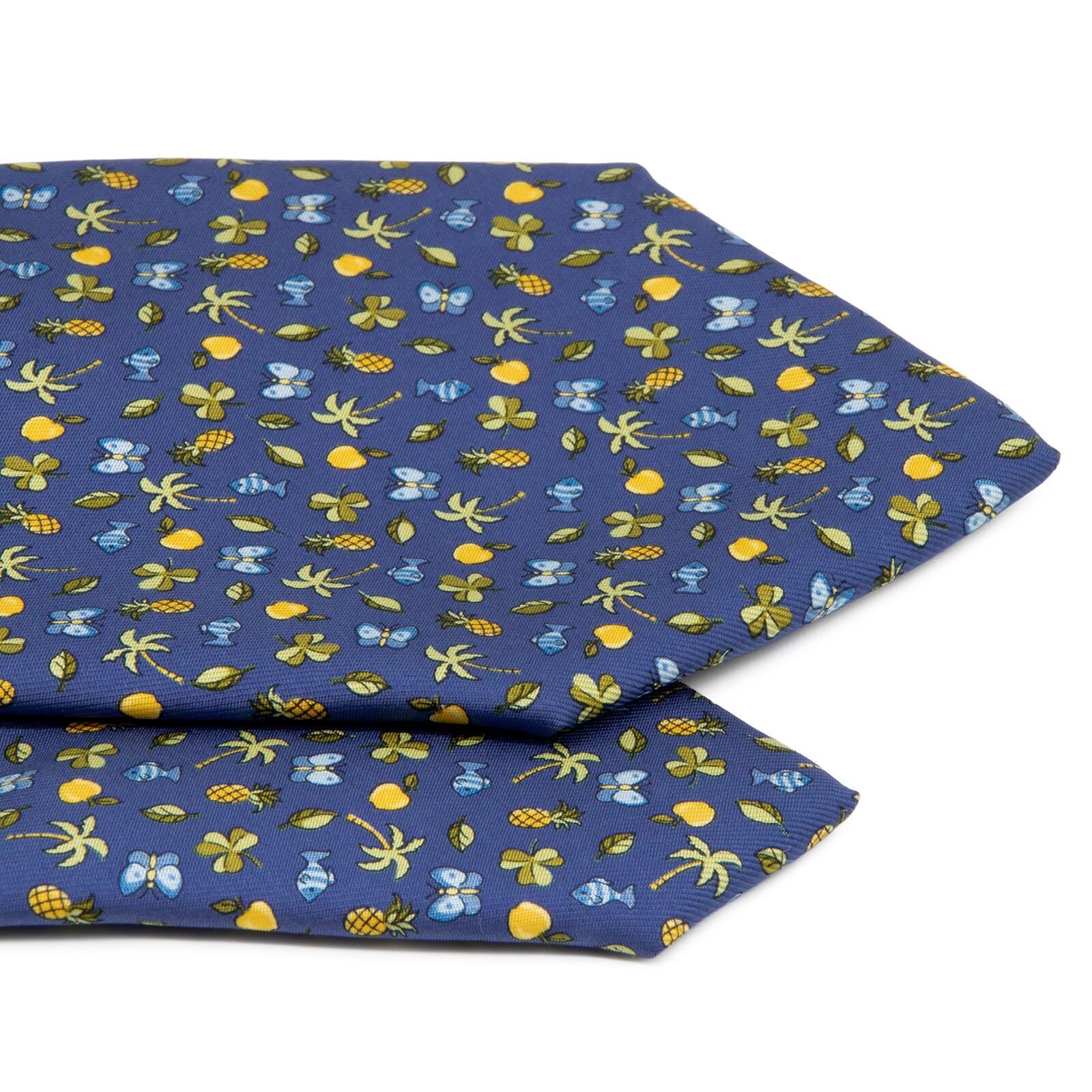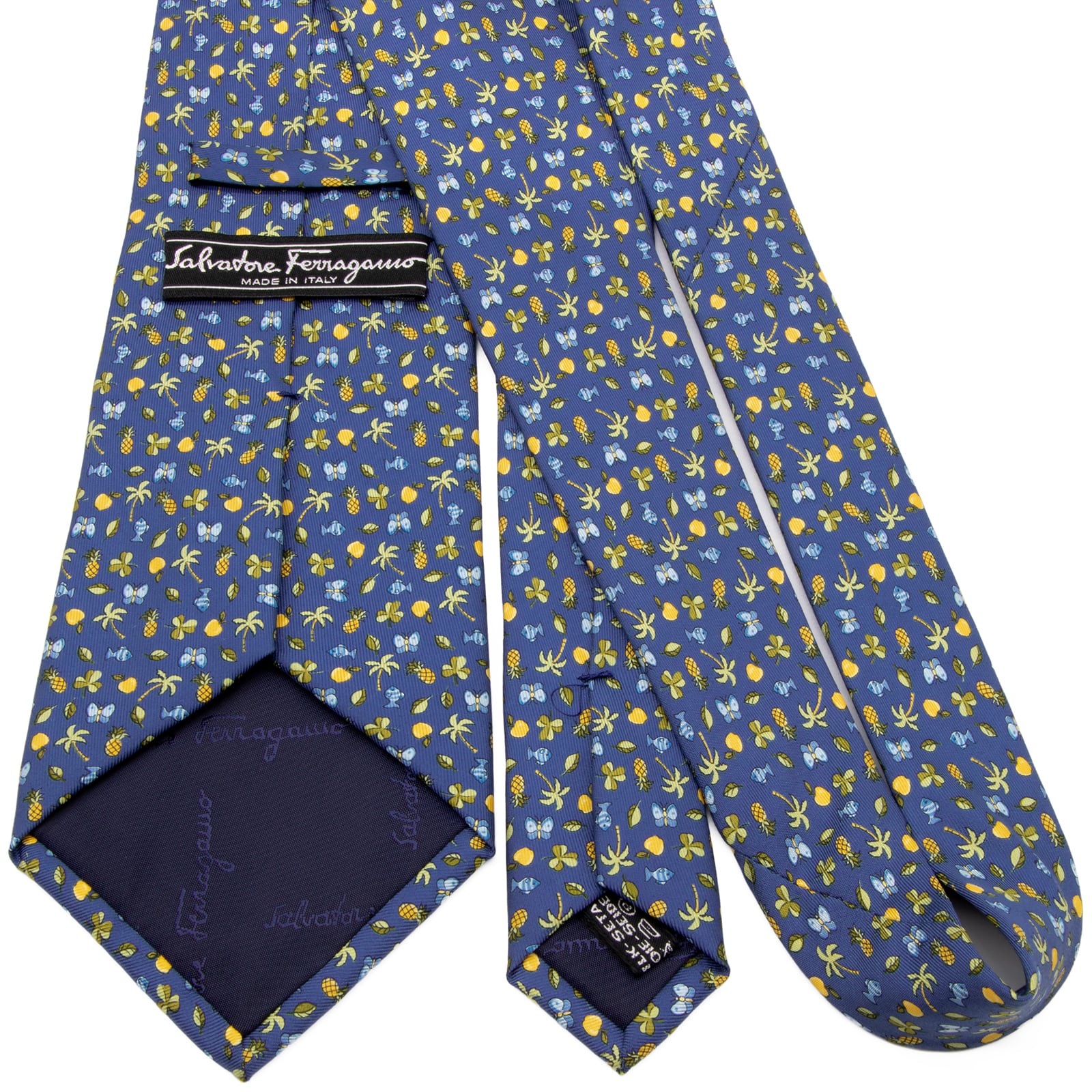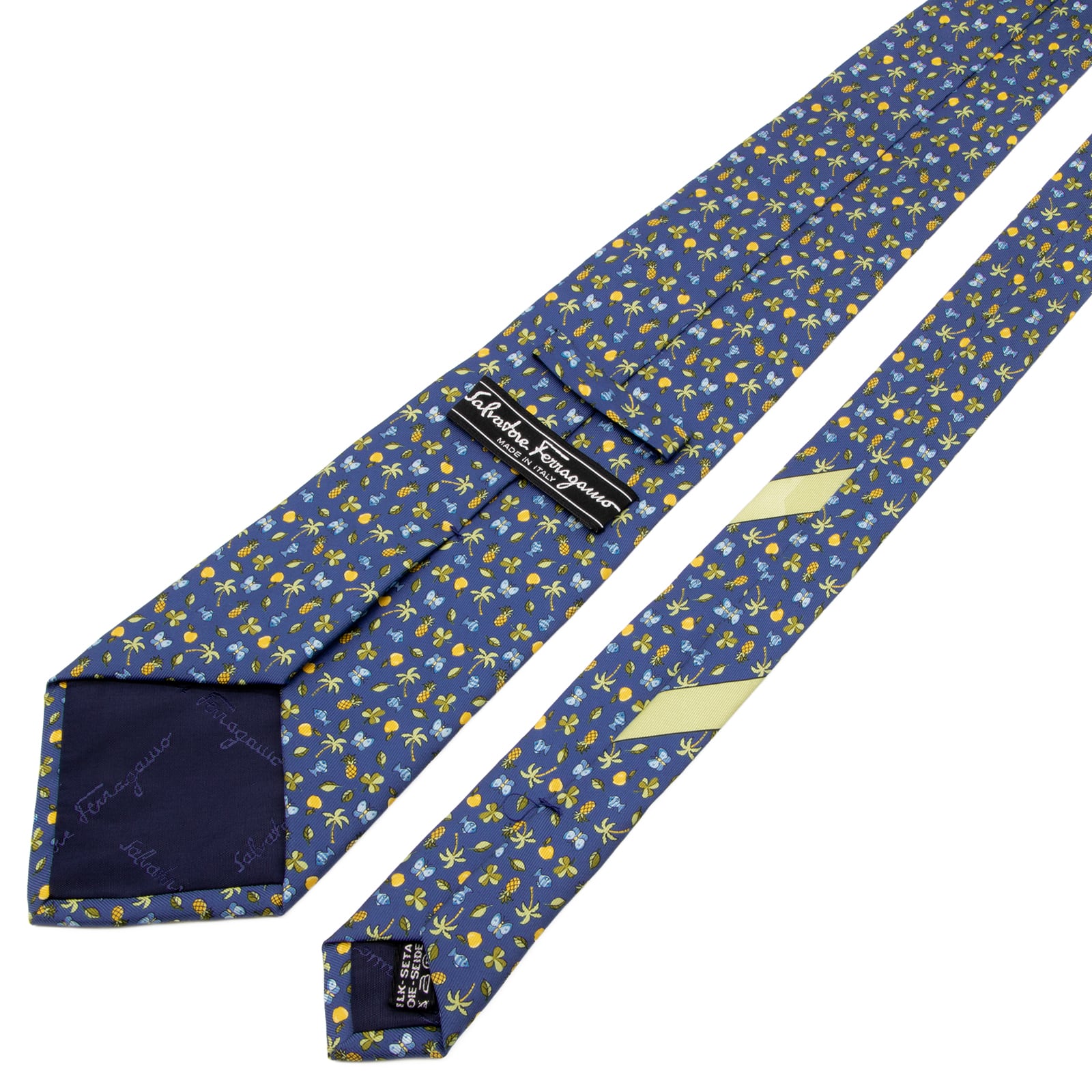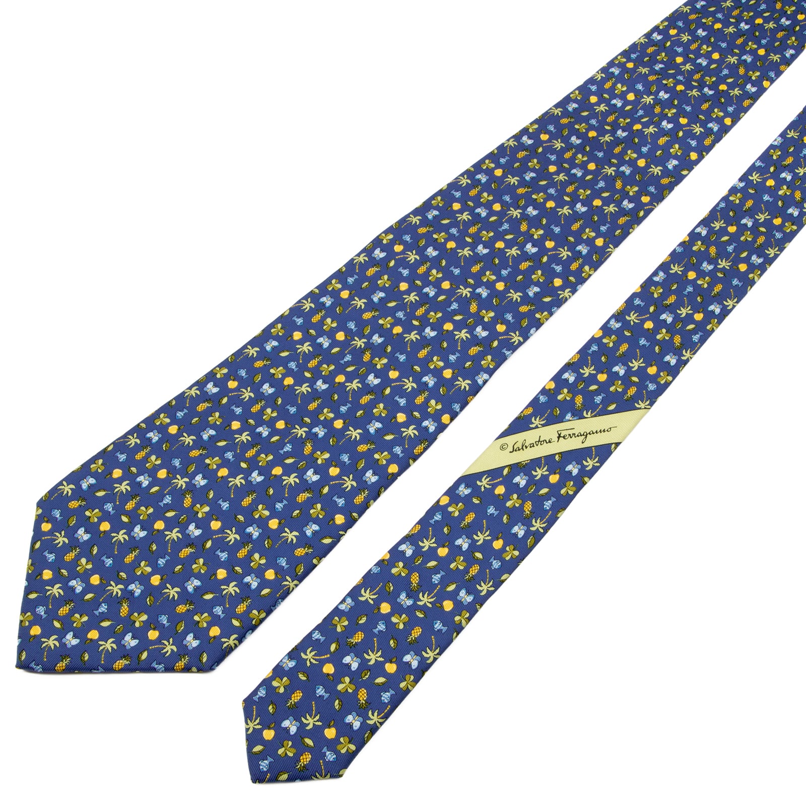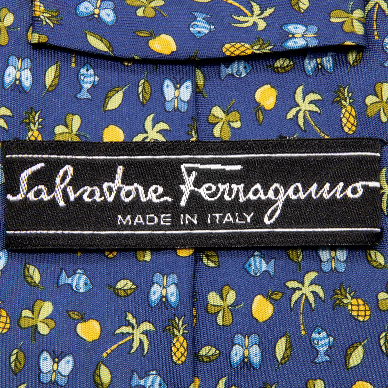 送料無料 フェラガモ ネクタイ 新品 シルク 青 緑 黄色 水色 総柄 ロゴ マーク 果物 フルーツ 葉っぱ リーフ 魚 蝶 ブランド かわいい P709