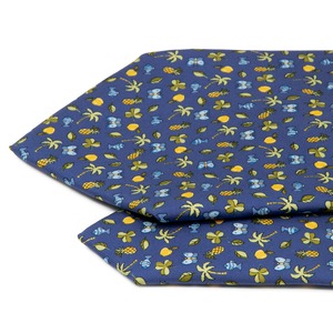特筆すべきは、ブルーのキャンバスに描かれた多彩なモチーフであり、パイナップル、魚、蝶々、ヤシの木がリズミカルに配置されました。