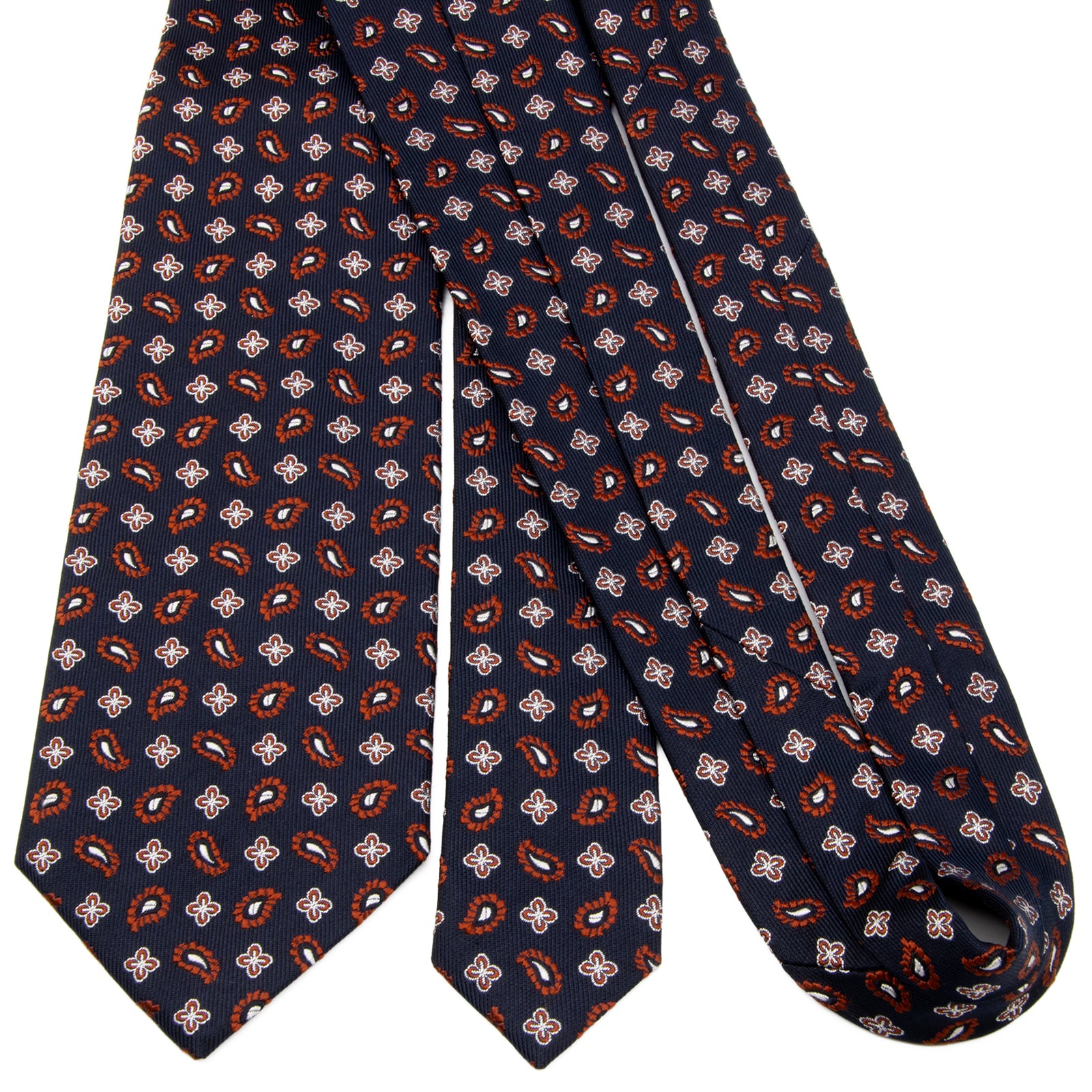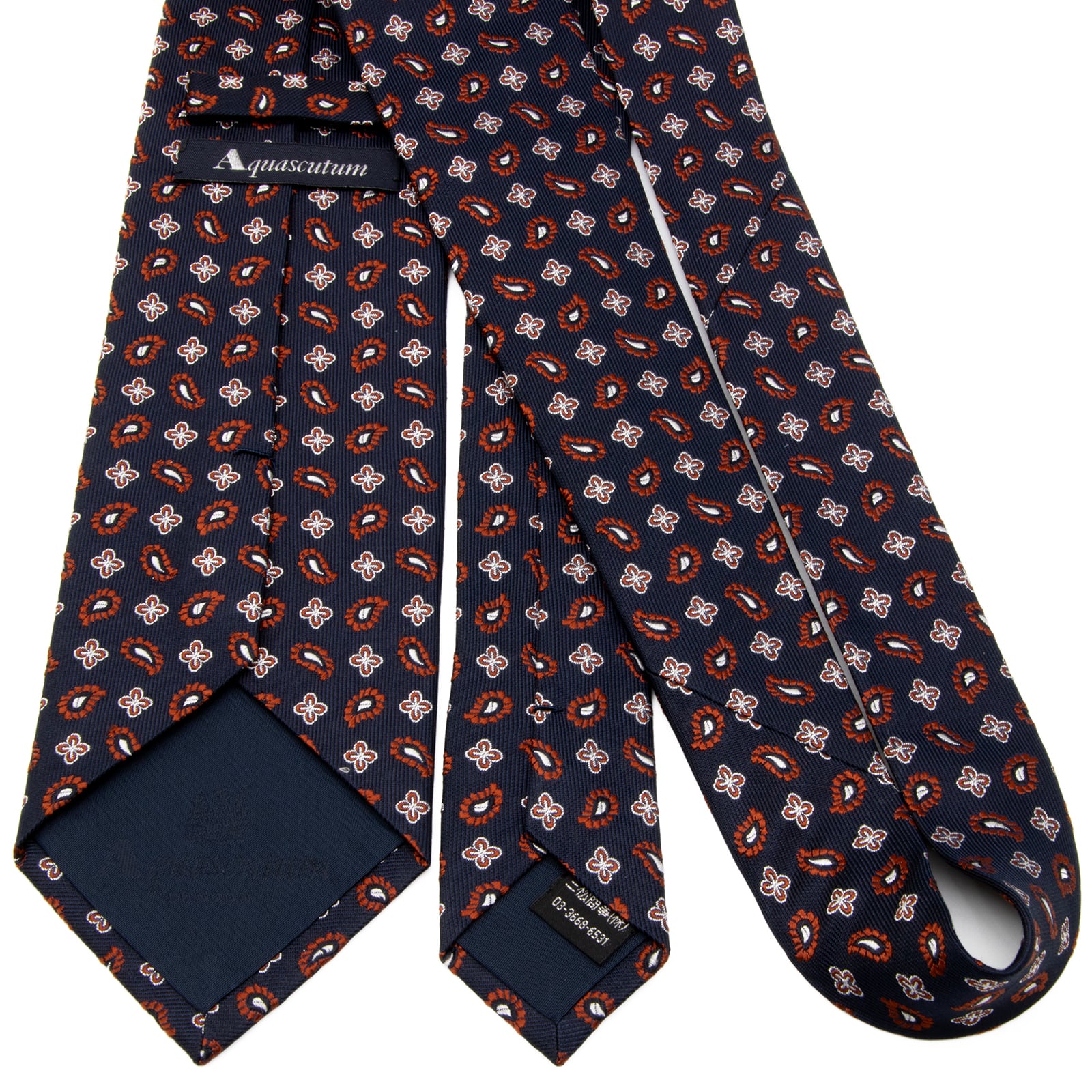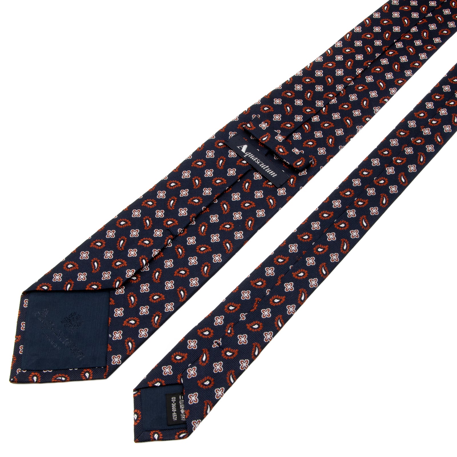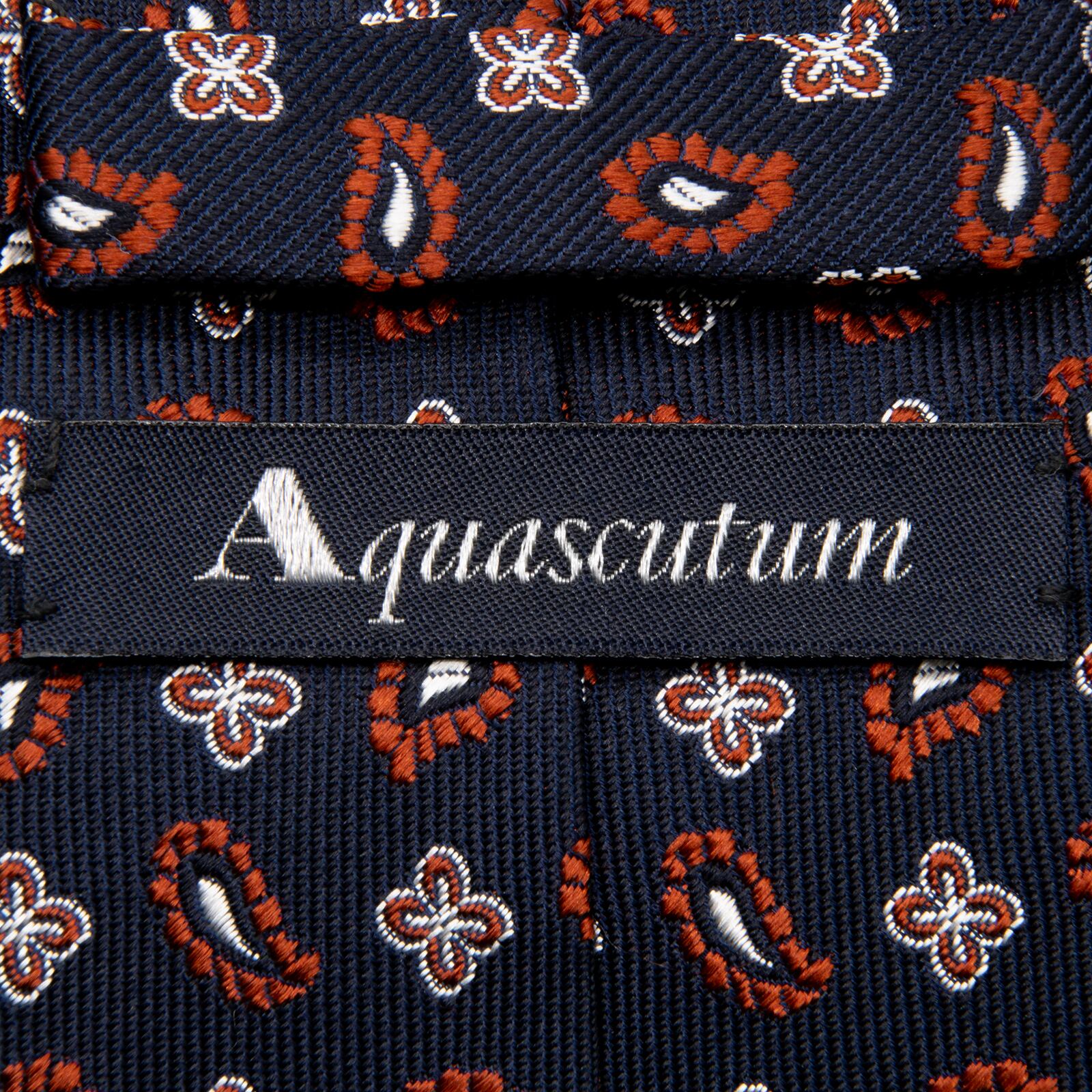 送料無料 アクアスキュータム ネクタイ レギュラータイ ジャガード 新品同様 ネイビーブルー 茶色 シルバー ペイズリー 花 ブランド P774