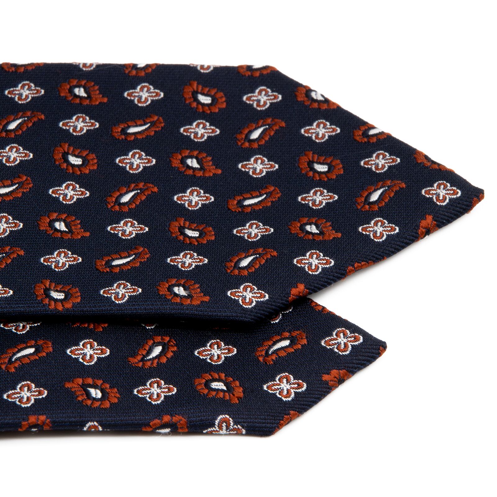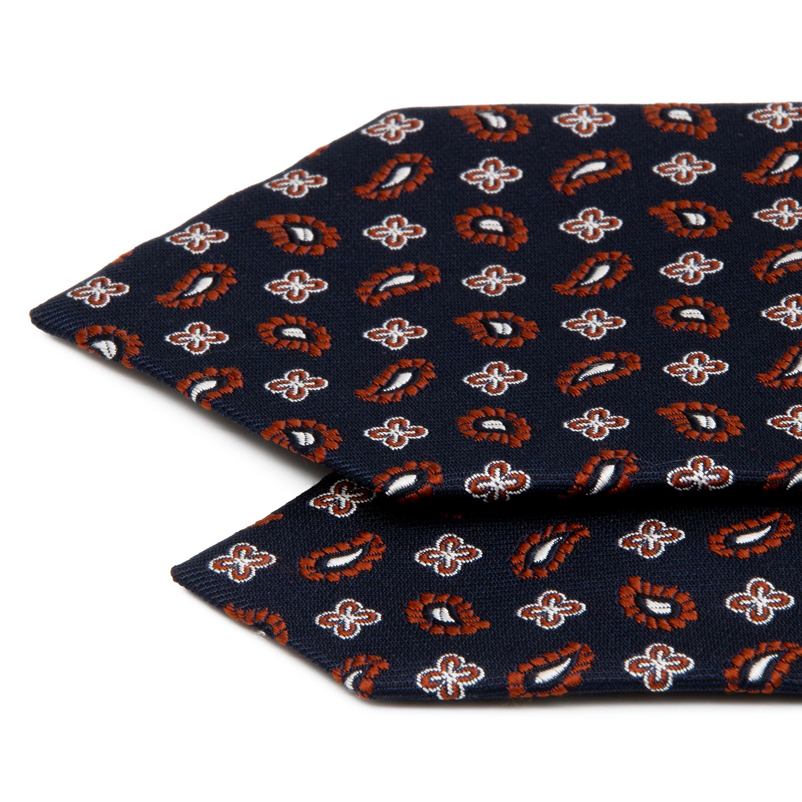 日本製の確かな品質を誇るシルクジャガードが、深みのあるネイビーブルーの地に、ブラウンとシルバーのモチーフを浮かび上がらせます。