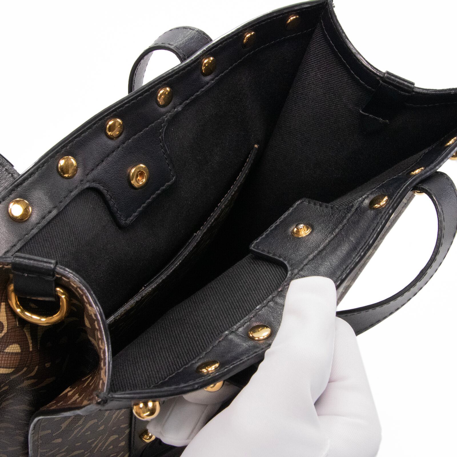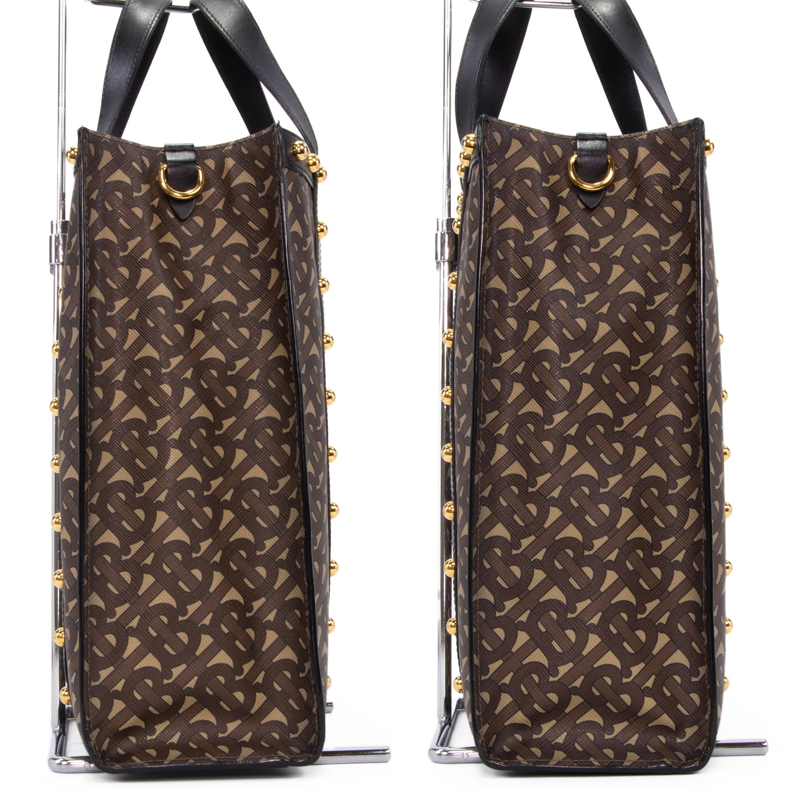 等間隔に打ち込まれたゴールドのスタッズが、ブラウン系の落ち着いた生地に映え、洗練された高級感を醸し出しております。