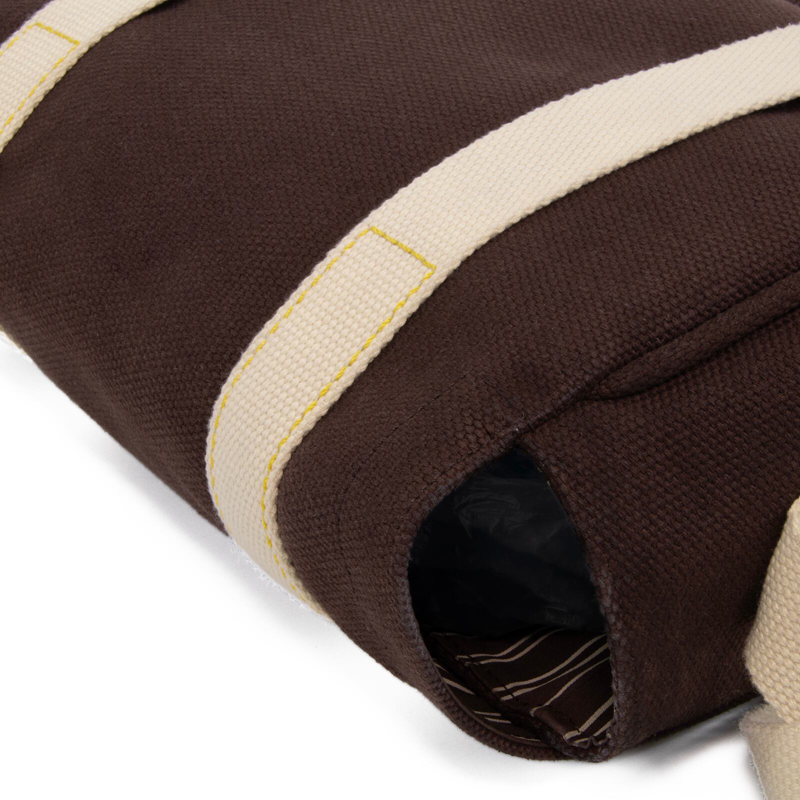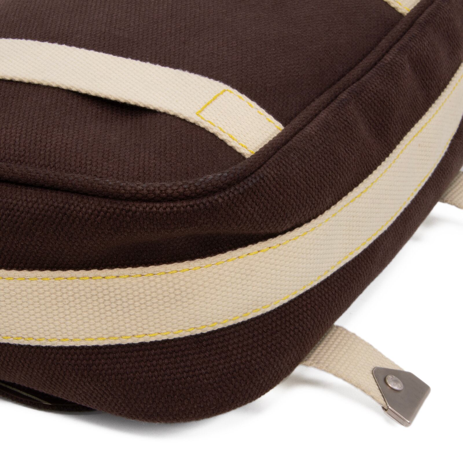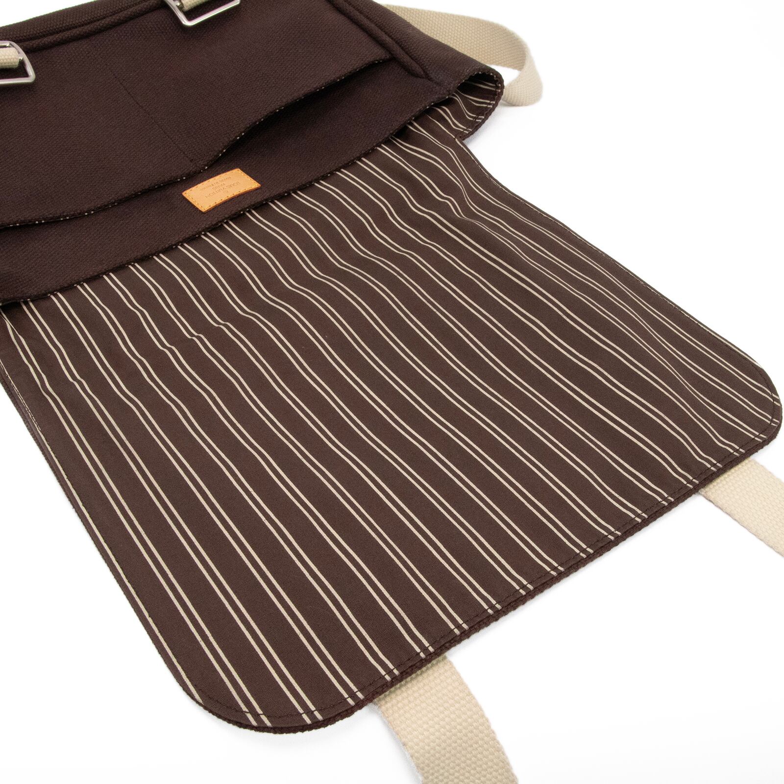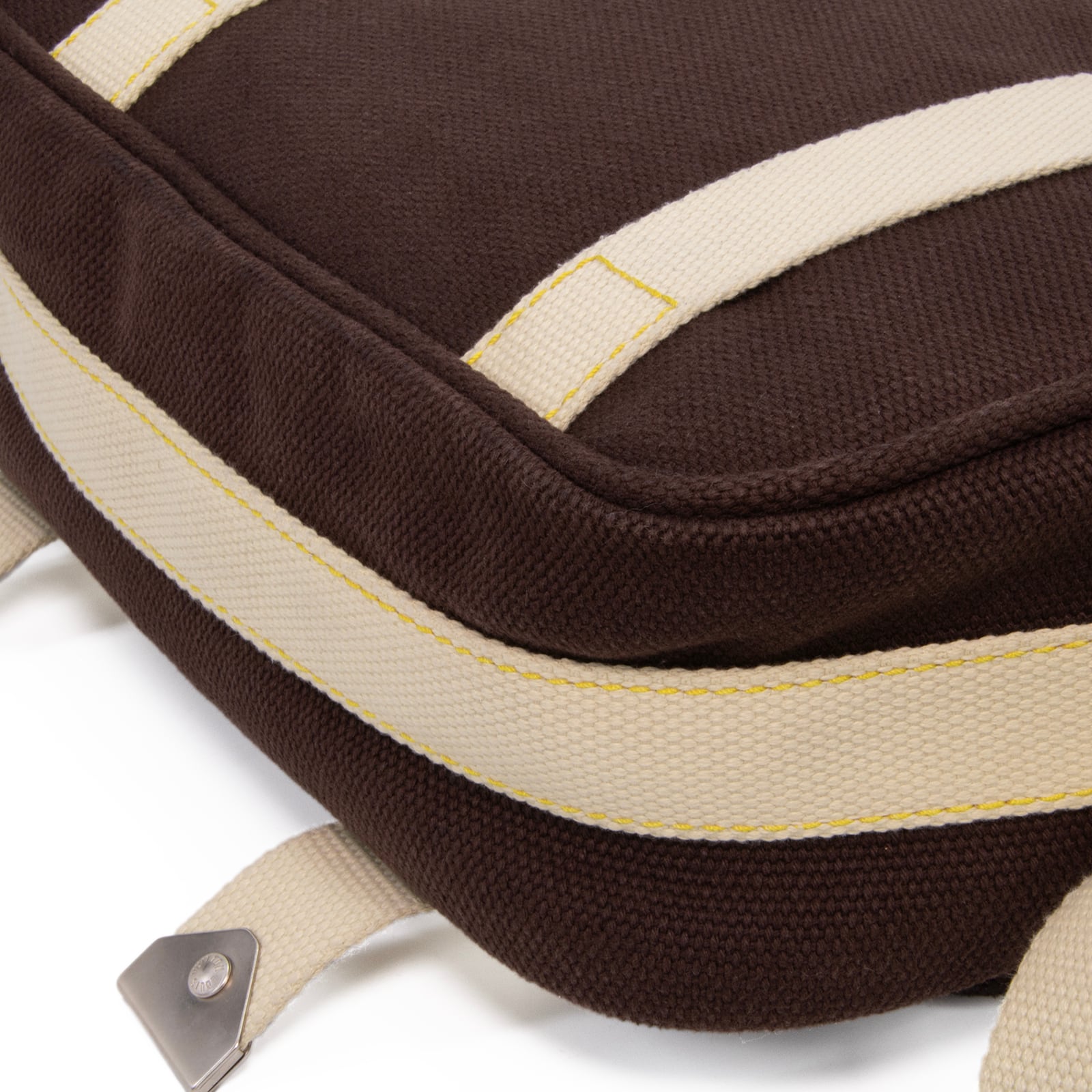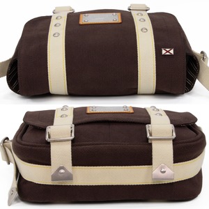 ダークブラウンのキャンバス地に、爽やかなアイボリーのストラップが映える、スポーティーかつエレガントな佇まいでございます。