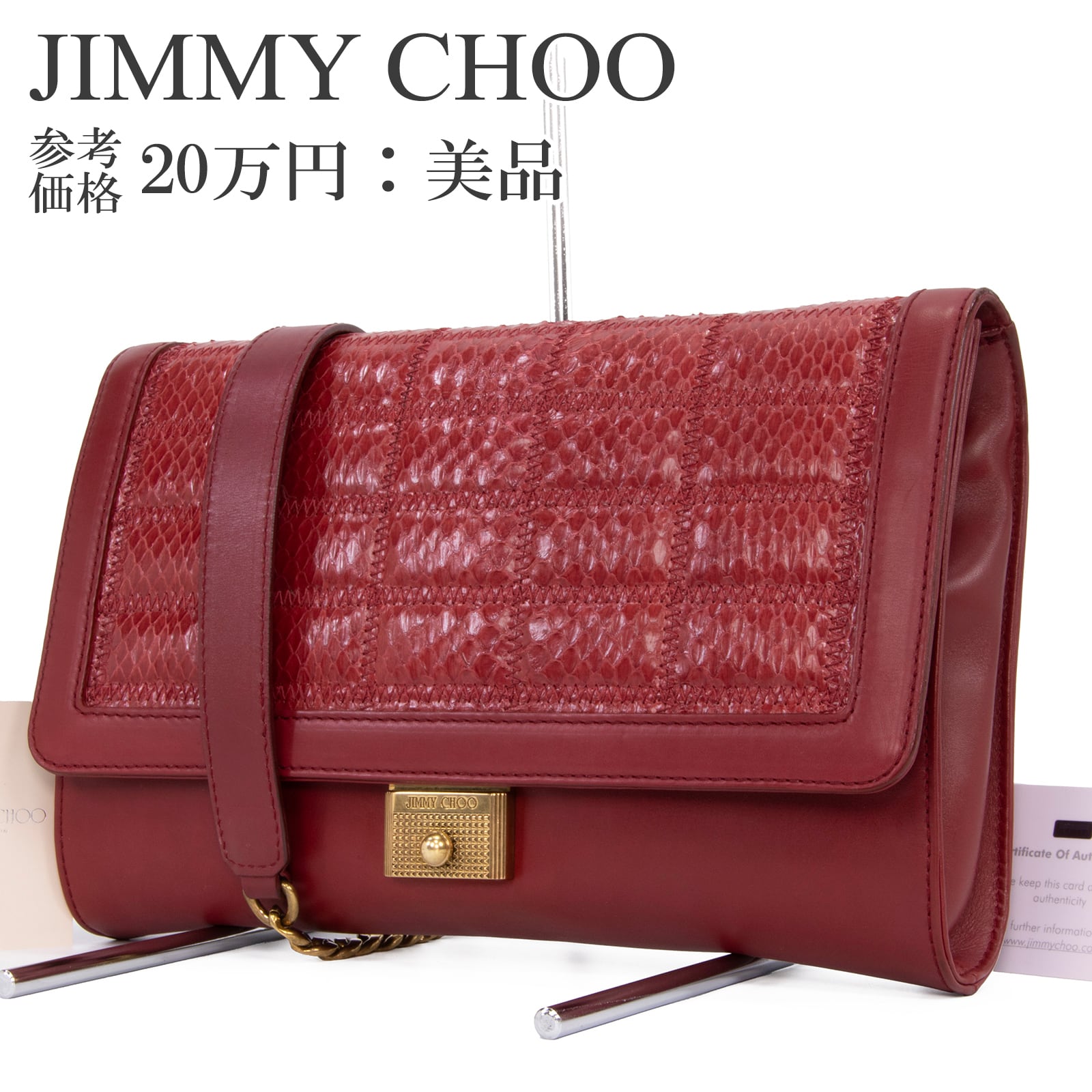 本物 送料無料 ジミーチュウ クラッチバッグ ショルダーバッグ レディース パイソン 赤 パーティーバッグ ゴールドチェーン 鞄 バック E432