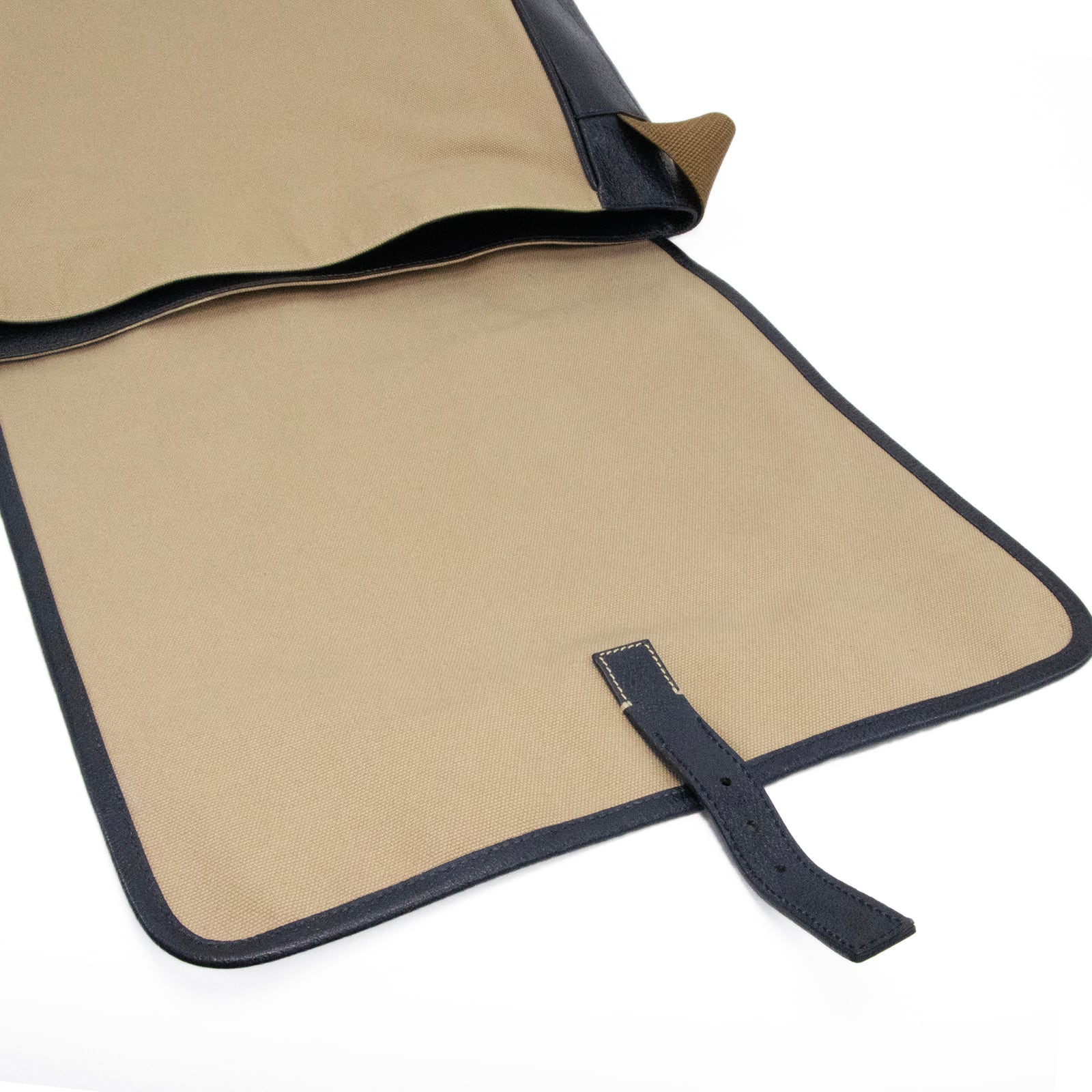 ナチュラルなベージュ系のキャンバス地に、ネイビーのピッグスキンがアクセントとなった、大変おしゃれなデザインでございます。