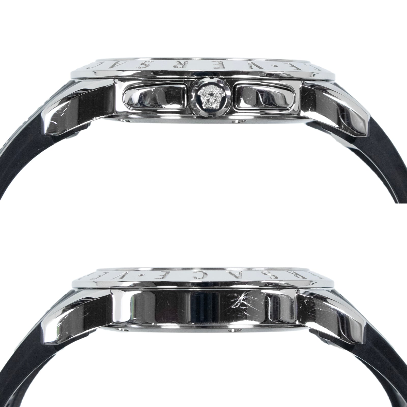 こちらはベゼルのロゴが大胆に主張する、ヴェルサーチェのVスポーツ・腕時計でございます。