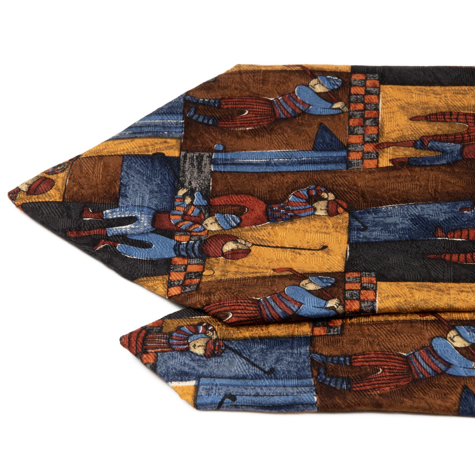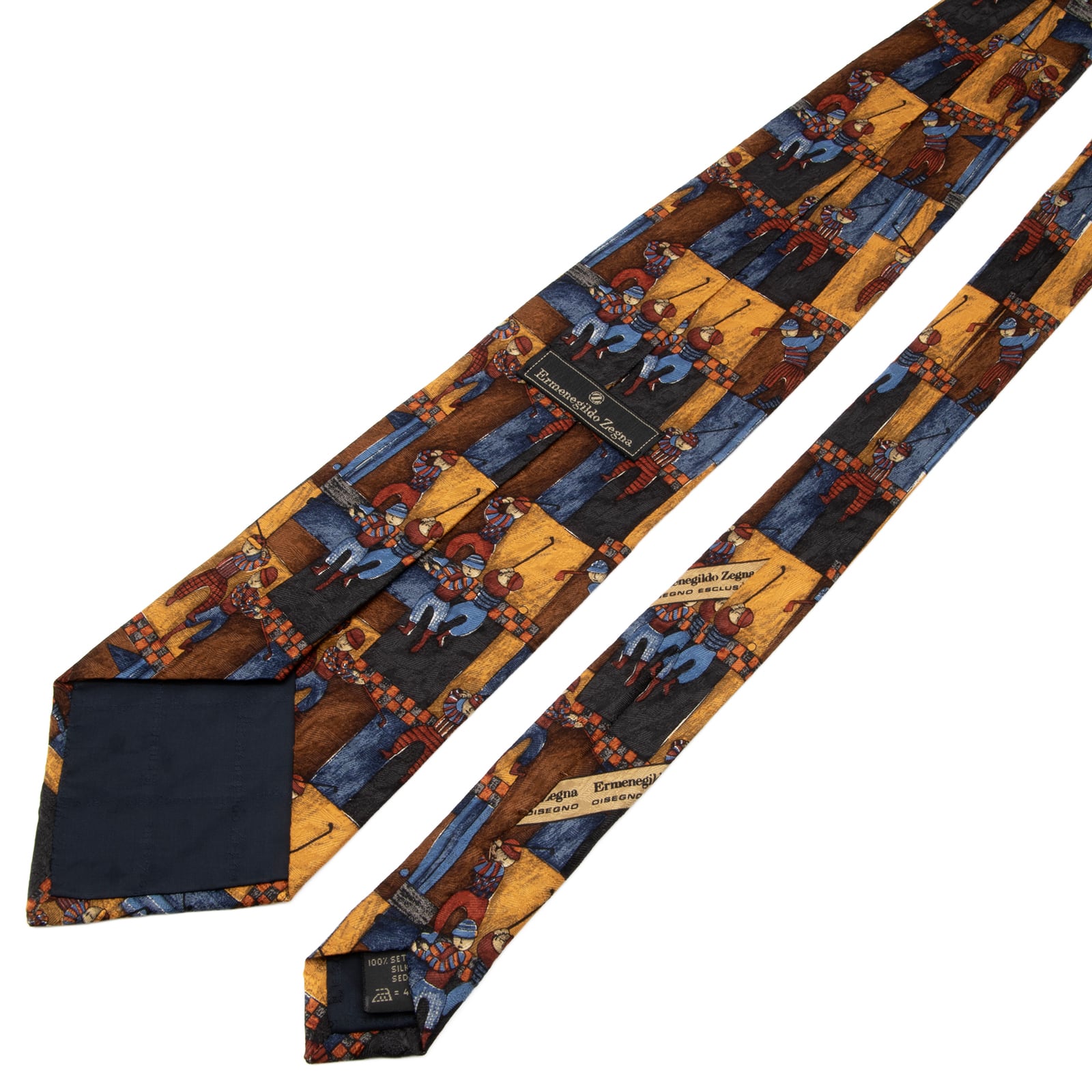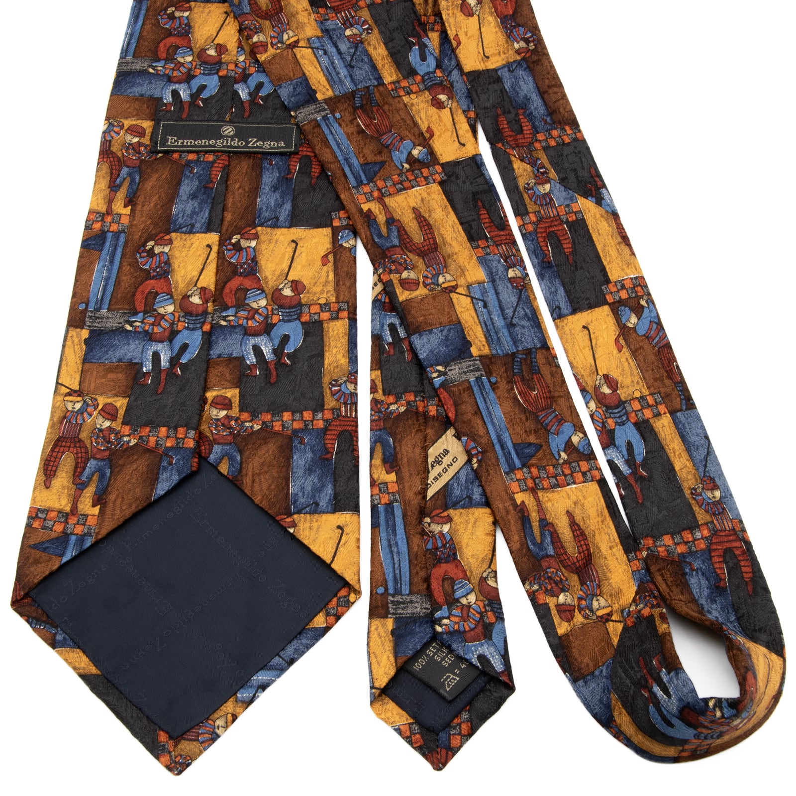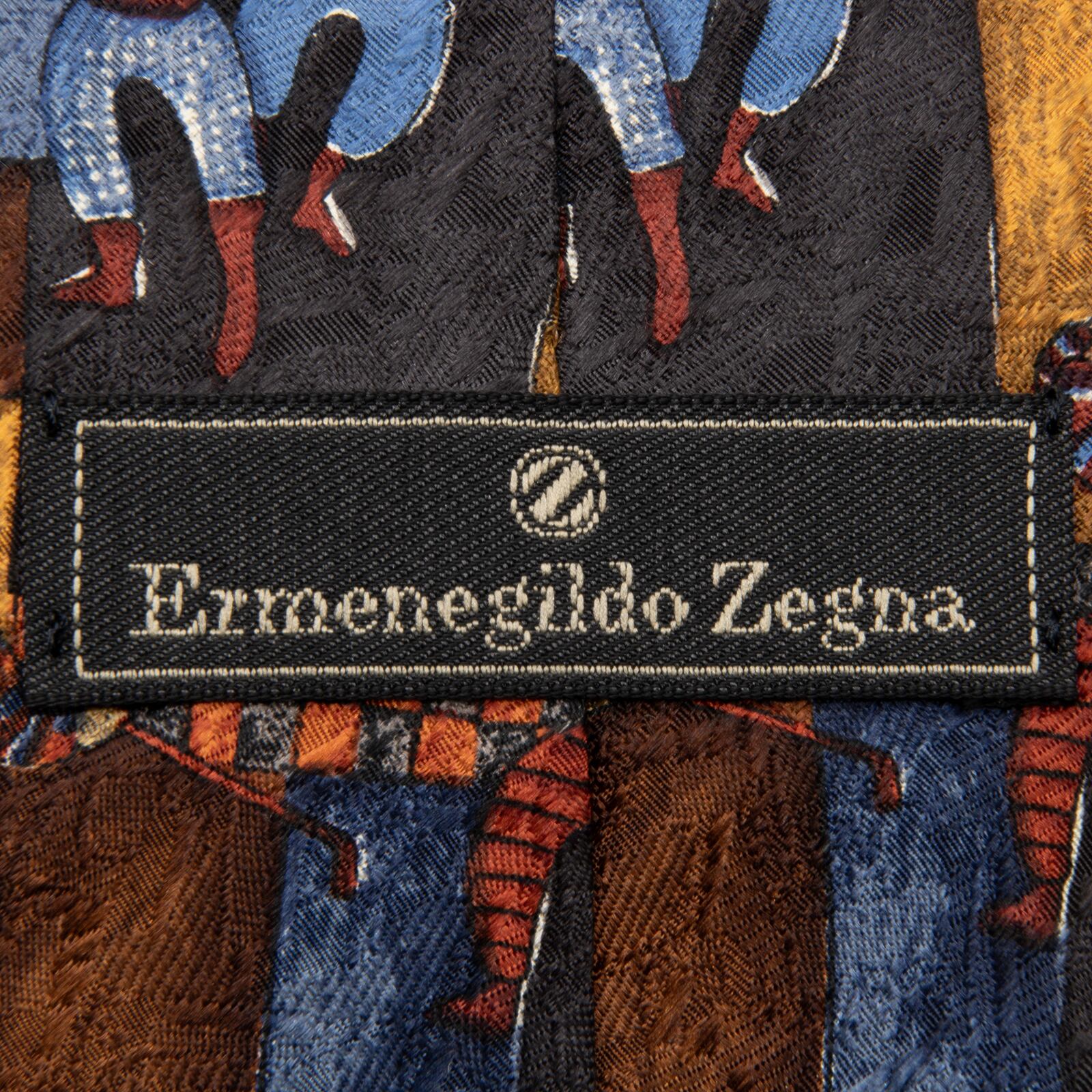 送料無料 ゼニア ネクタイ 新品同様 シルク 茶色 ブラウン オレンジ ネイビーブルー 黒 総柄 Y2K 00s ゴルファー ブランド イタリア製 P563