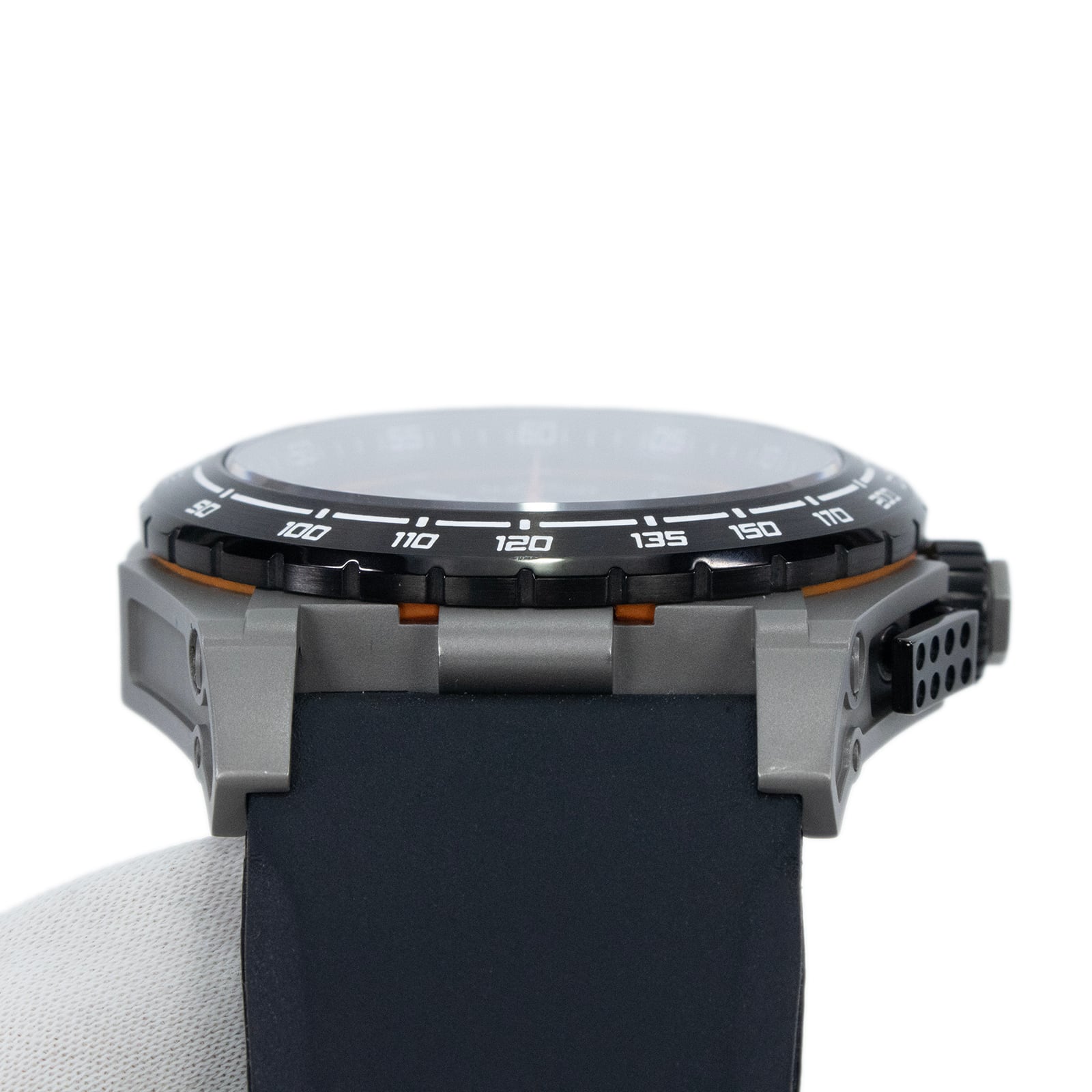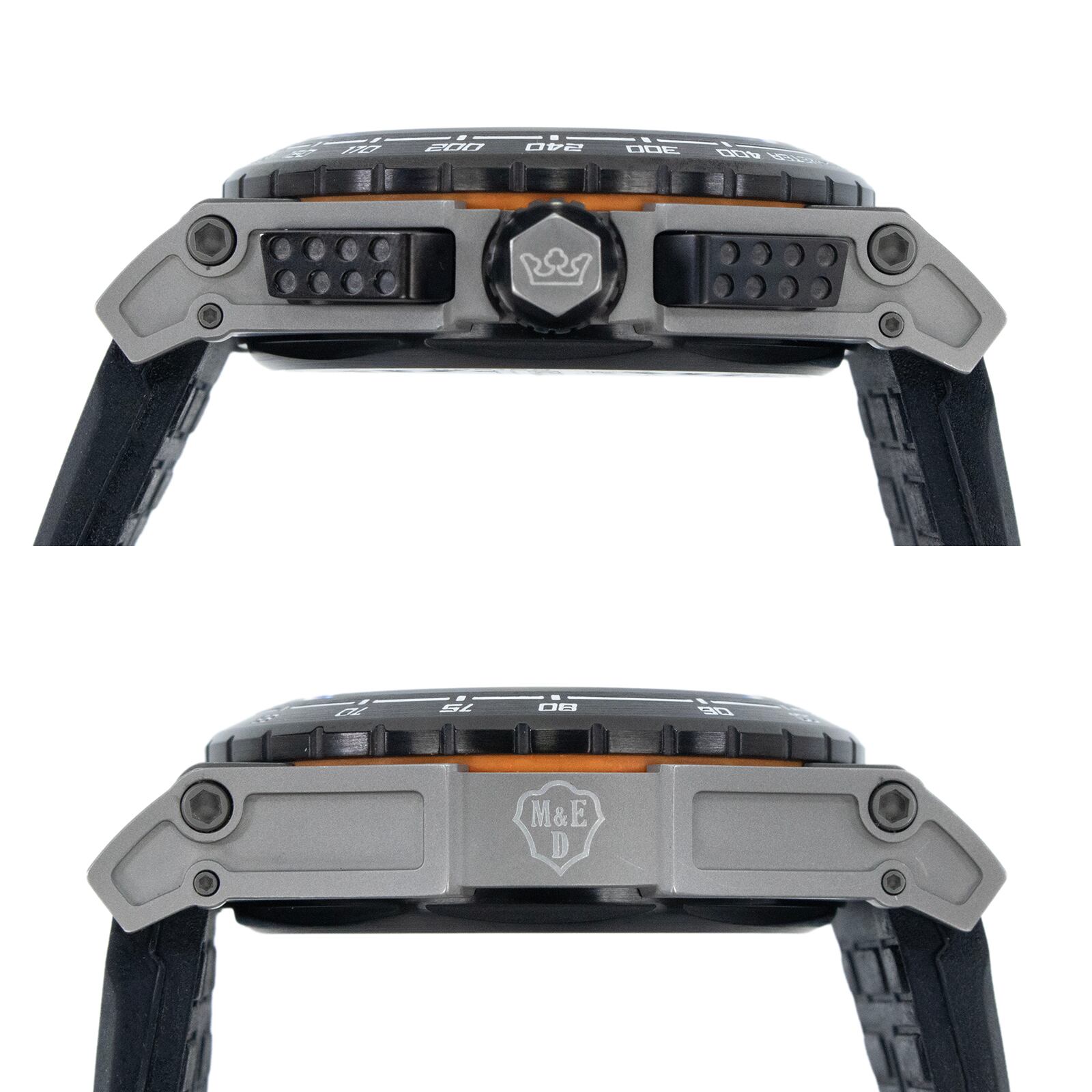 43.2mmの重厚なケースに刻まれたタキメーターと、ブラックに映えるオレンジのアクセントが、レーストラックの熱気をダイレクトに伝えます。