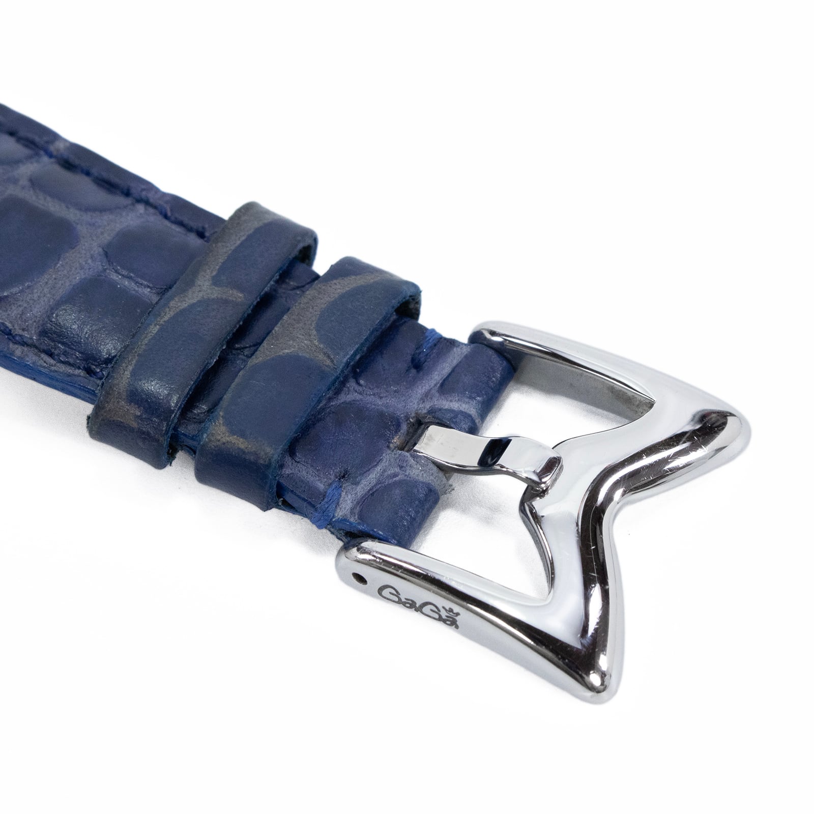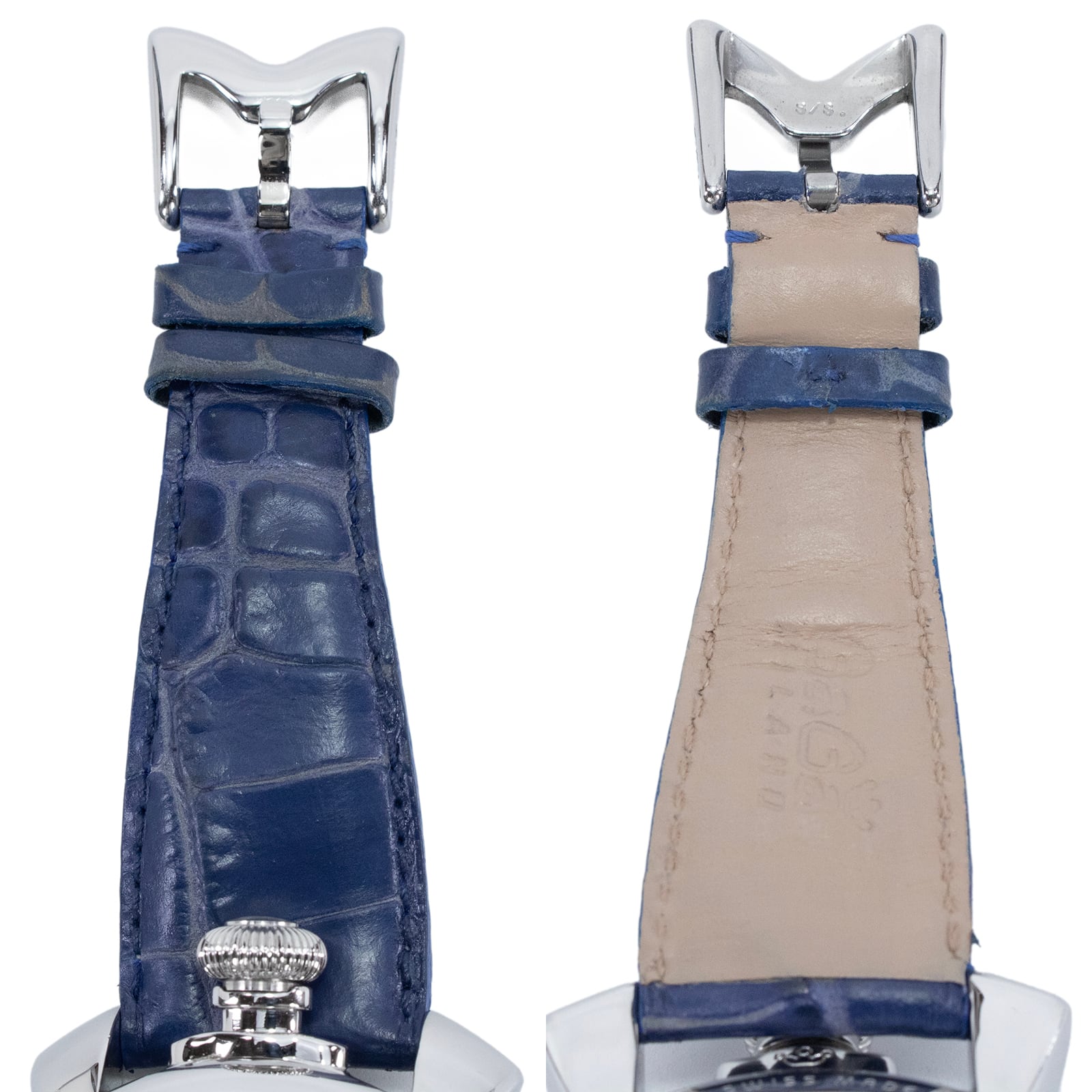 ブルーのクロコダイル型押しレザーが、カラフルなフェイスを知的に引き締めました。