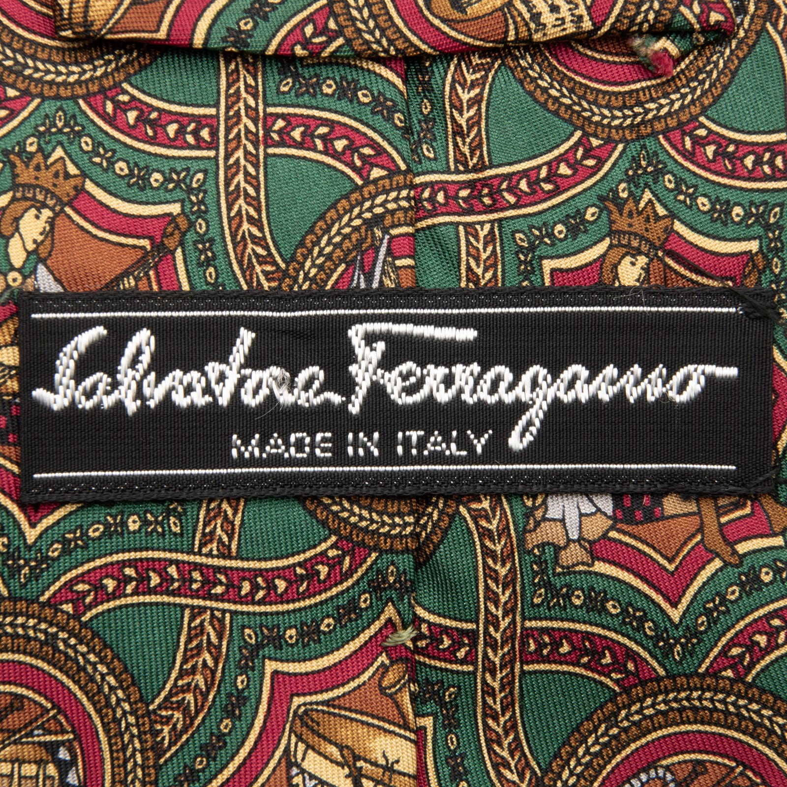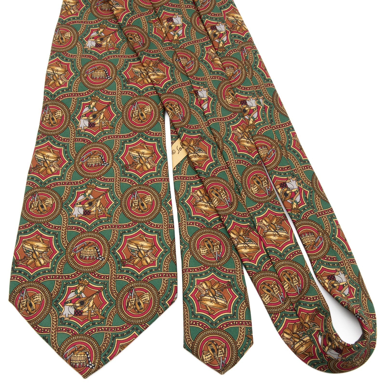 送料無料 フェラガモ ネクタイ 新品同様 シルク 緑 グリーン 赤 茶色 ベージュ 総柄 Y2K 00s 楽器 民族音楽 ハイブランド イタリア製 P796