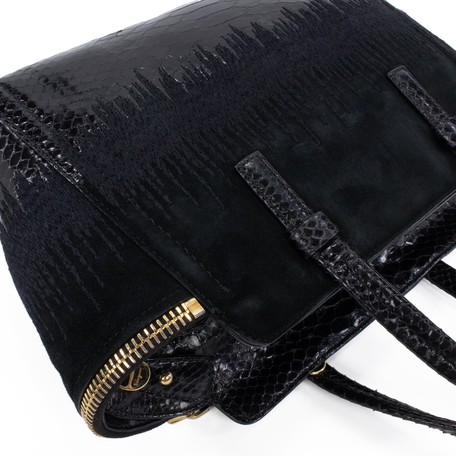 こちらは、蛇の本革とスエードが奏でる繊細な陰影が美しさを引き立てる、フェラガモのアリアナ・ハンドバッグでございます。