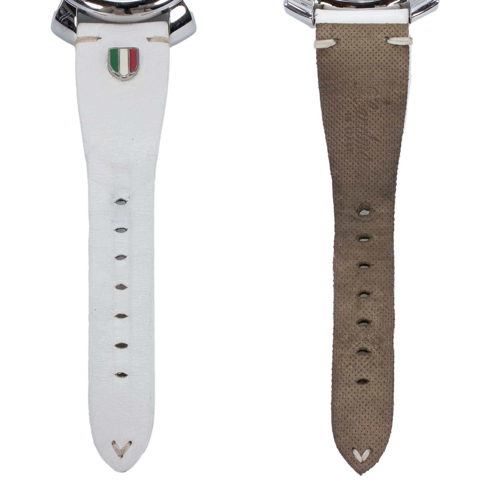 イタリア国旗を模したトリコローレカラーが、ホワイトの文字盤上で鮮やかに躍動します。