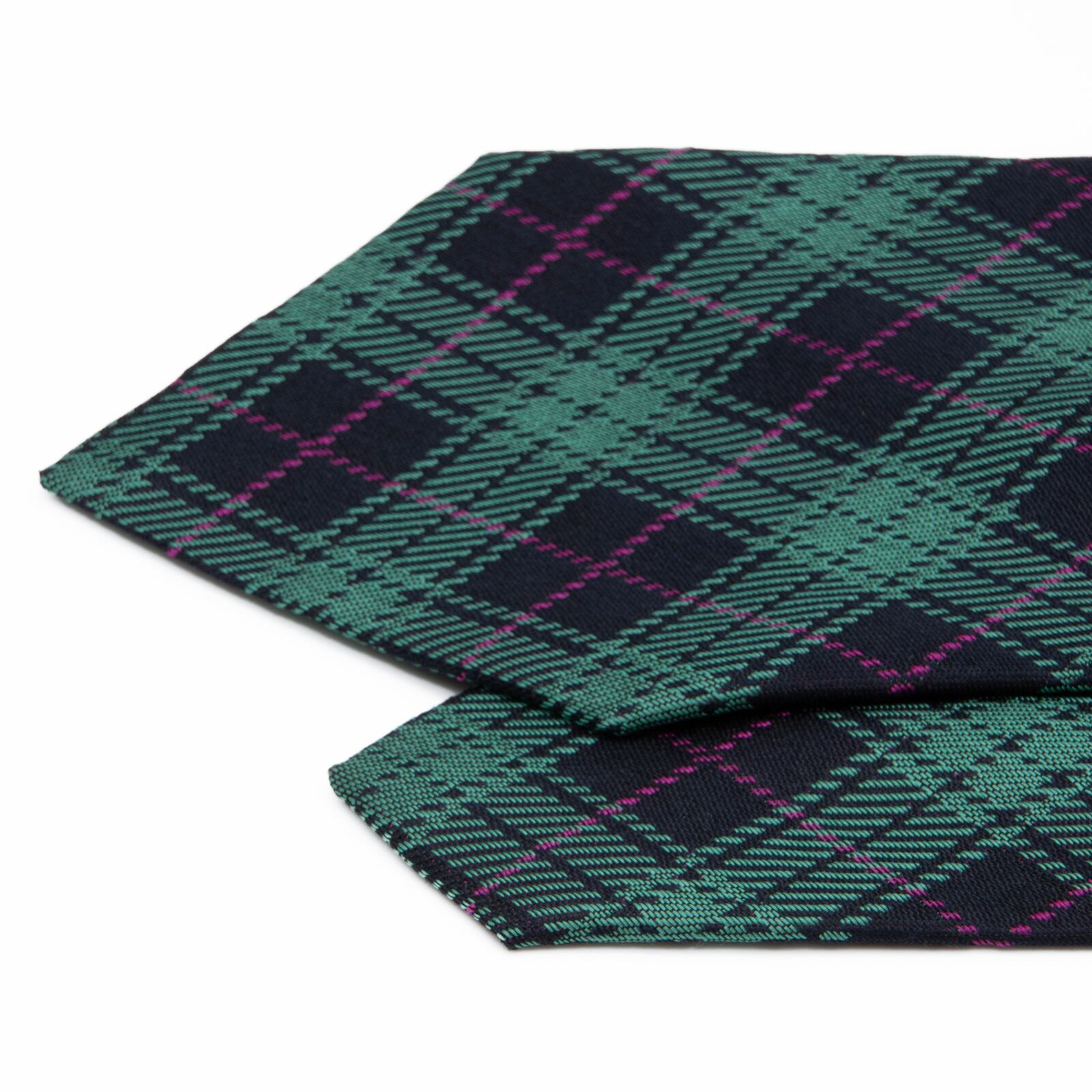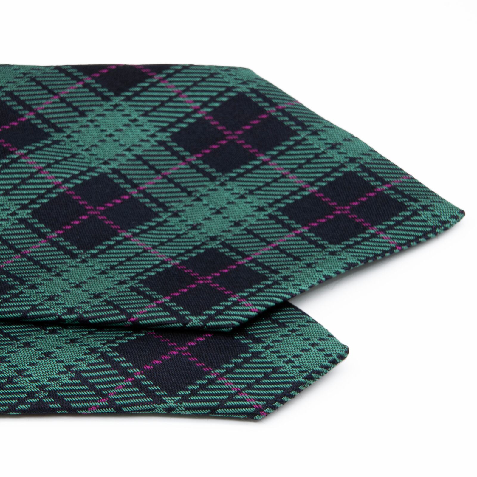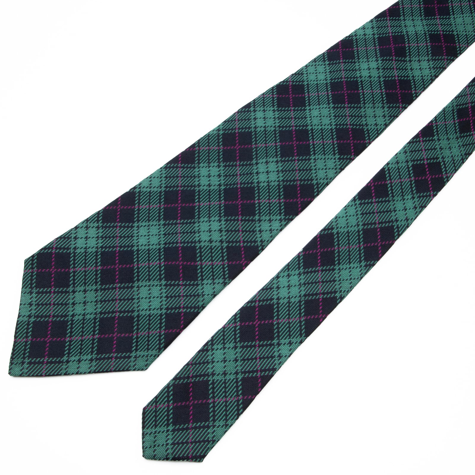 グリーン系をベースに、ブラックやパープルのラインが交差する知的なチェック柄です。