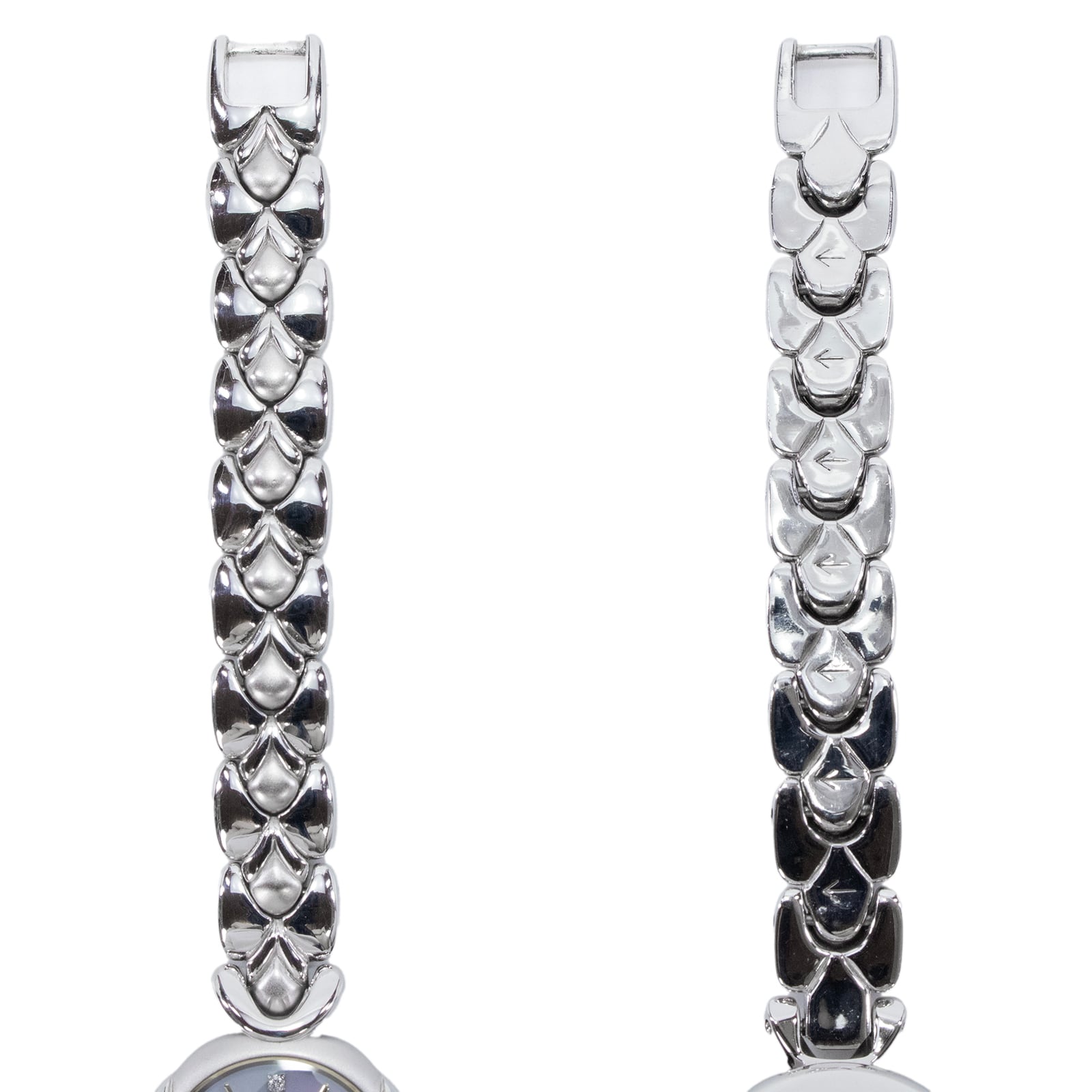 見る角度によってブルーやピンクに輝くシェル文字盤が、幻想的な美しさを放ちます。