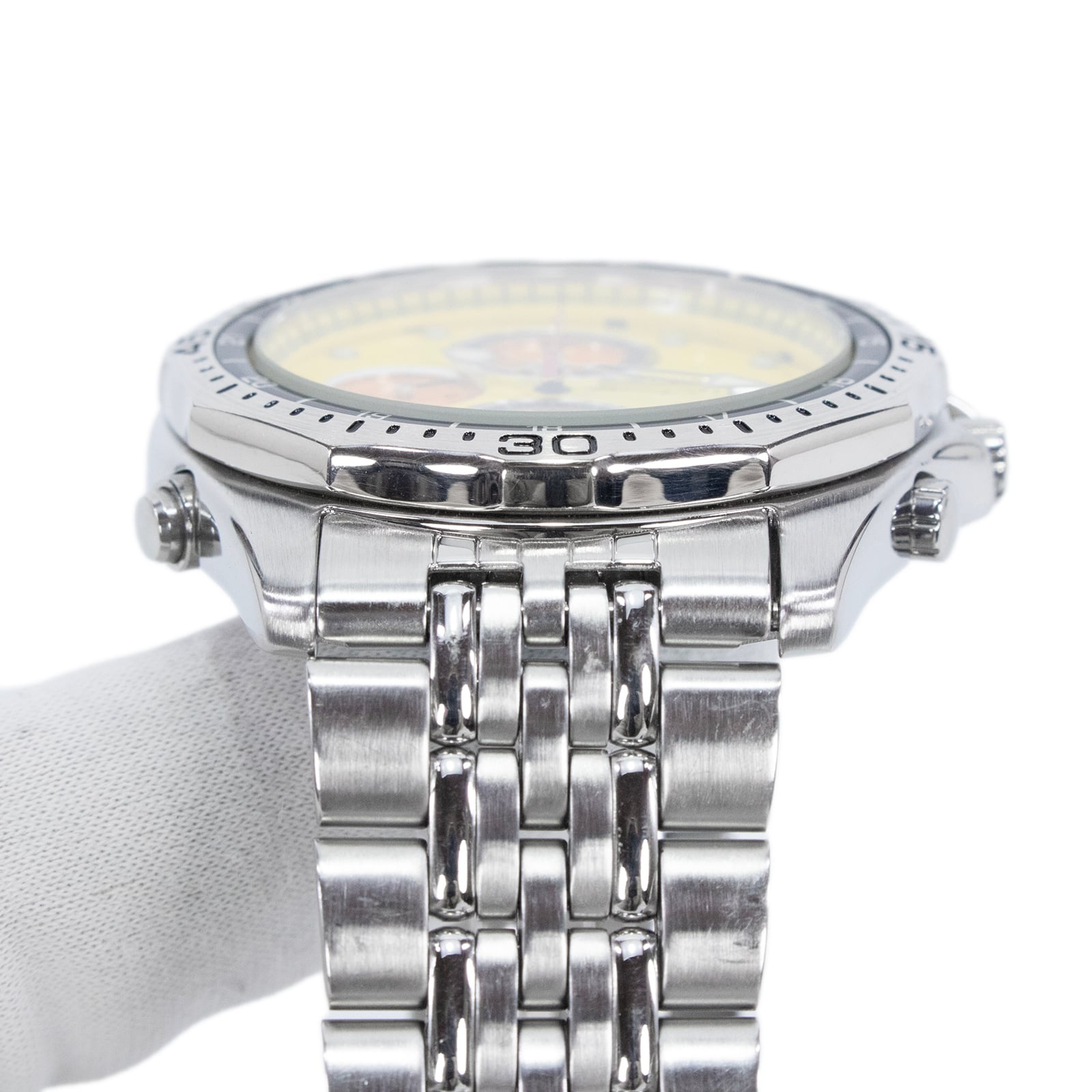 鮮やかなイエローの文字盤が、スポーティでエネルギッシュな印象を与えます。