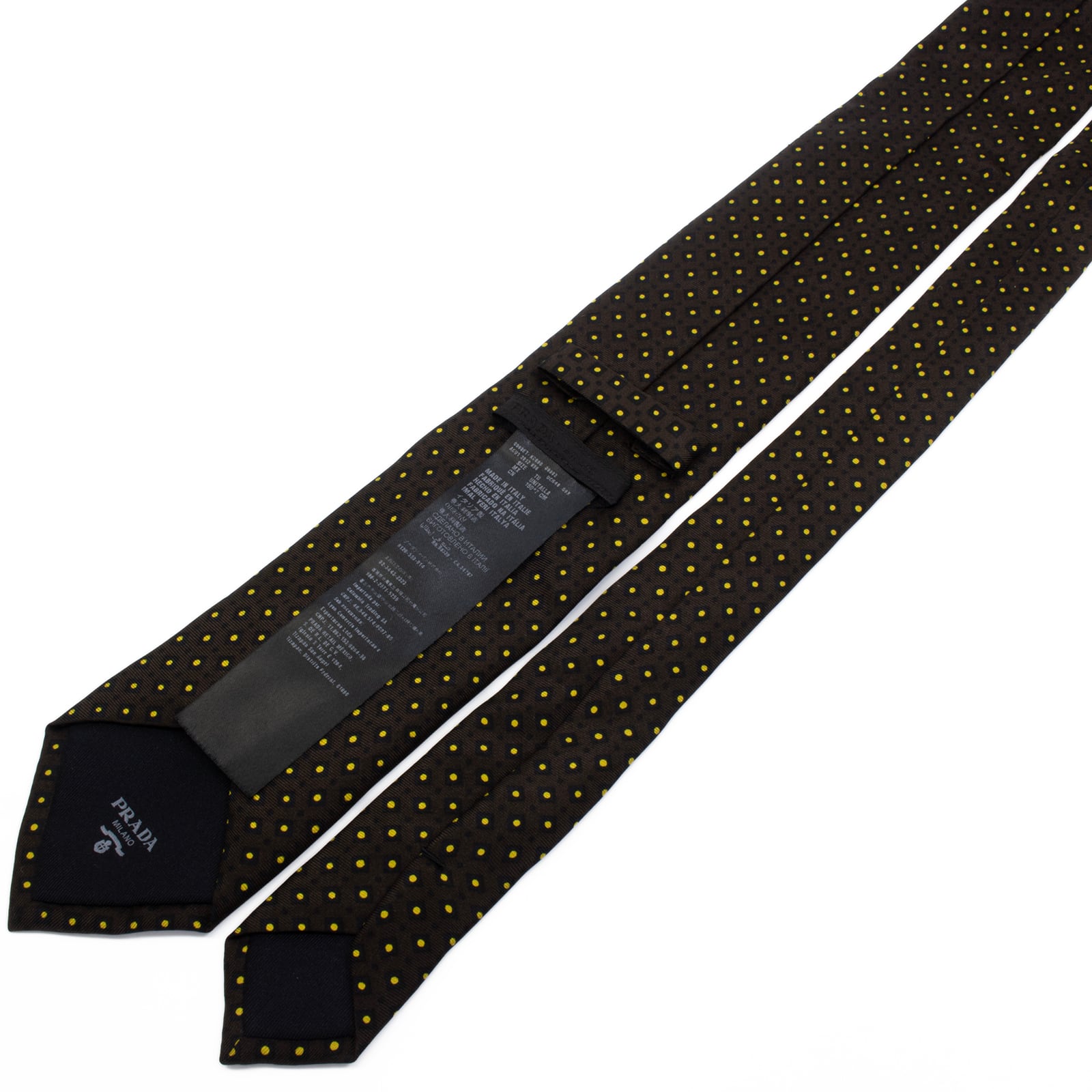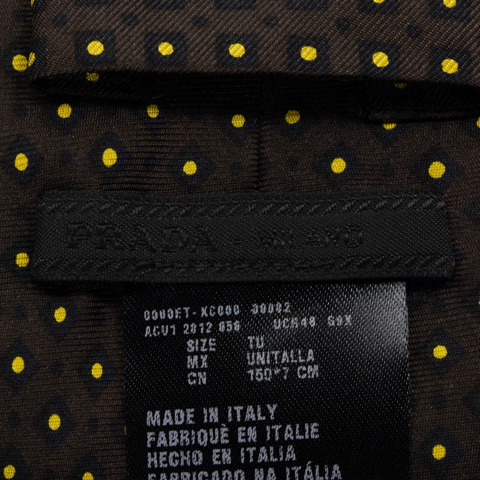 送料無料 プラダ ネクタイ レギュラータイ シルク 焦げ茶色 ダークブラウン 黒 黄色 ドット 総柄 四角 ハイブランド イタリア製 綺麗 S552