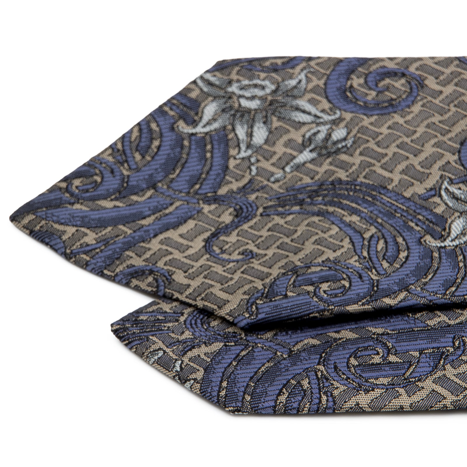 こちらは、メタリックグレーに青い花が幻想的に咲く、レノマのネクタイでございます。