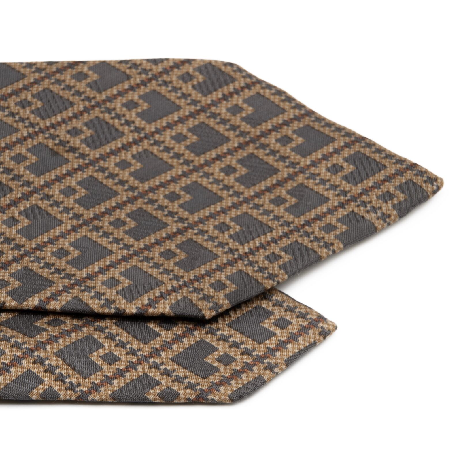 グレーとブラウンが織りなす繊細なスクエア柄は、知的でモダンな大人の雰囲気を醸し出しております。