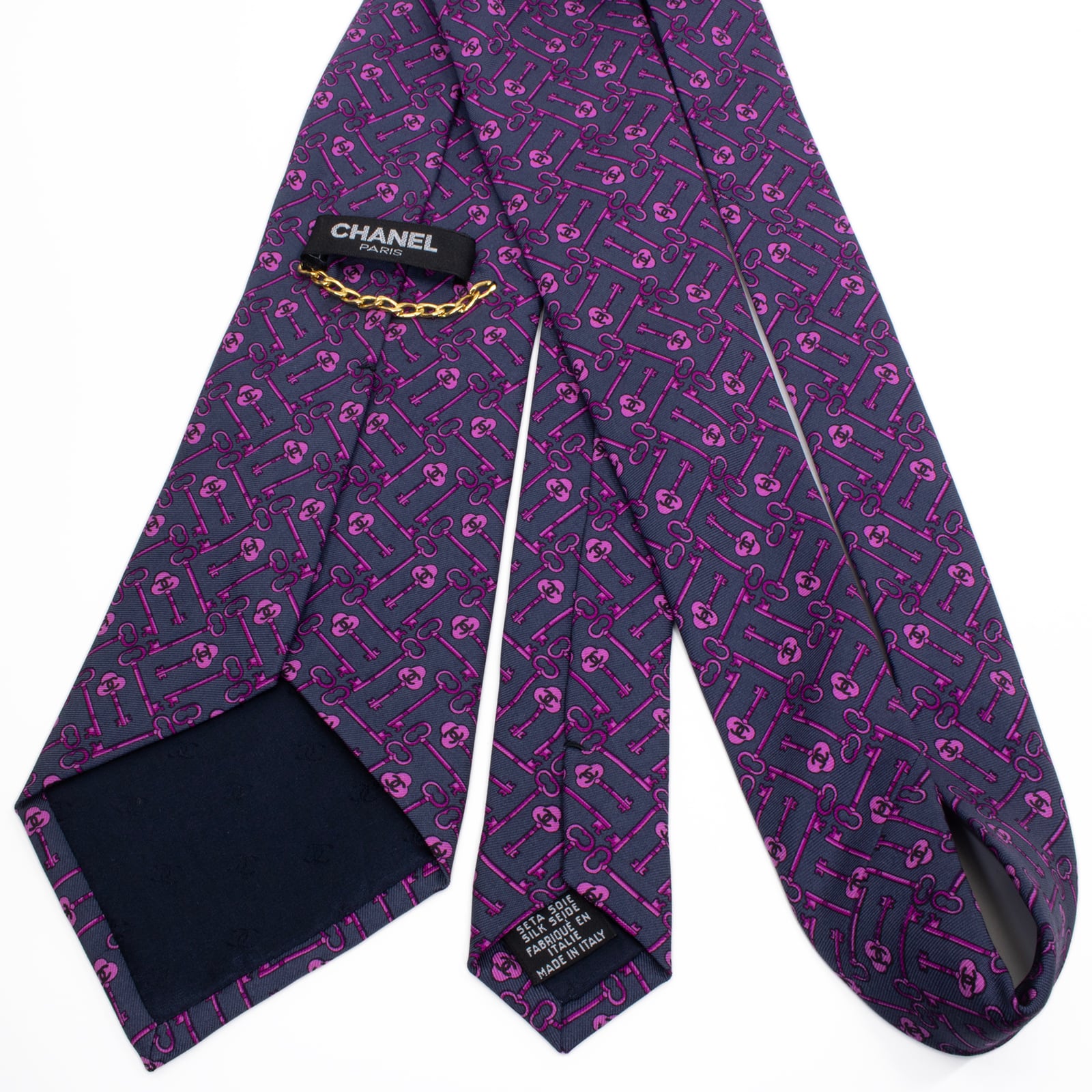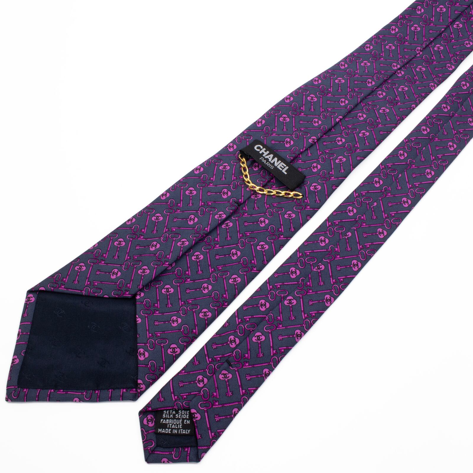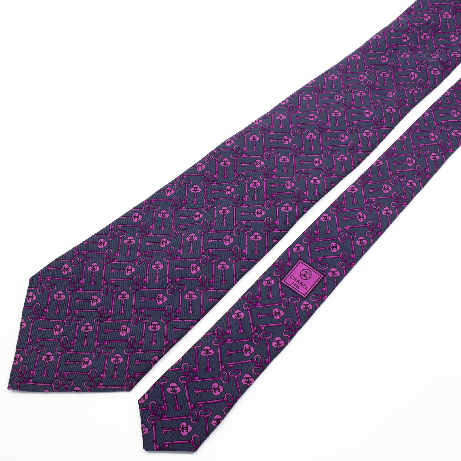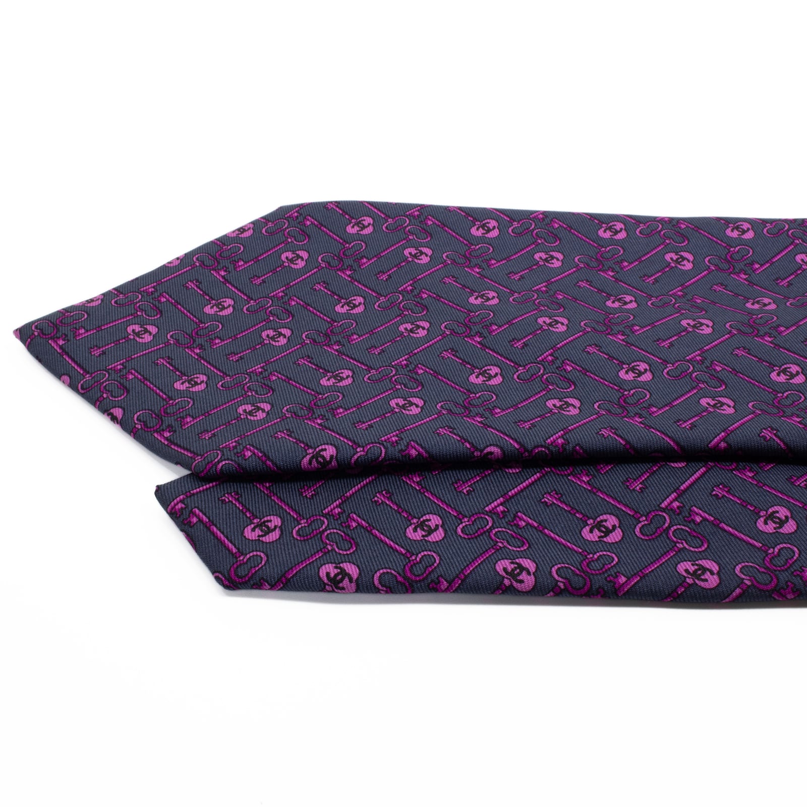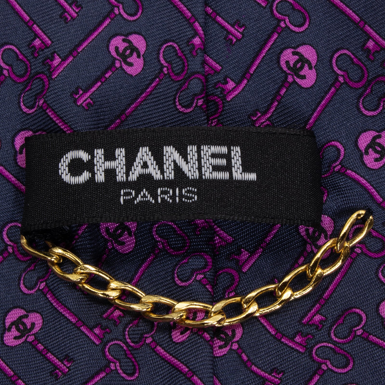 新品同様 送料無料 シャネル ネクタイ ネイビーブルー 紫 黒 総柄 ロゴ ココマーク 鍵 キー ゴールドチェーン ハイブランド イタリア S571