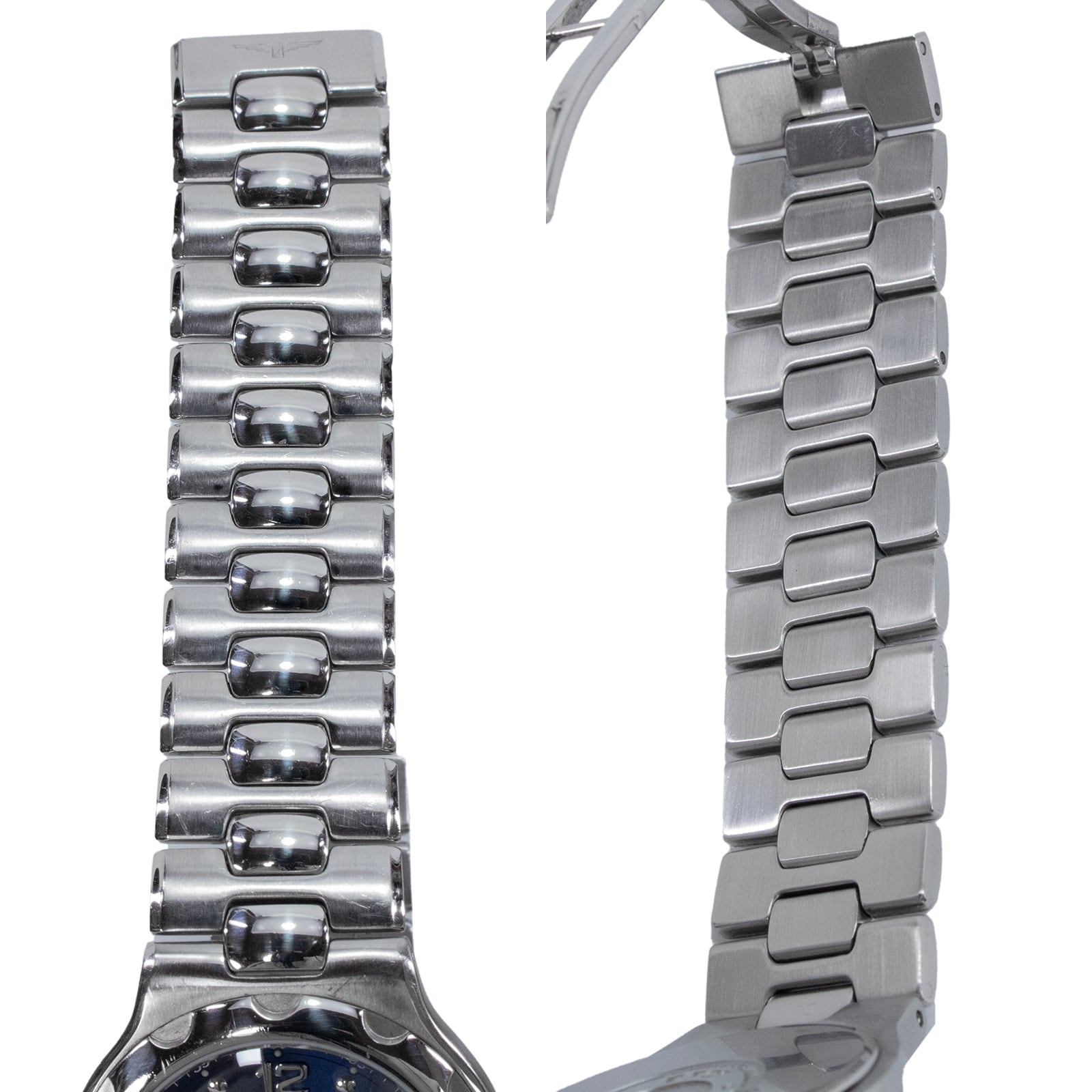 深みのある青色の文字盤は、光の当たり方で様々な表情を見せ、手元に高級感を漂わせます。