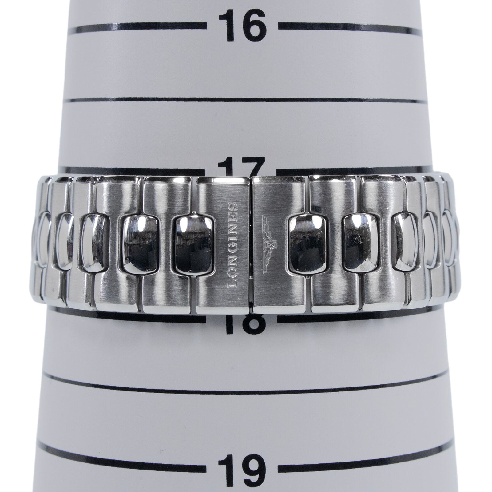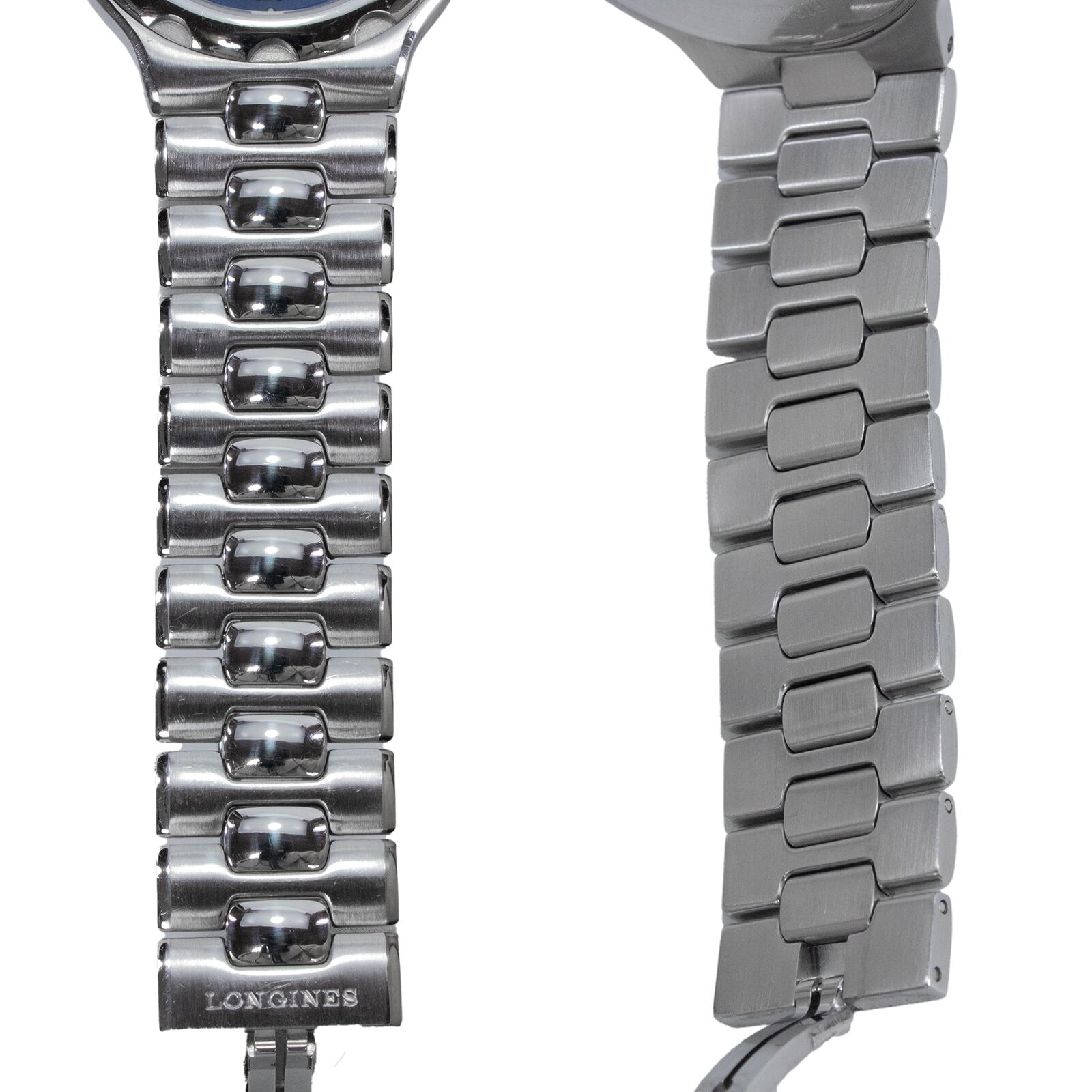 こちらは、メタリックブルーの輝きが知的な印象を与える、ロンジンの腕時計でございます。