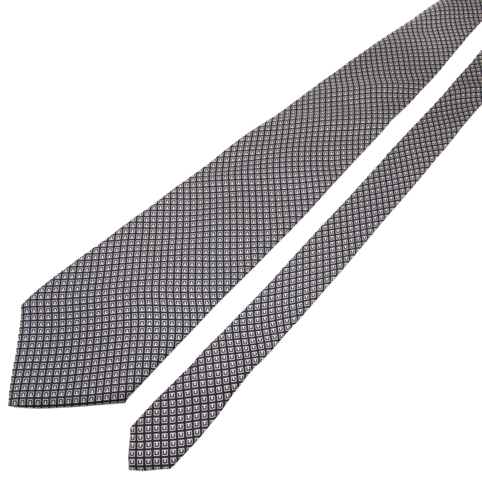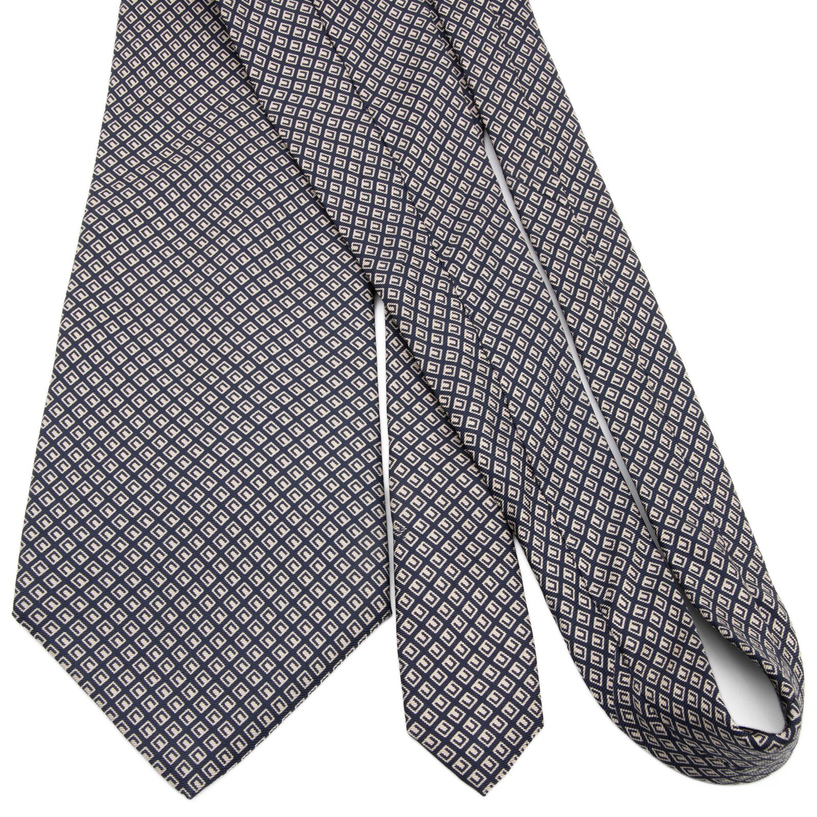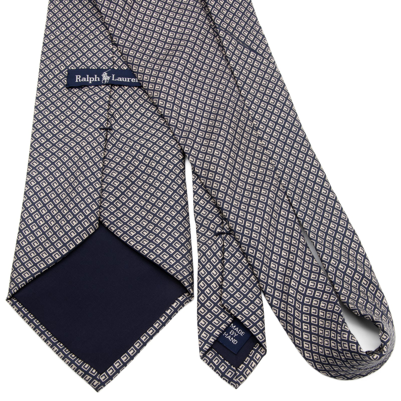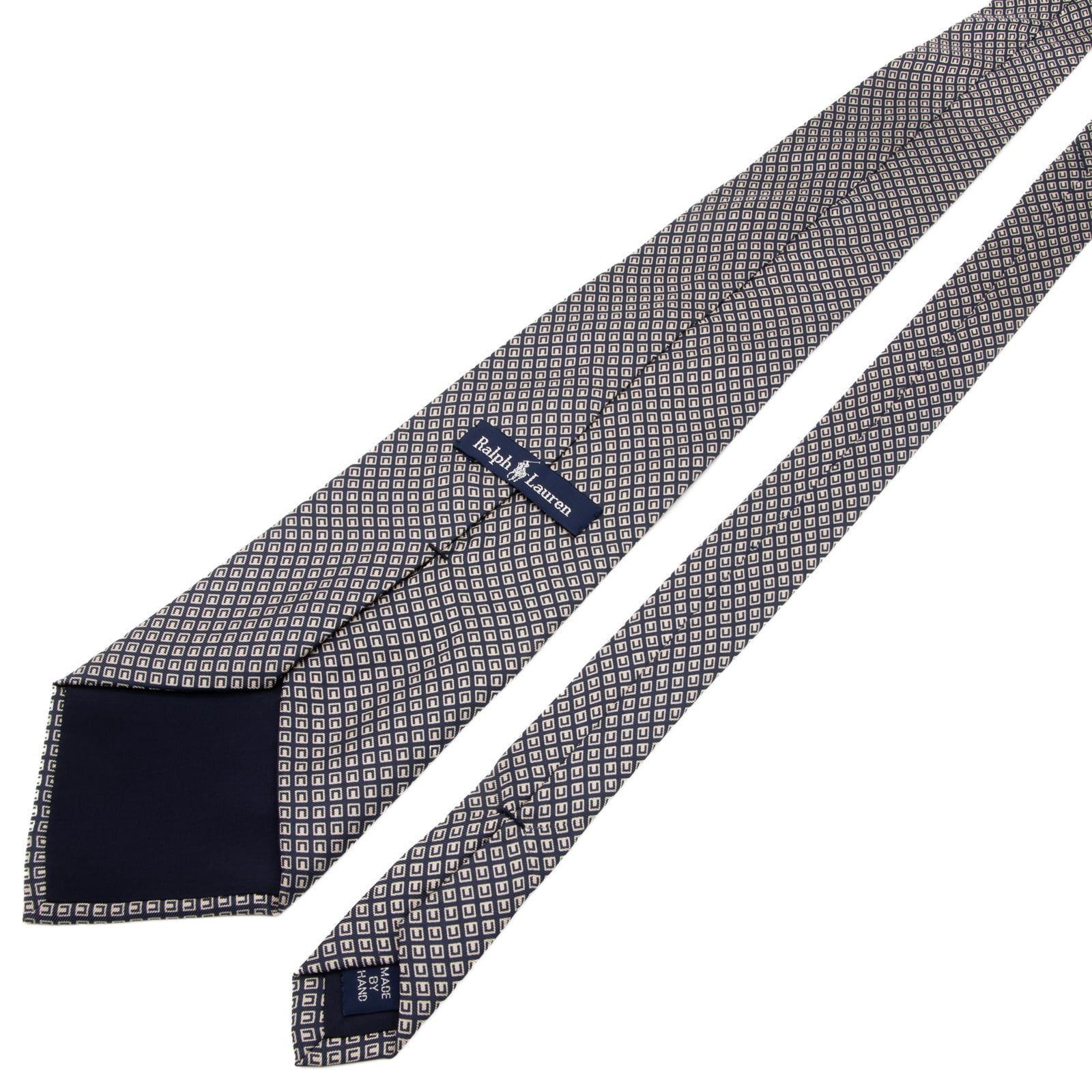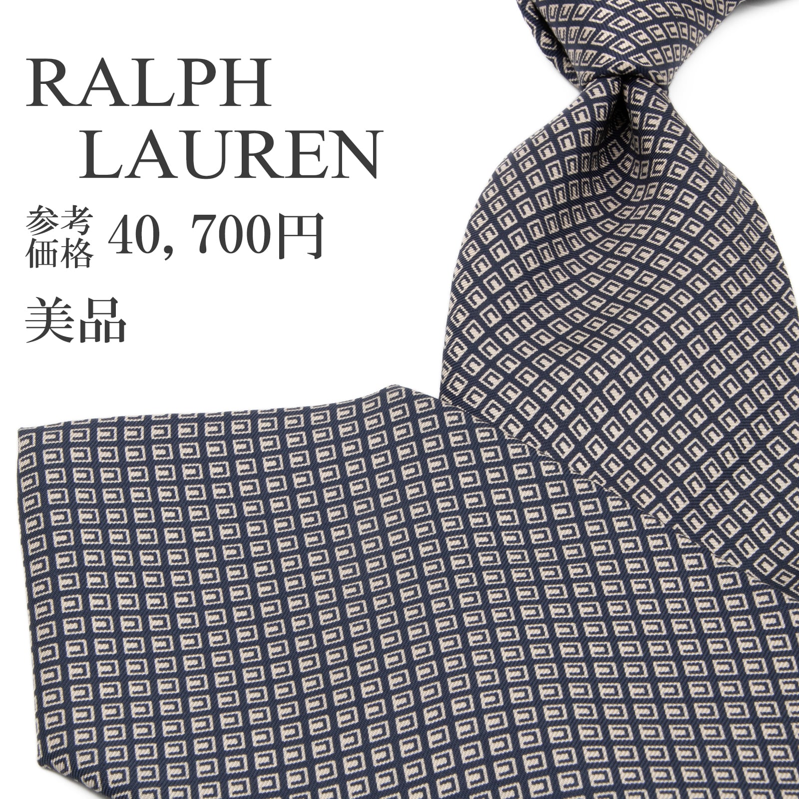 こちらは、幾何学的なスクエア模様が知性を演出する、ラルフローレンのネクタイでございます。