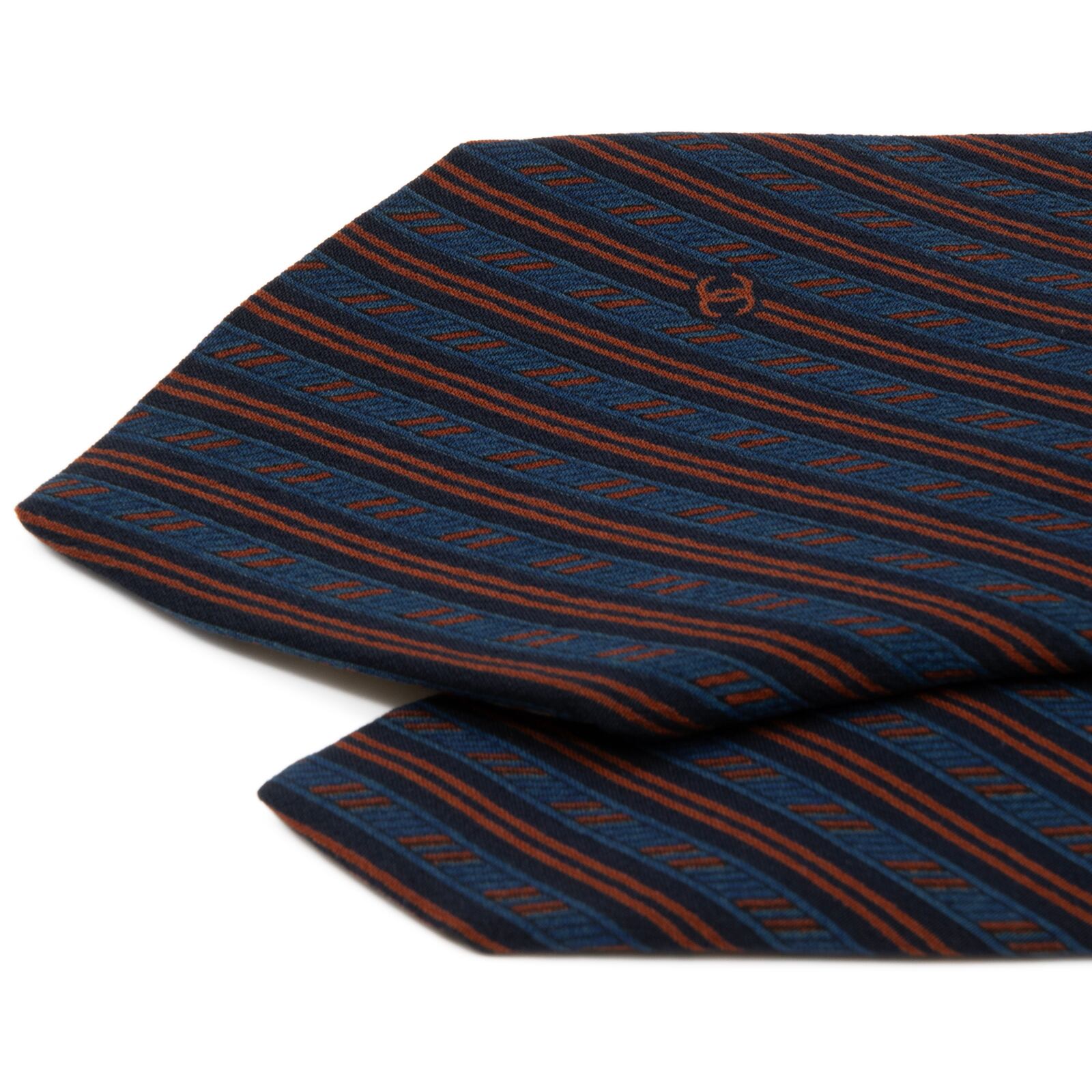 こちらは、ブルーとブラウンの配色が粋な「アズーロ・エ・マローネ」を体現した、シャネルのネクタイでございます。