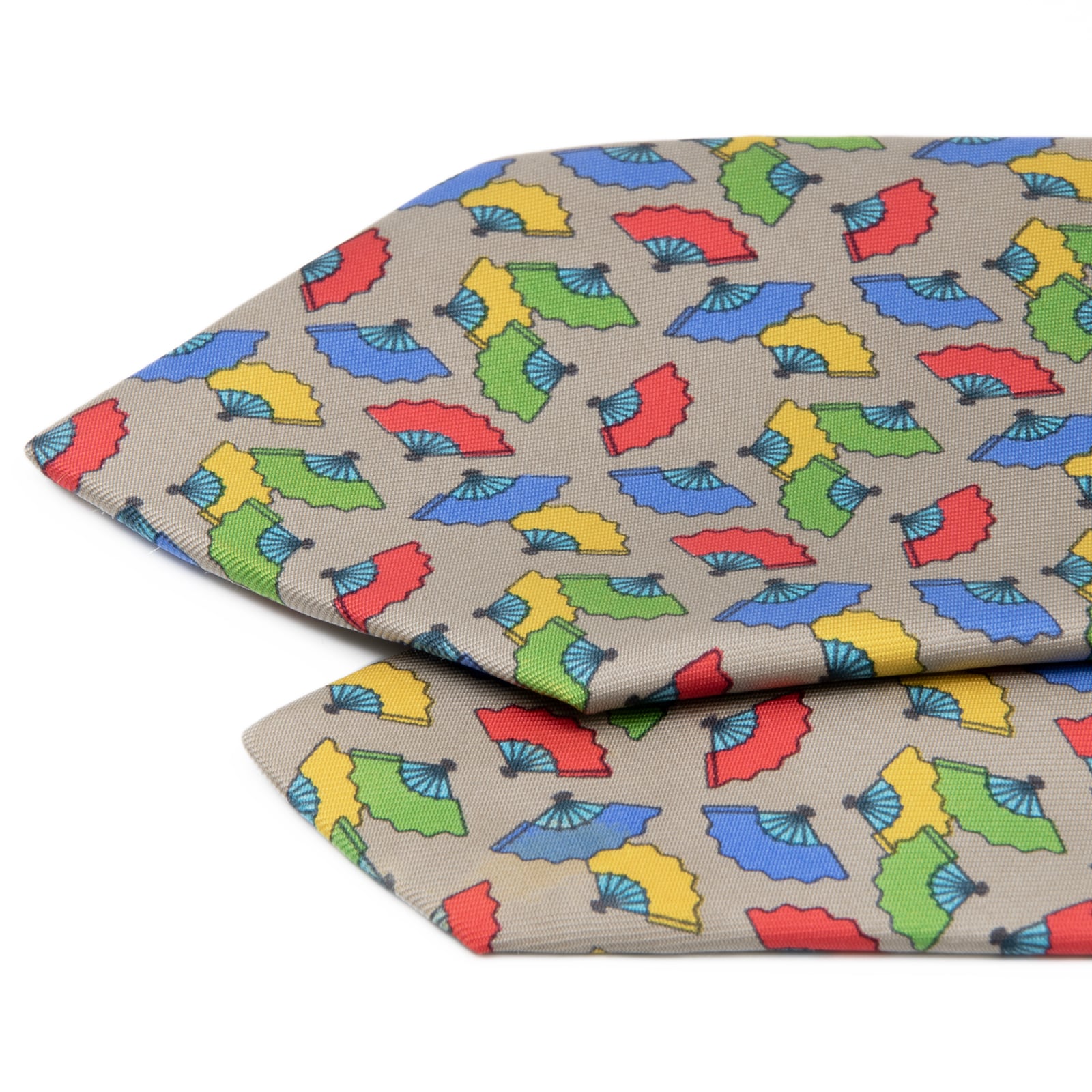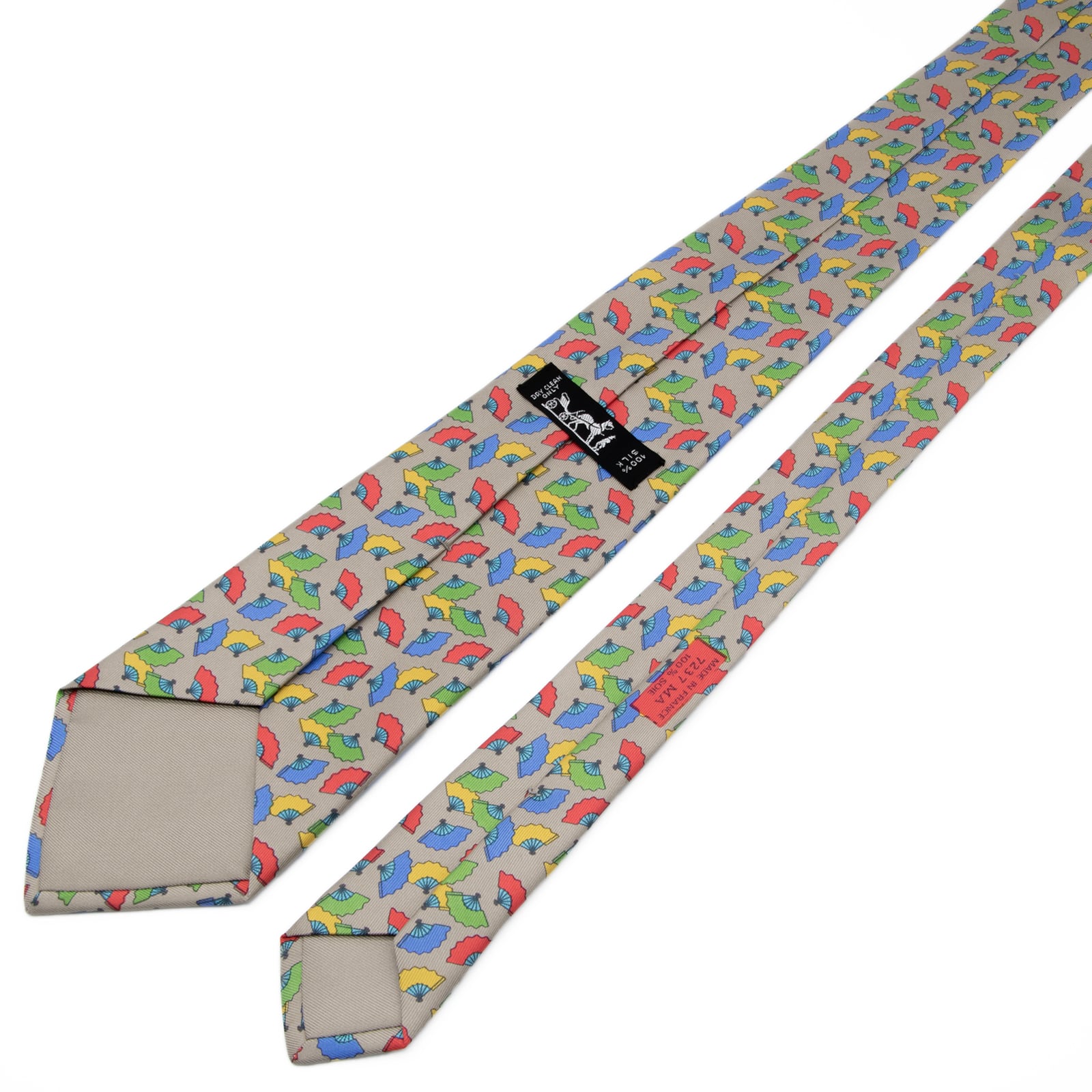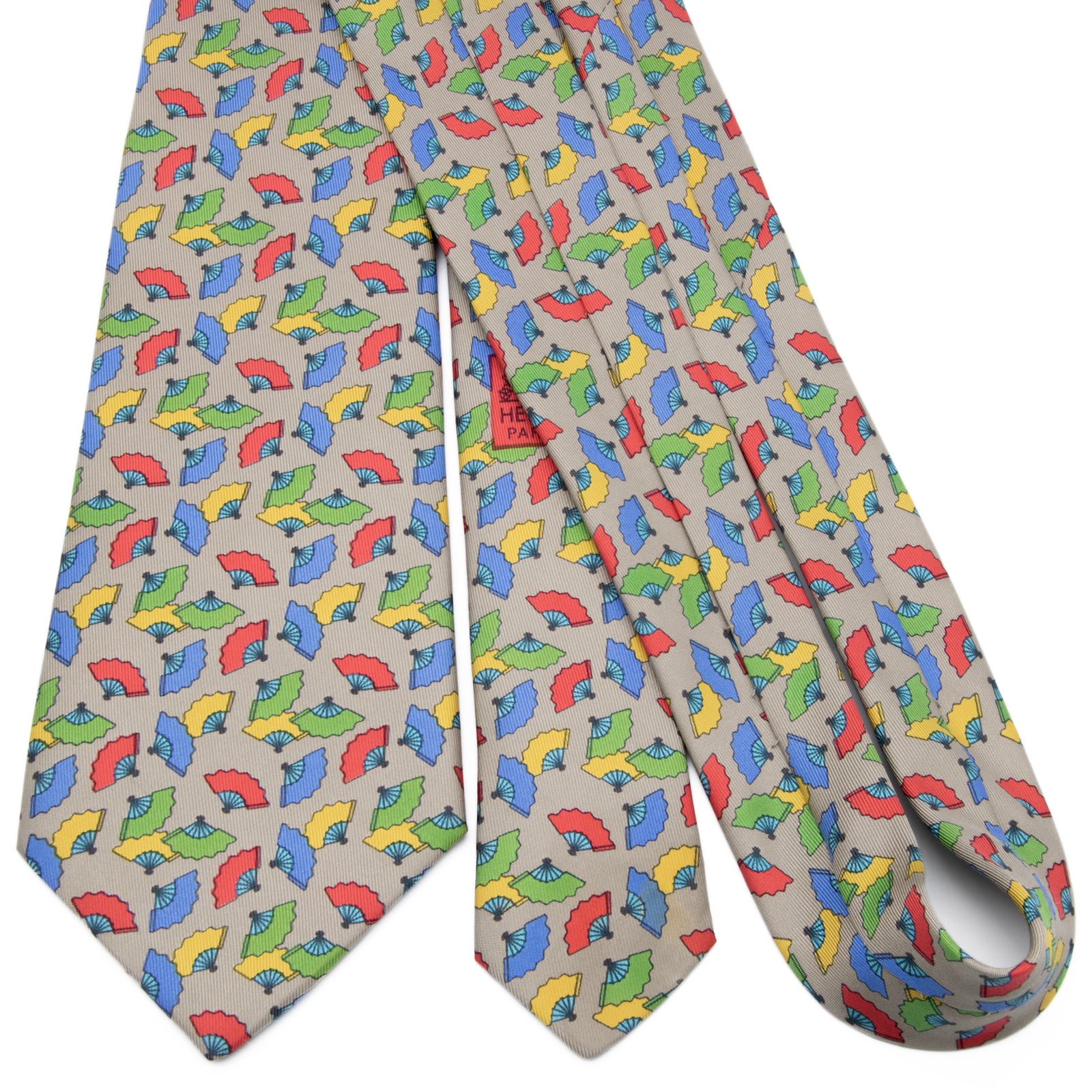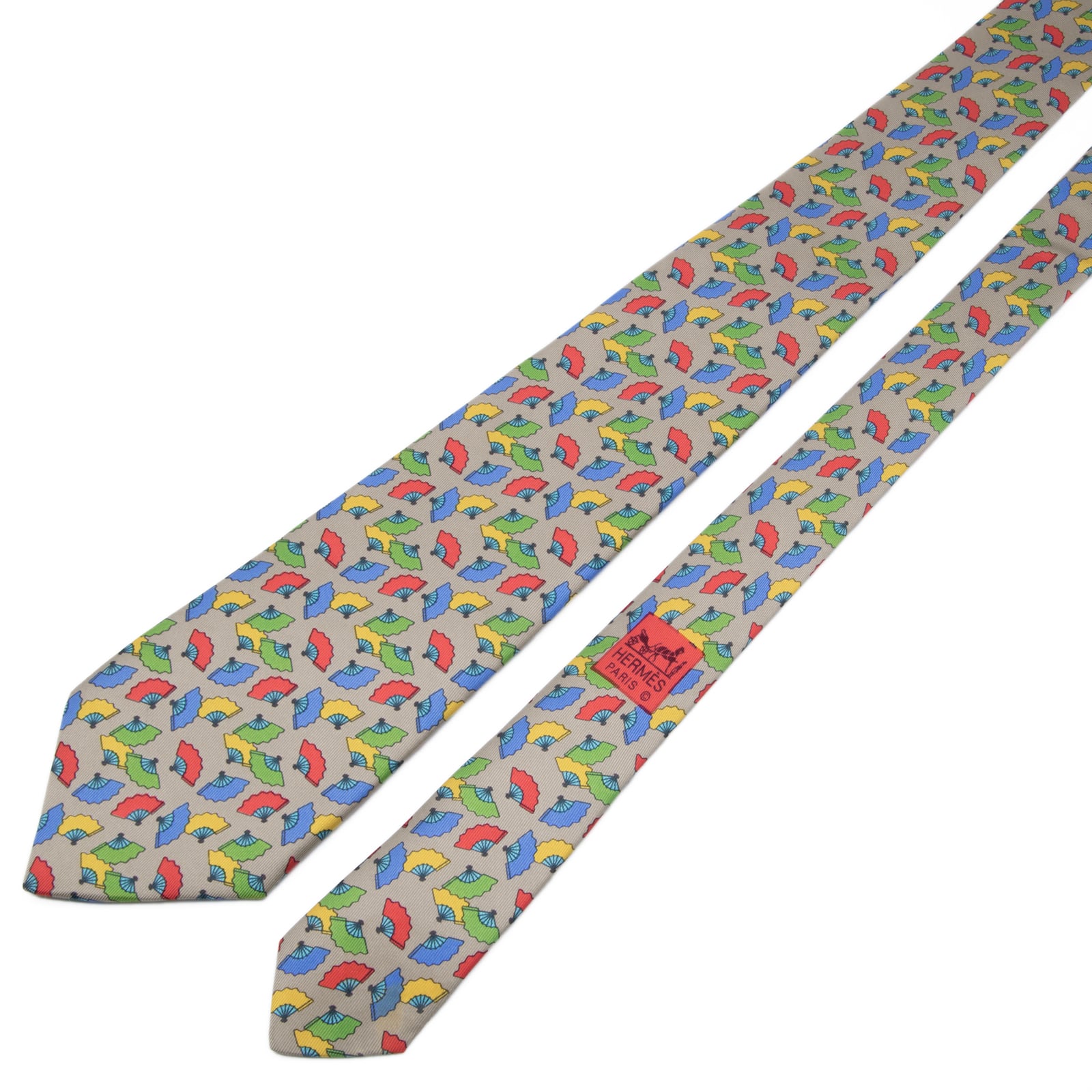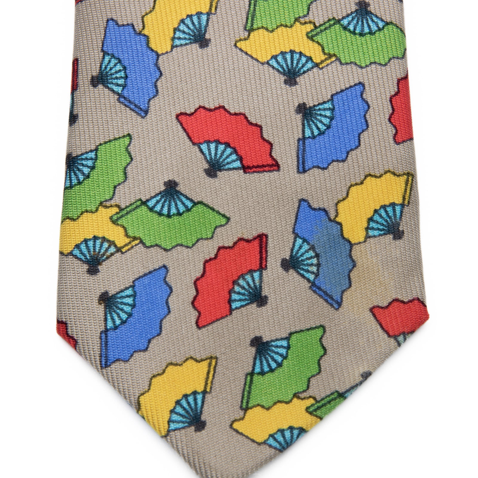 送料無料 エルメス ネクタイ レギュラータイ ベージュ 青 ブルー 緑 赤 黄色 総柄 Y2K 扇子 和風 ハイブランド 珍しい フランス 綺麗 P794