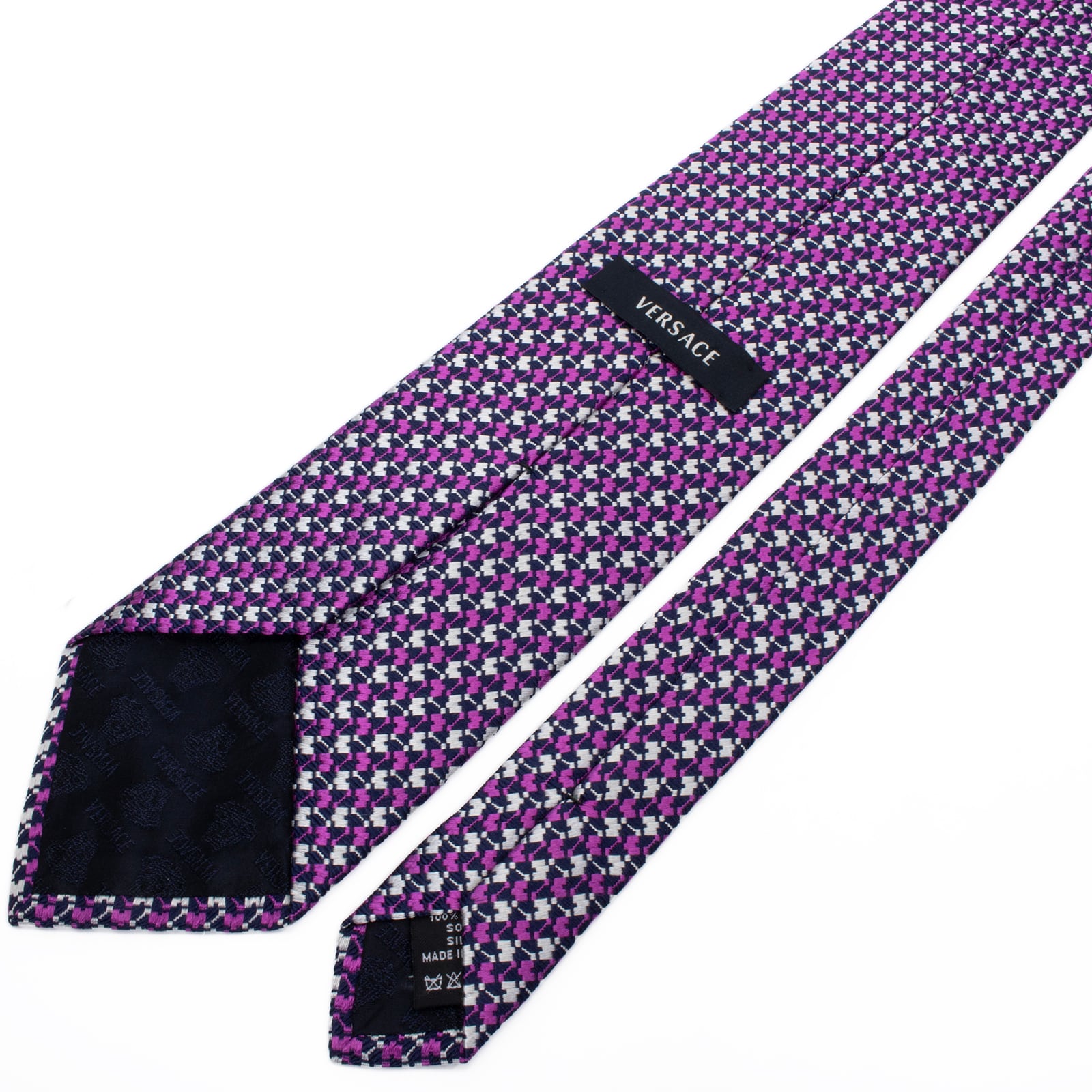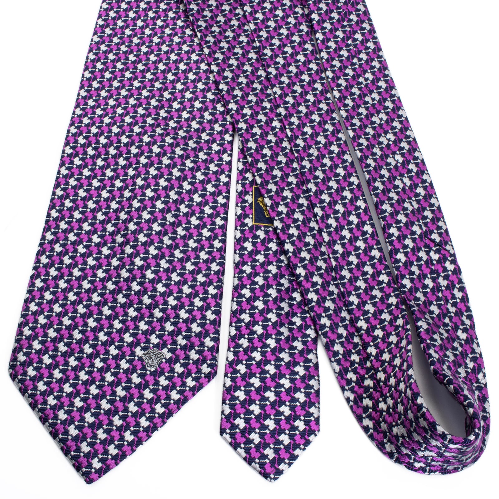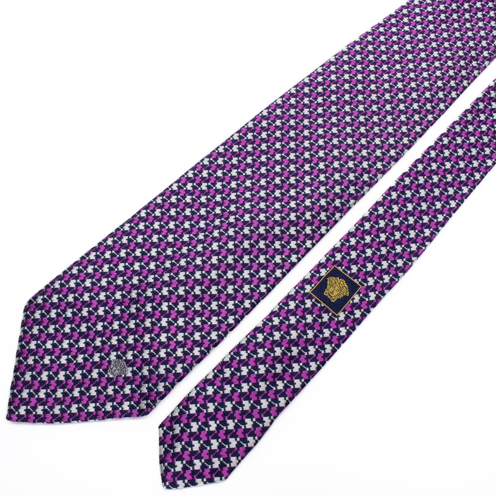 新品同様 送料無料 ヴェルサーチェ ネクタイ ジャガードタイ 紫 シルバー ネイビーブルー 千鳥格子 ハウンドトゥース メドゥーサロゴ S580