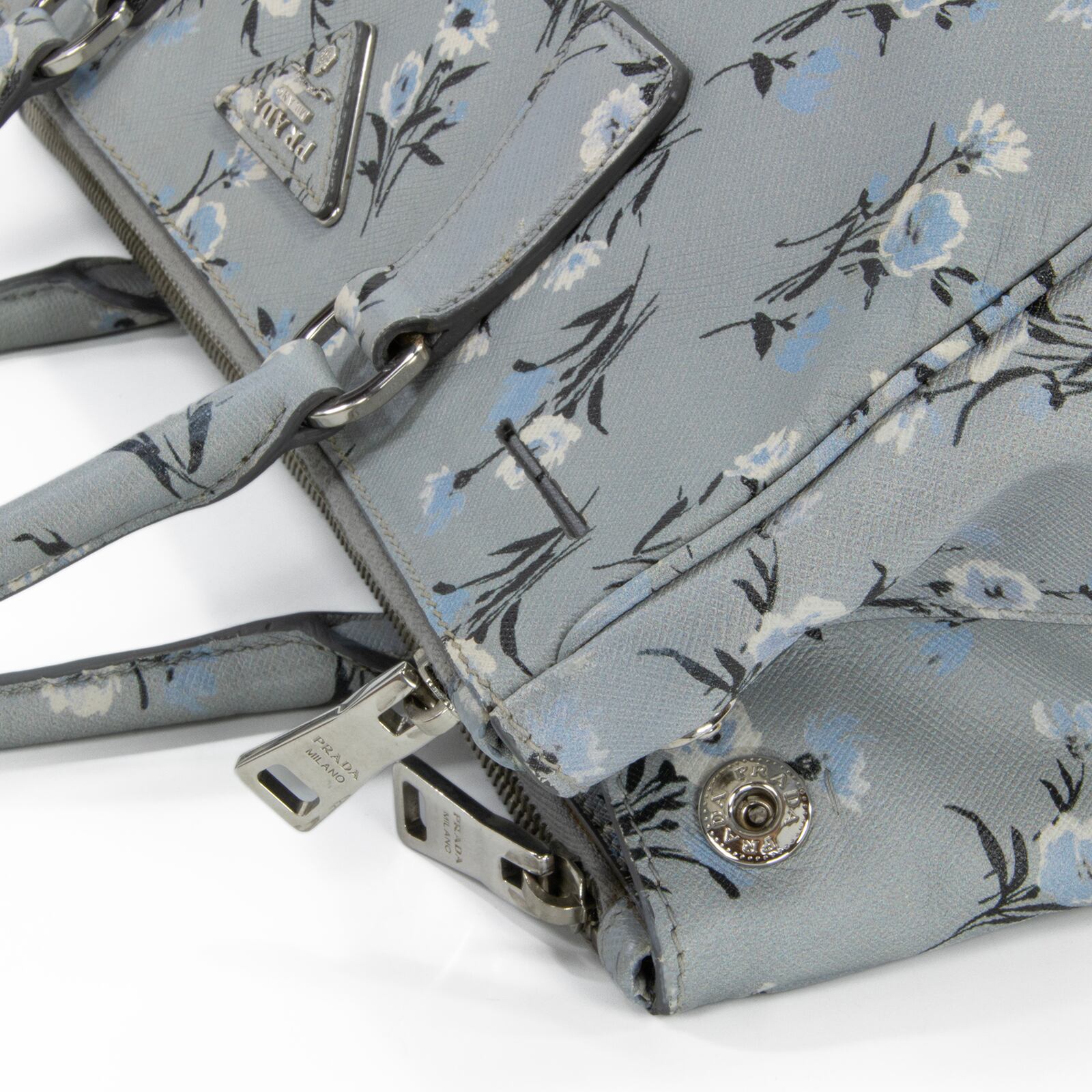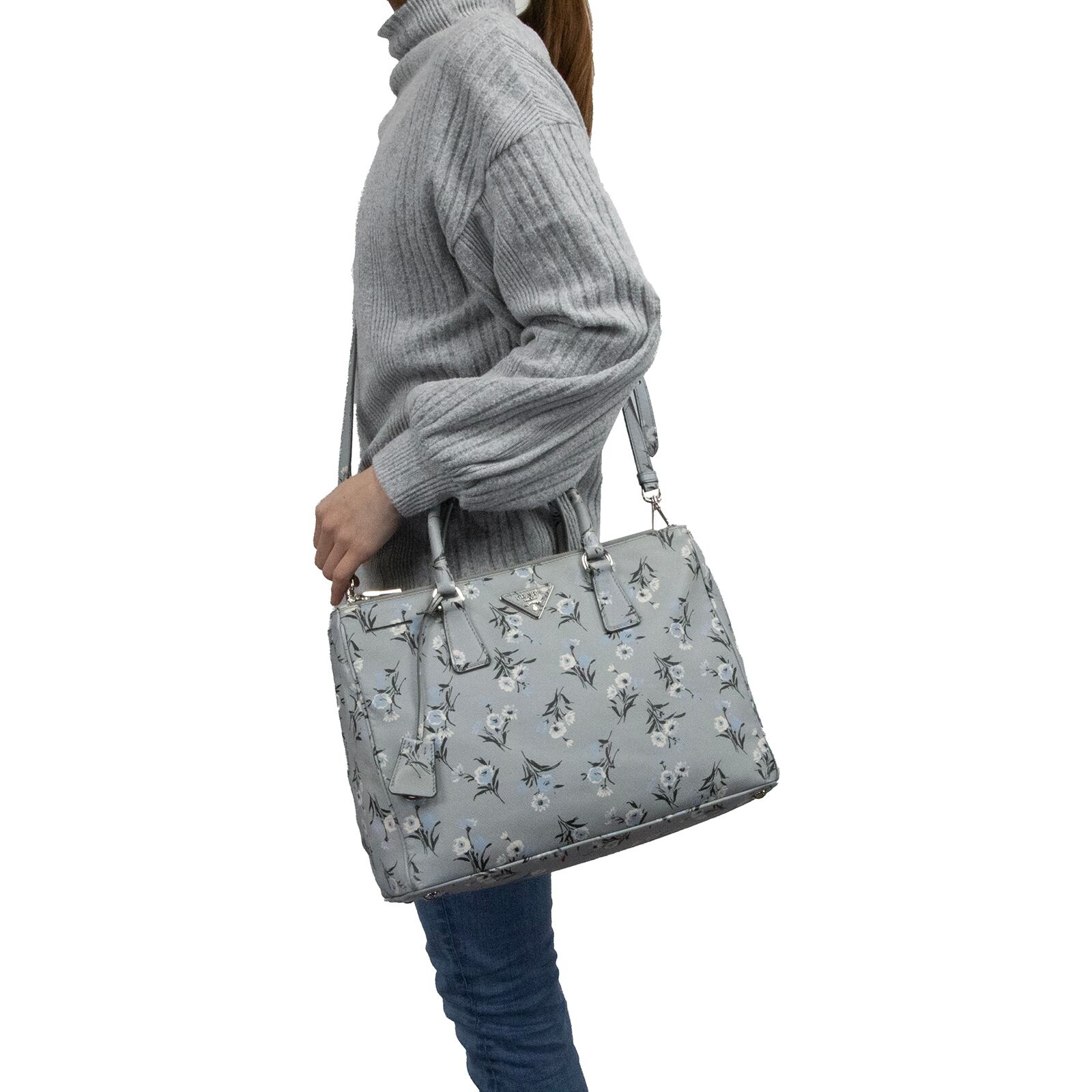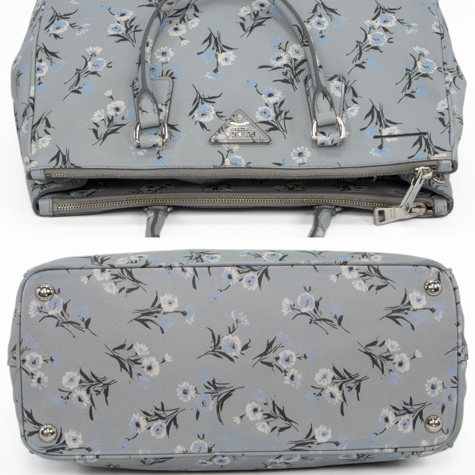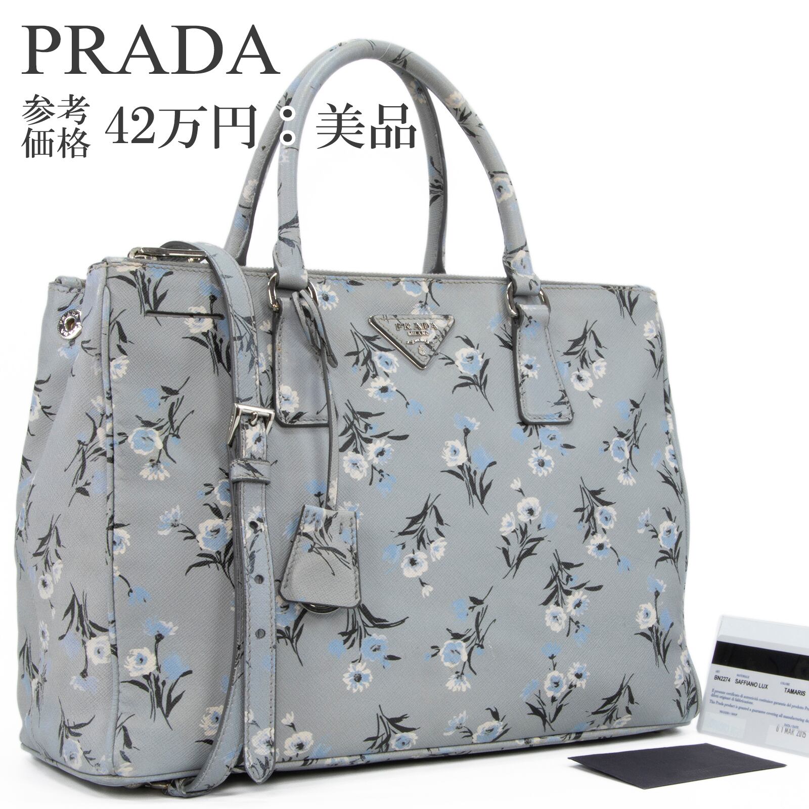 本物 送料無料 プラダ 2WAYショルダーバッグ レディース ガレリア グレー 青 白 珍しい 肩掛け 斜め掛け 花 ロゴ 革 レザー 鞄 バック E455
