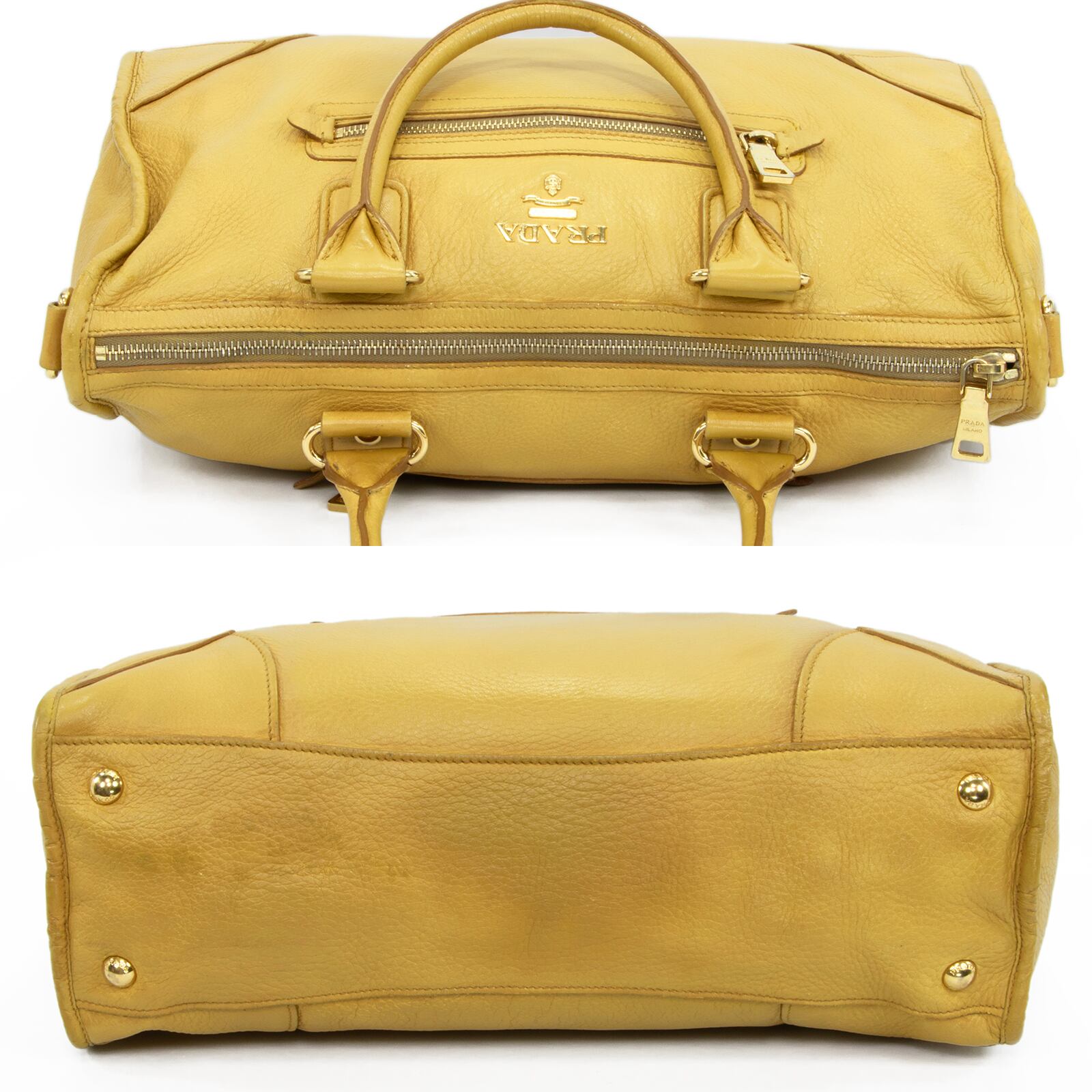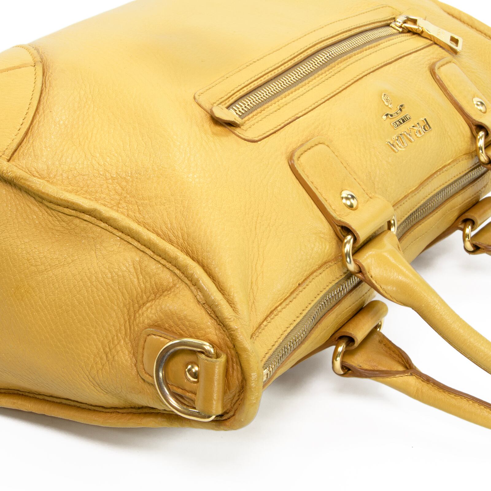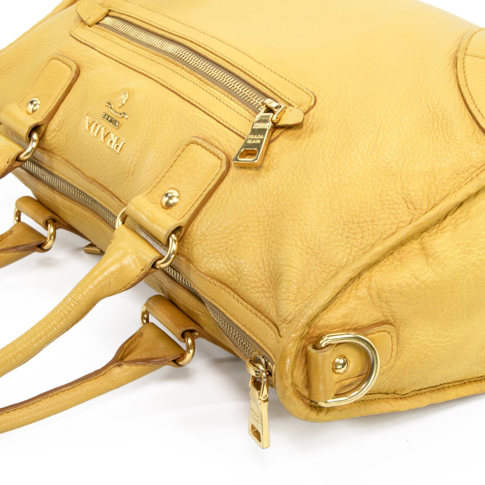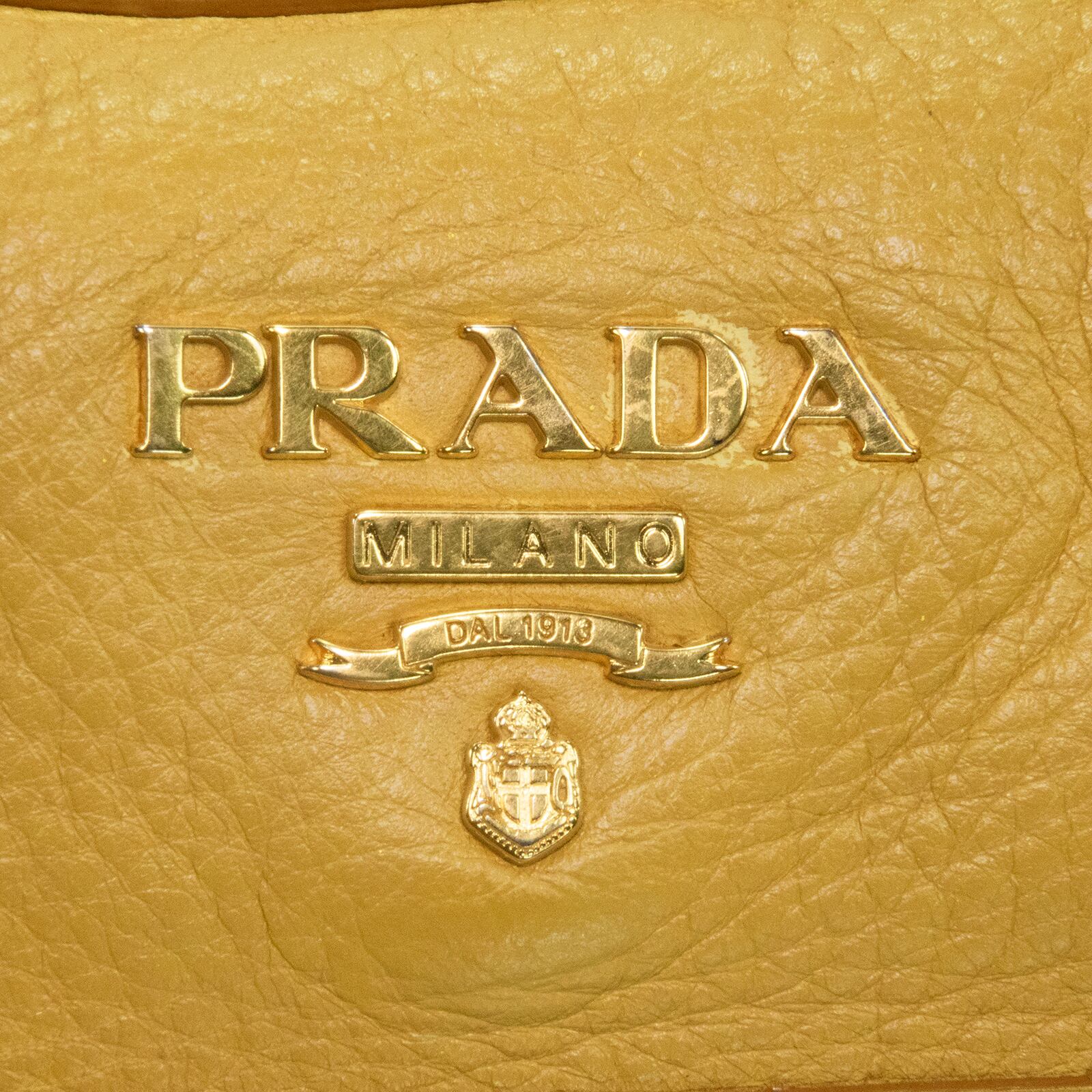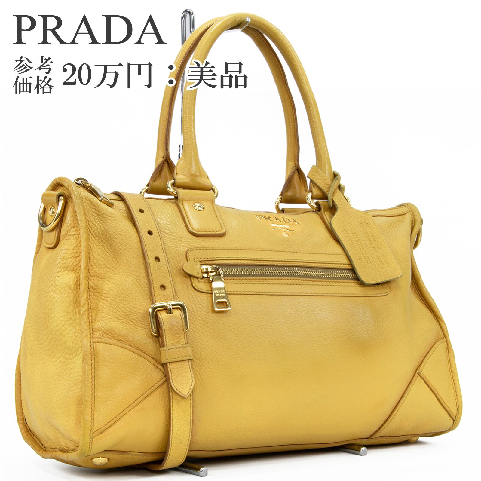 本物 送料無料 プラダ 2WAYショルダーバッグ ハンドバッグ メンズ レディース 黄色 珍しい 肩掛け ロゴ 本革 レザー 綺麗 鞄 バック E458