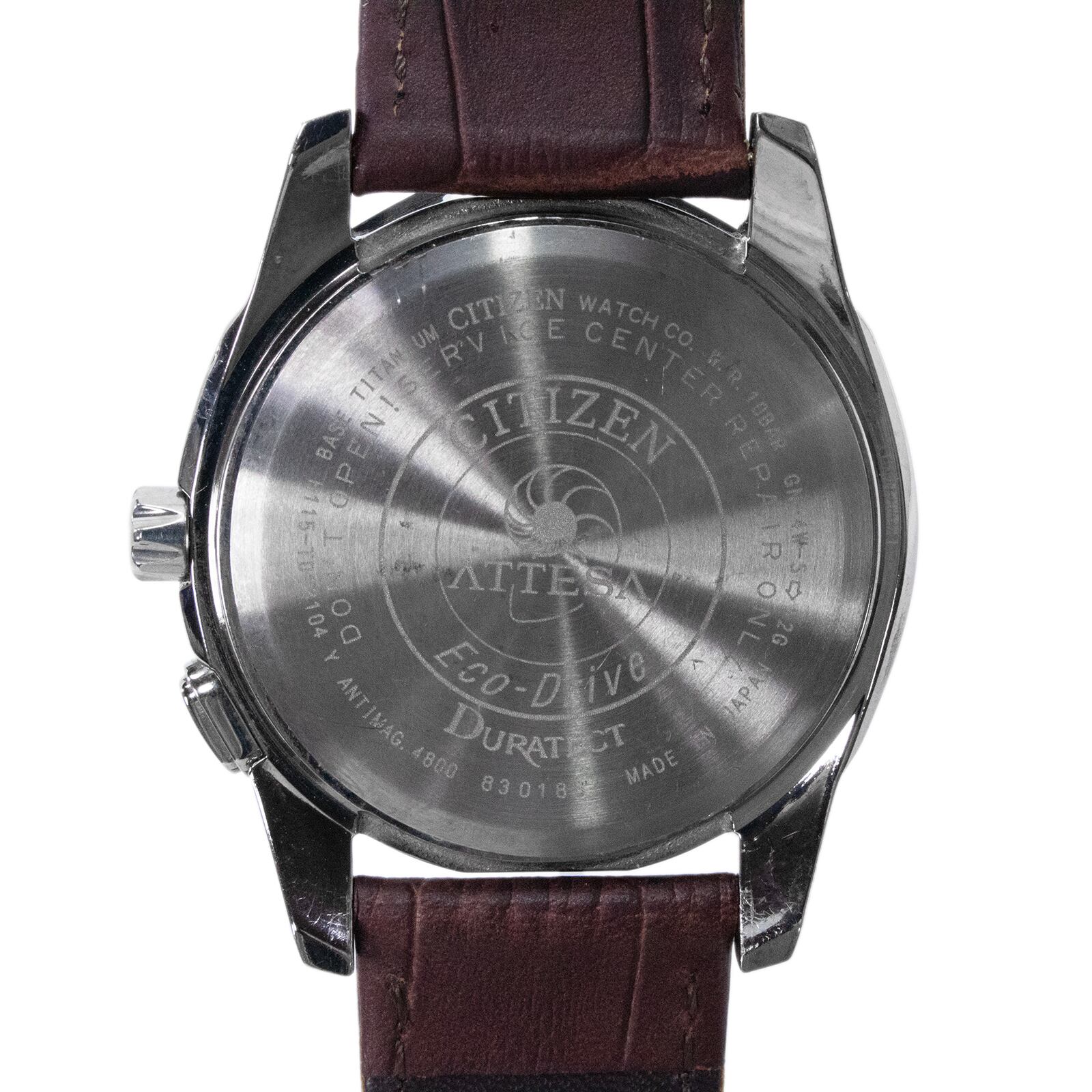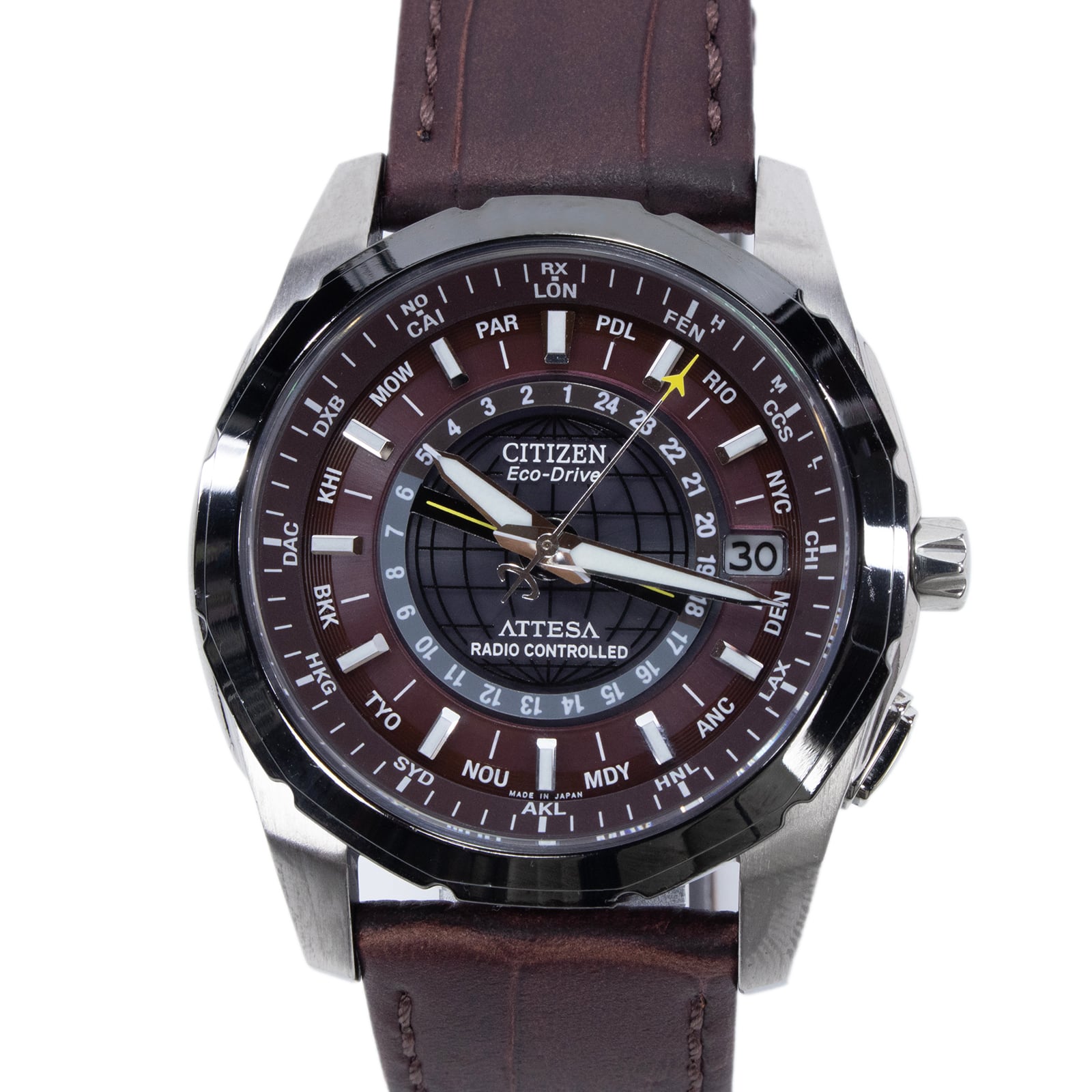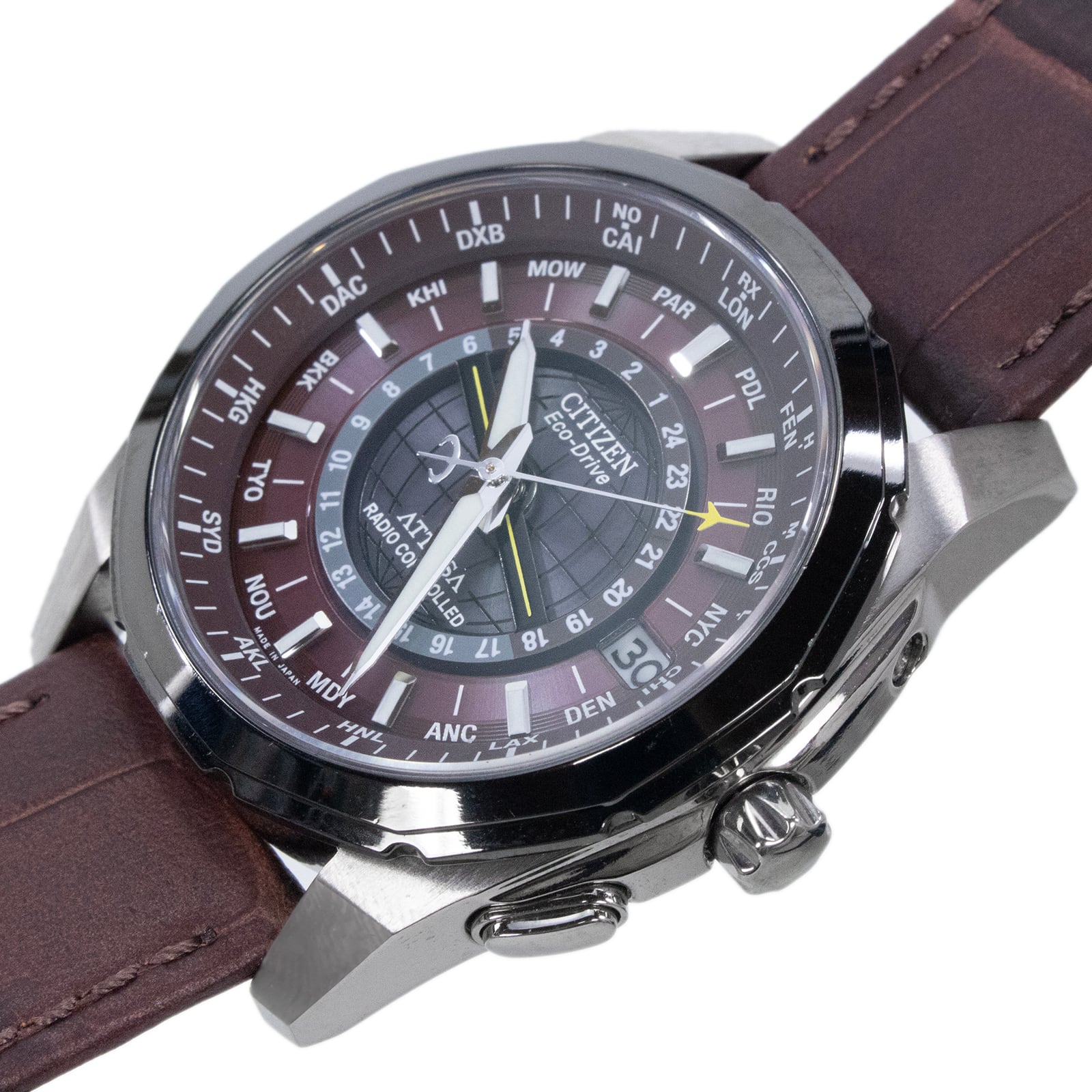 稼働品 送料無料 シチズン 腕時計 ソーラー電波 メンズ アテッサ H115-T013104 黒 茶色 ワールドタイム ロゴ 革ベルト ブランド 綺麗 X469