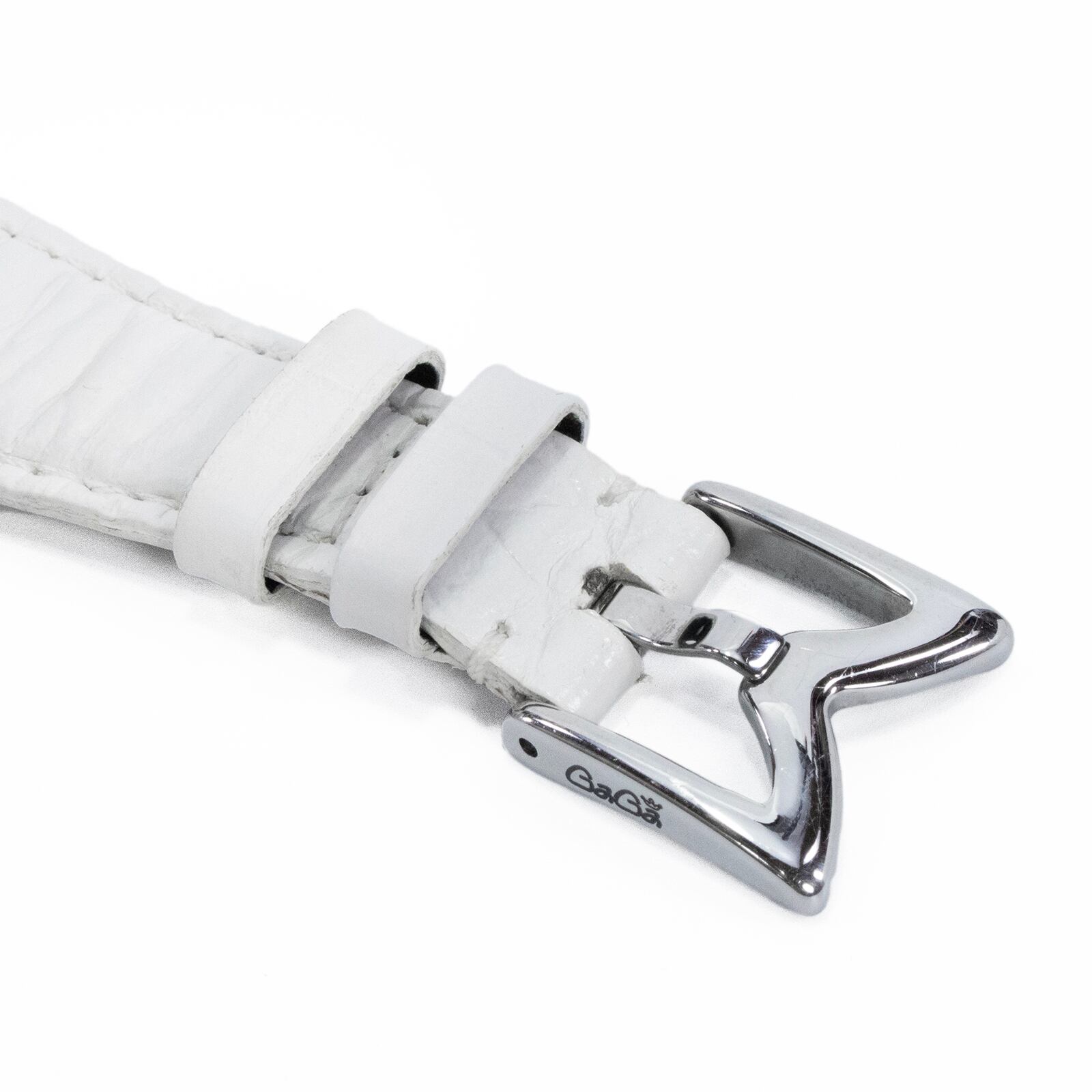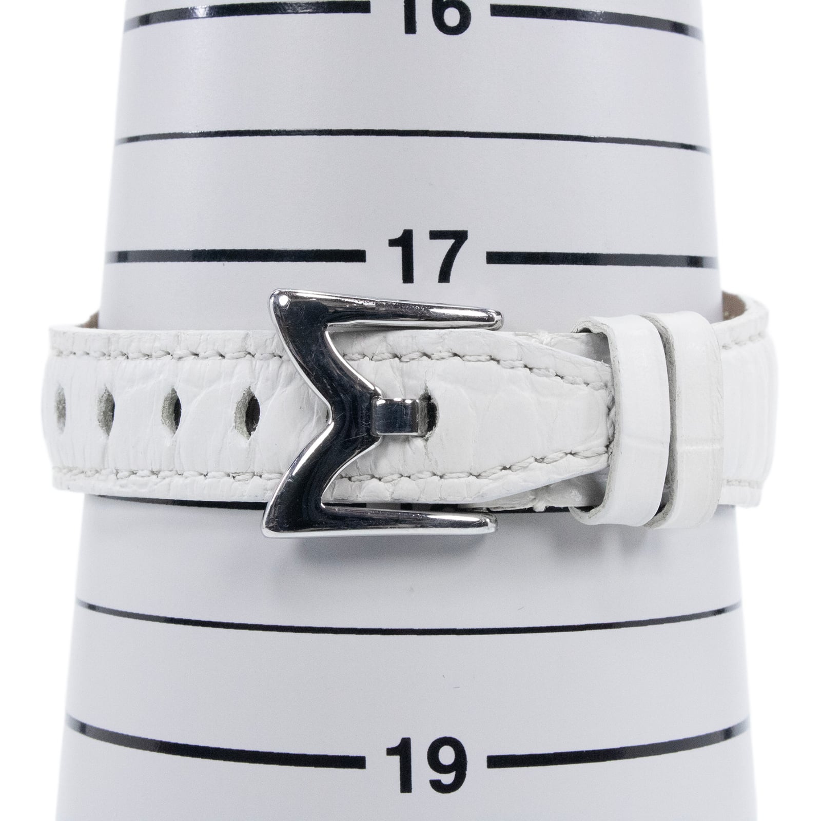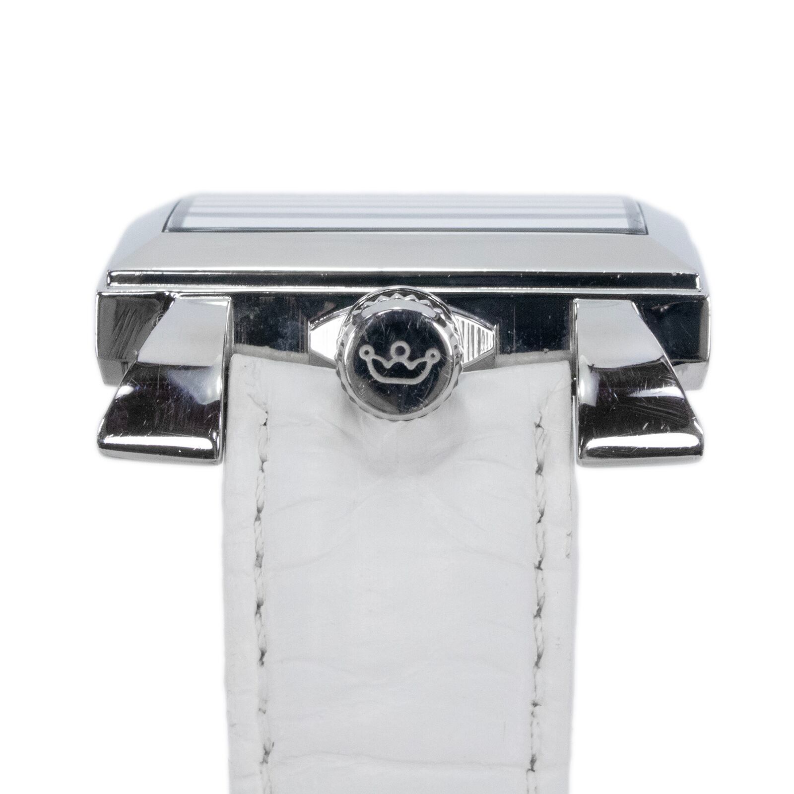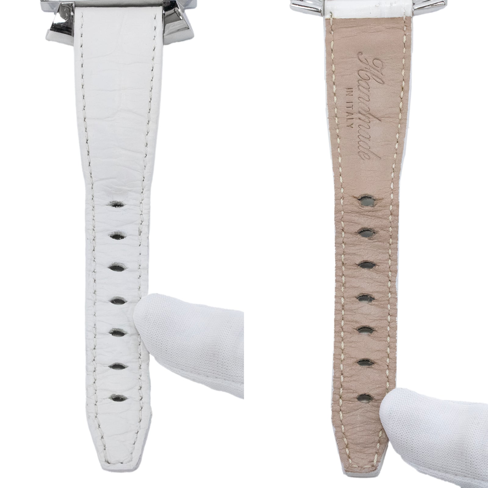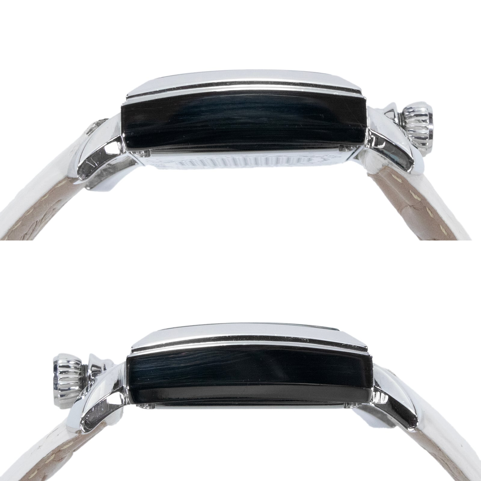 特徴的なスクエアケースとホワイトレザーベルトの組み合わせが、知性的かつ清廉な印象を与えます。