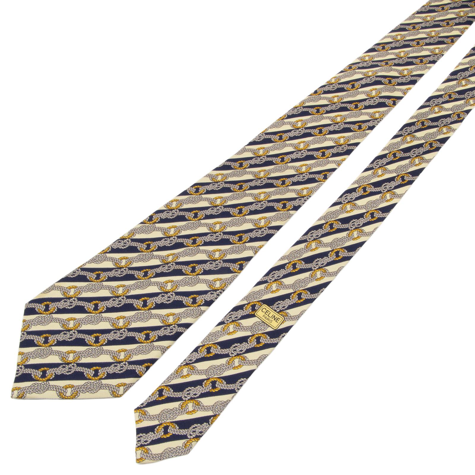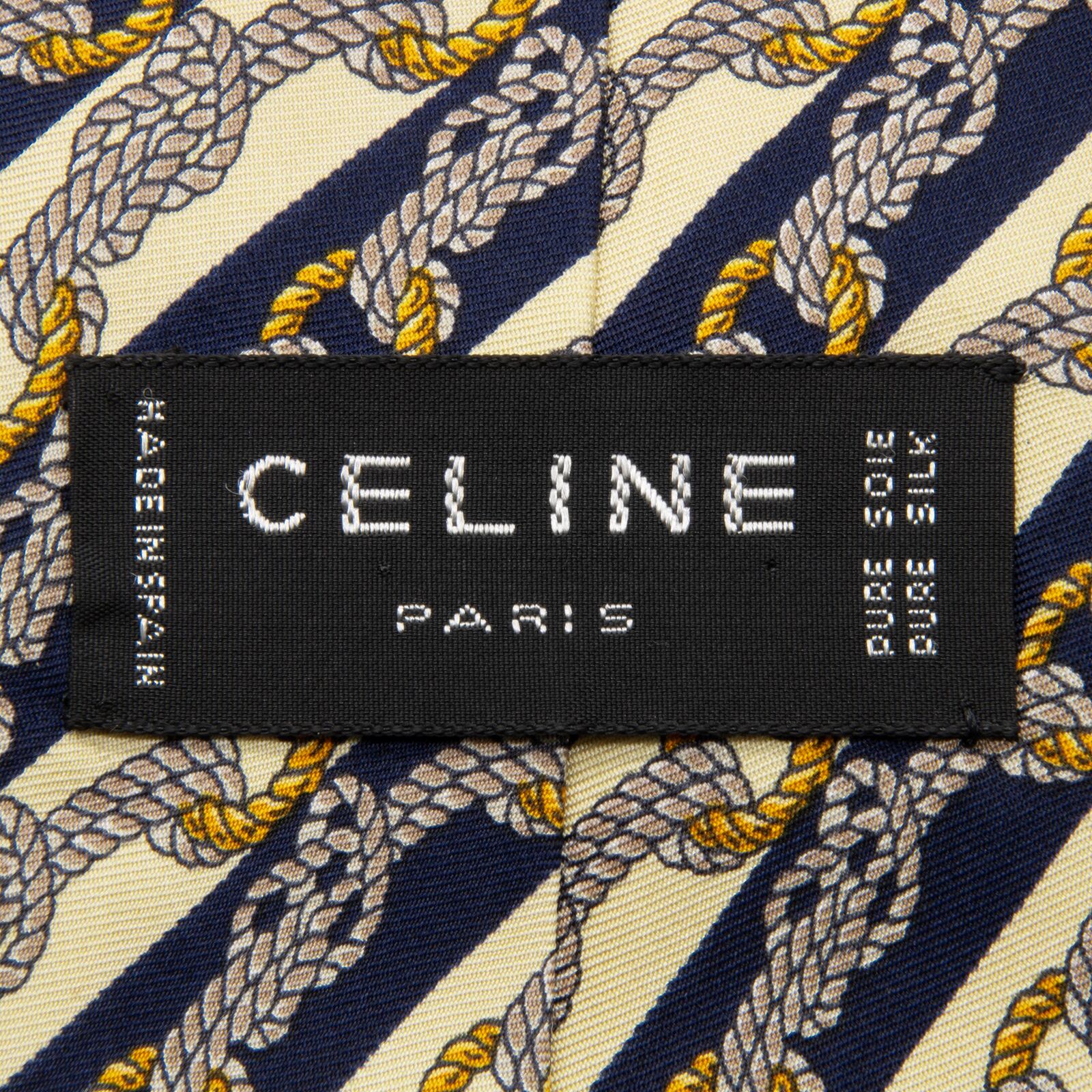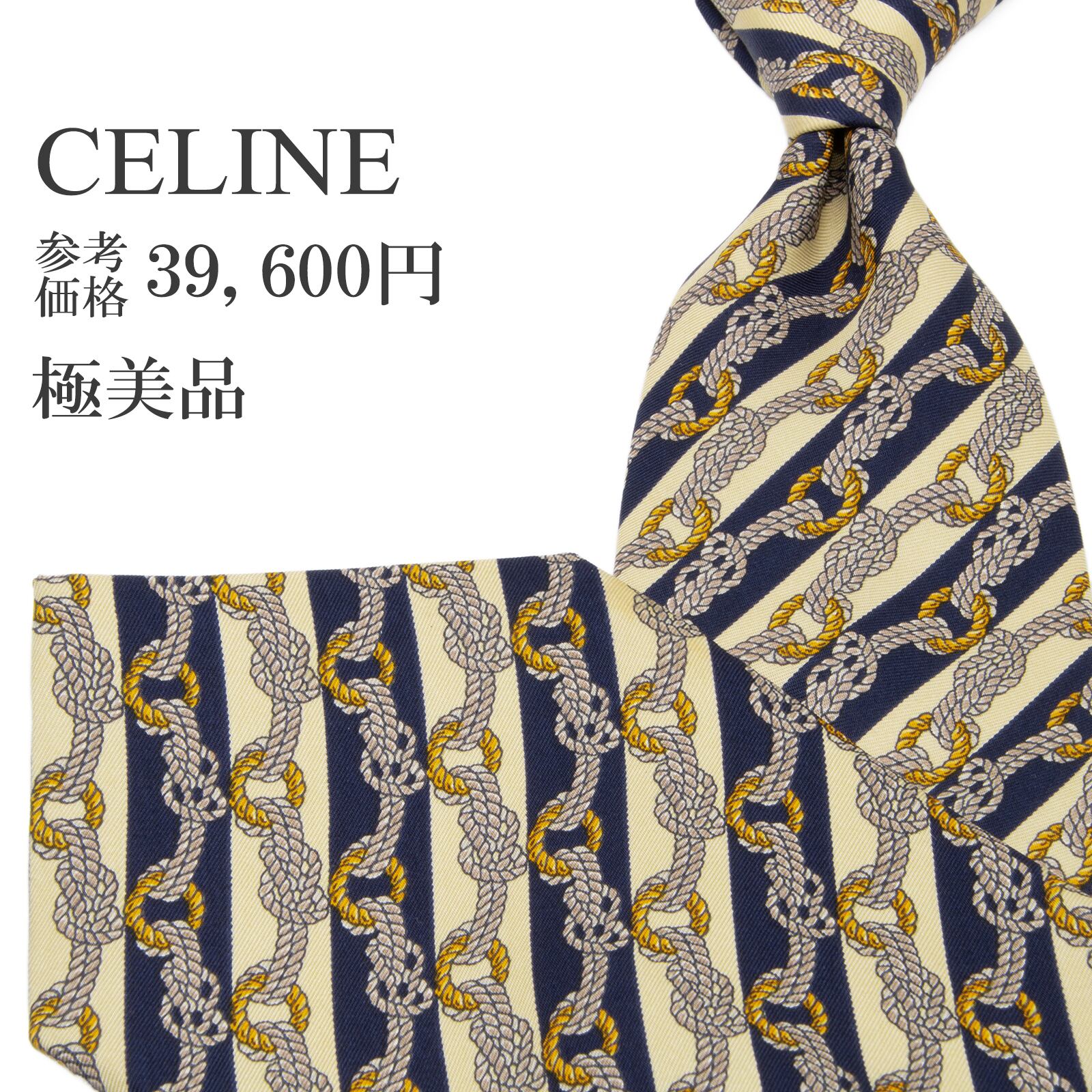 送料無料 セリーヌ ネクタイ シルク ネイビーブルー アイボリー グレー 黄色 ストライプ Y2K 縄 ロープ ハイブランド スペイン製 綺麗 P285