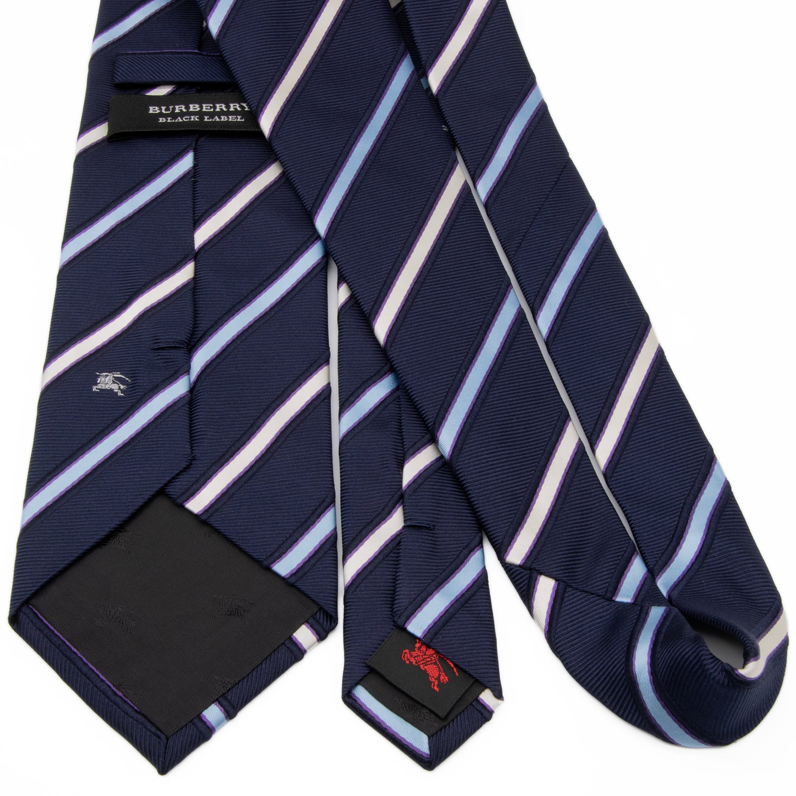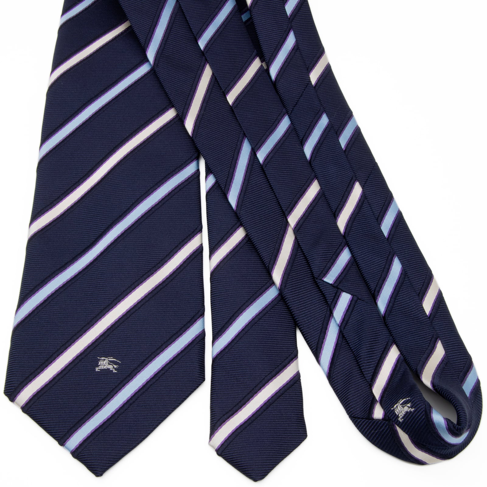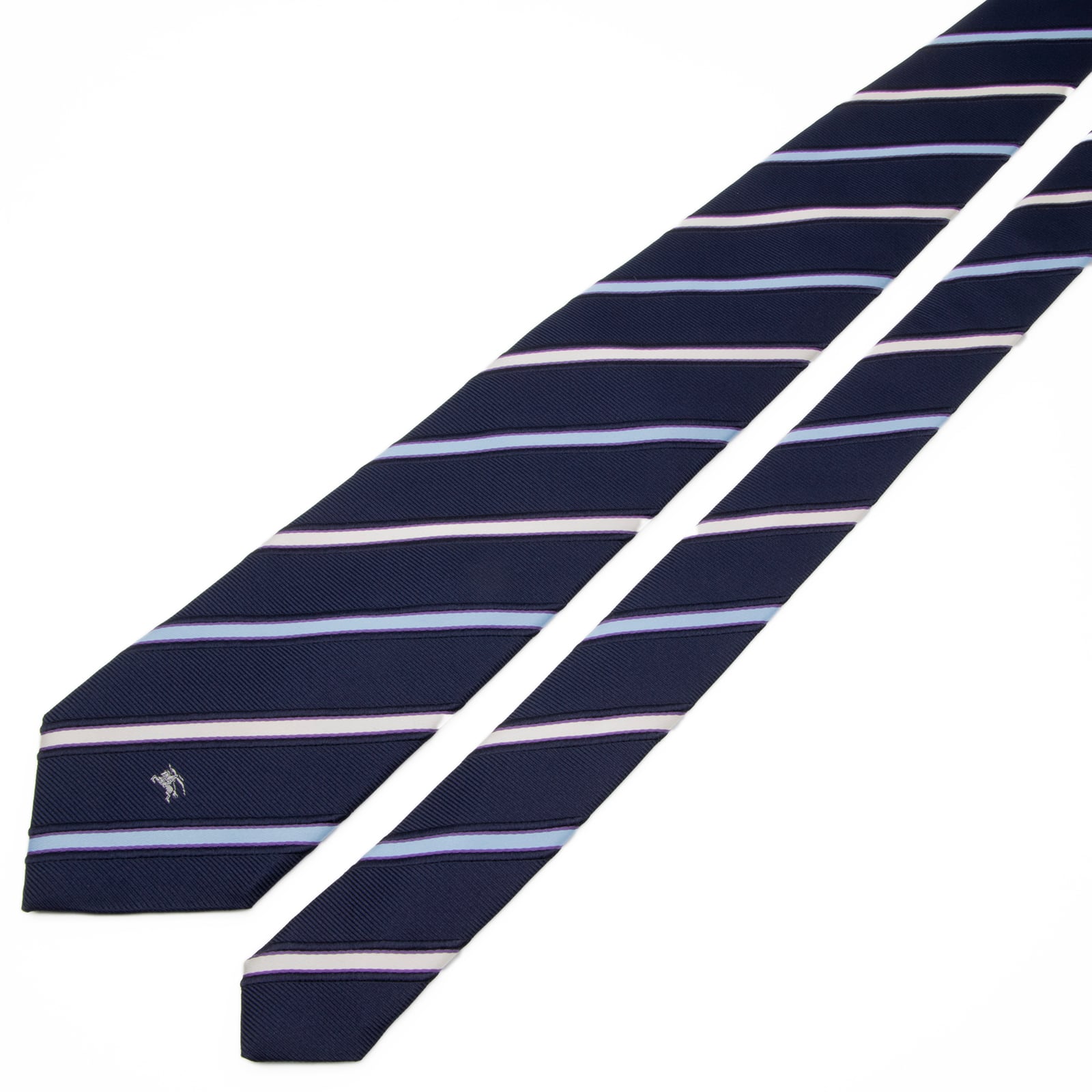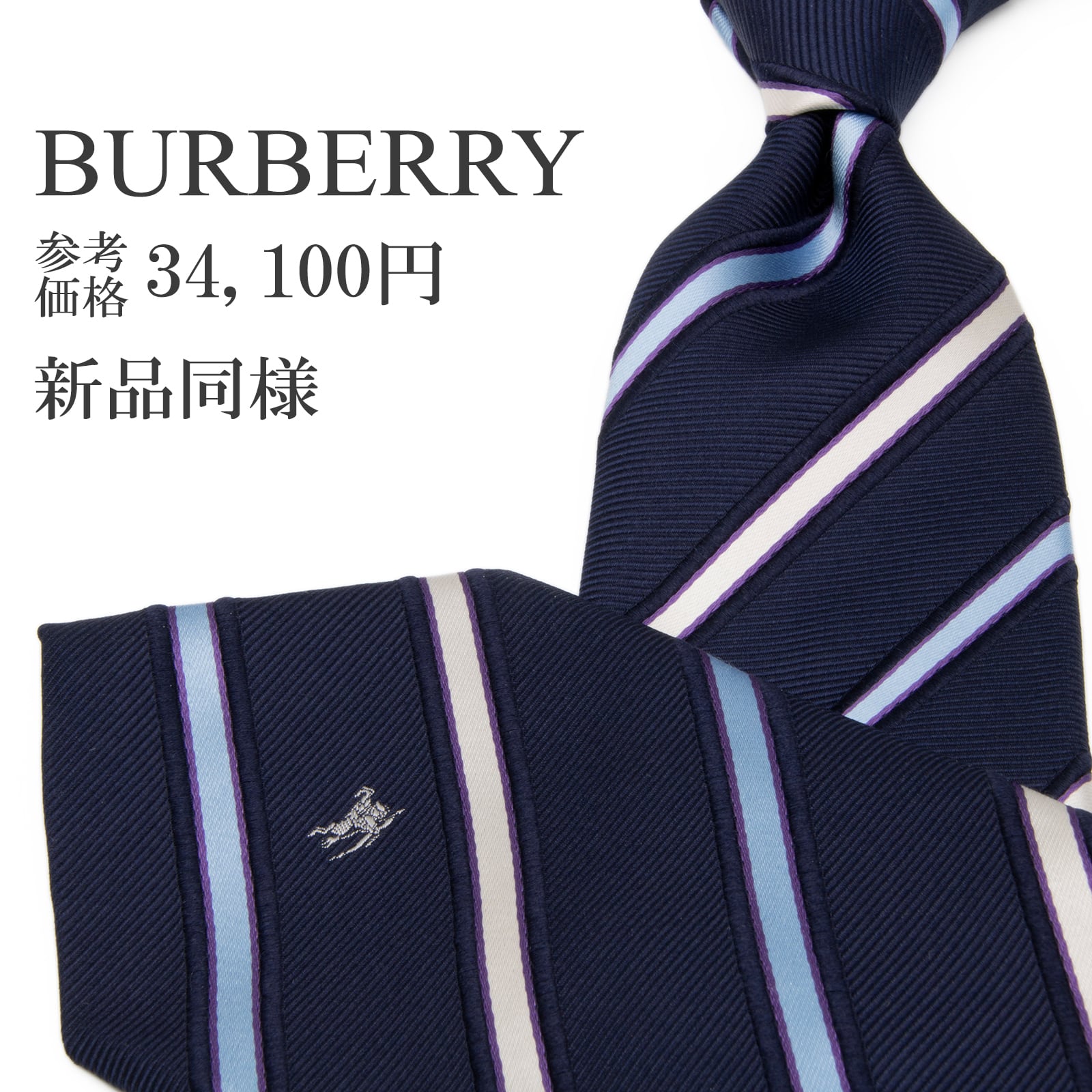 新品同様 送料無料 バーバリー ネクタイ レギュラータイ ジャガード ネイビーブルー 水色 白 紫 ストライプ 肉厚 馬 ホースロゴ 綺麗 P534