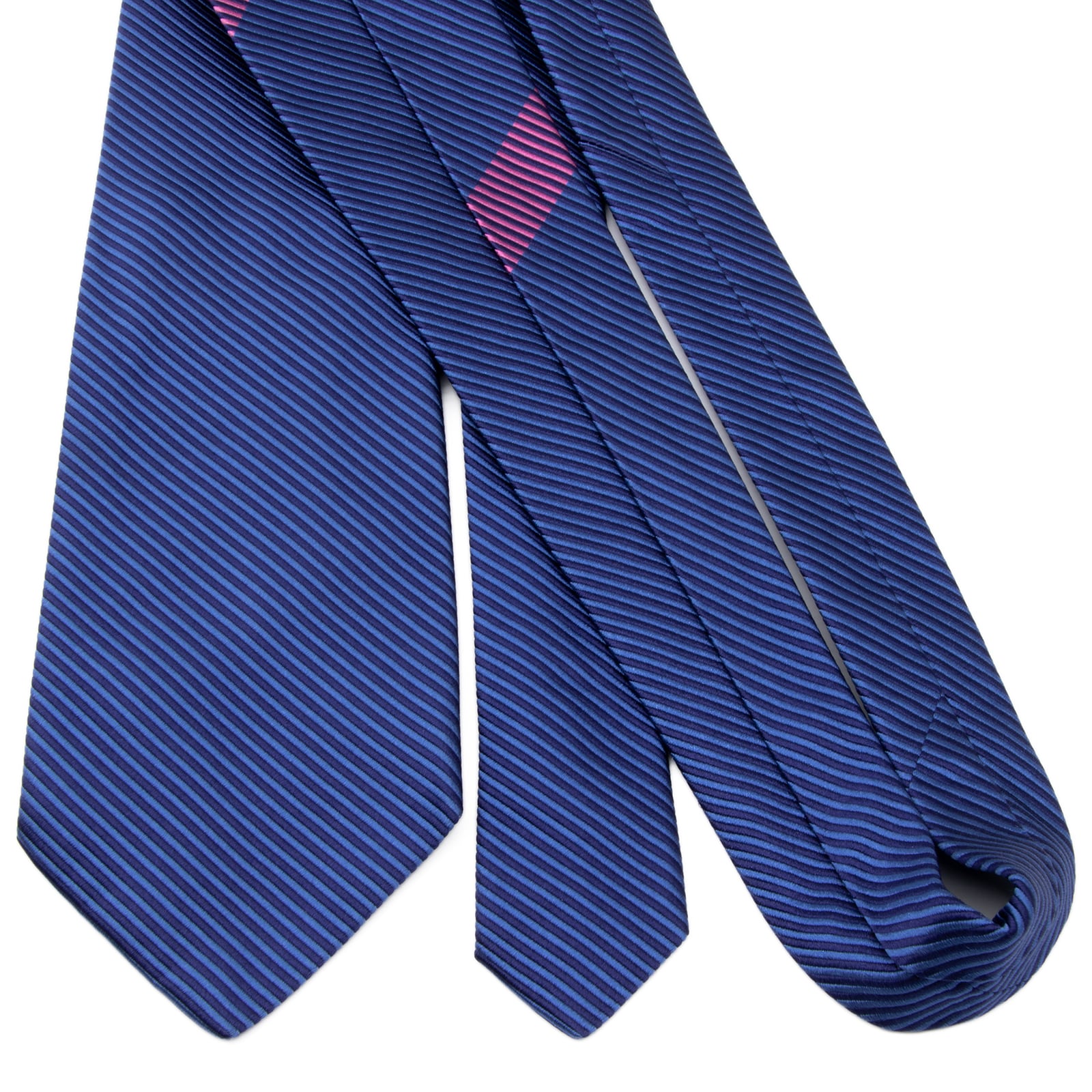 こちらは、ブルーとネイビーの落ち着いたトーンに、ピンクのアクセントが映えるフェラガモのネクタイでございます。