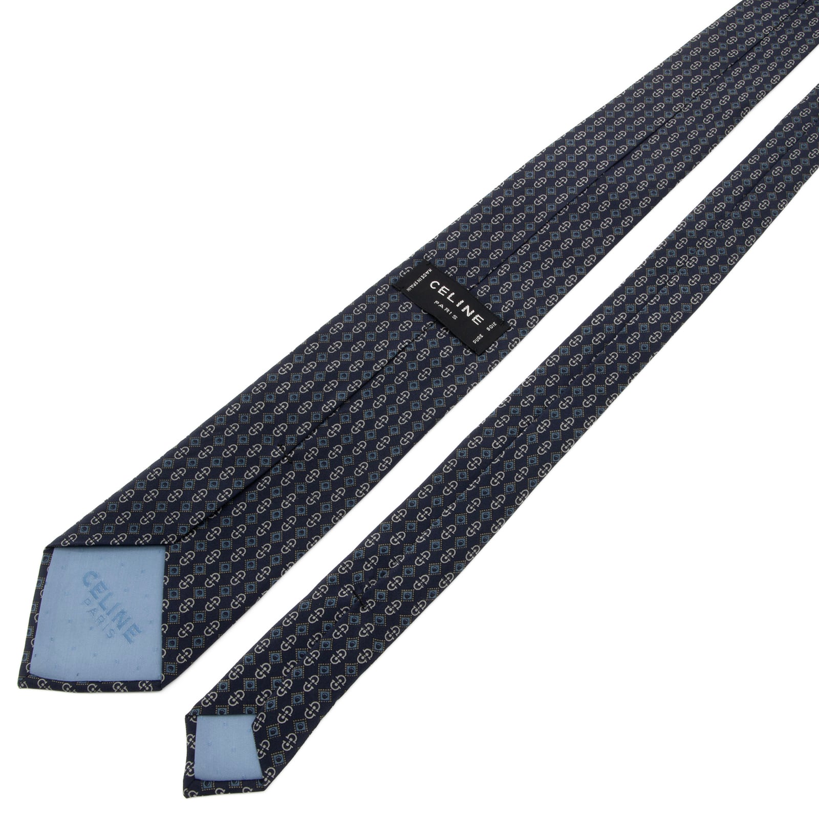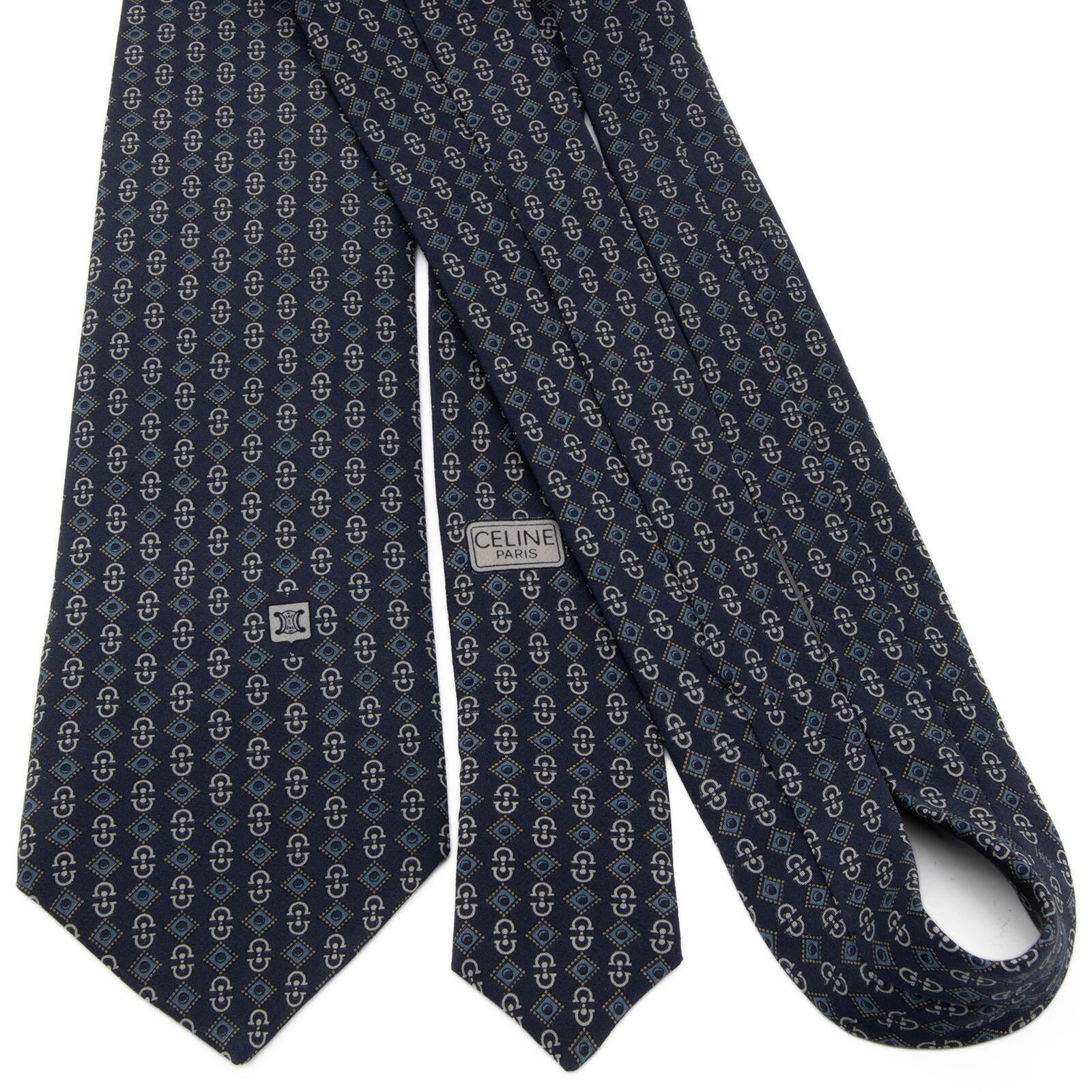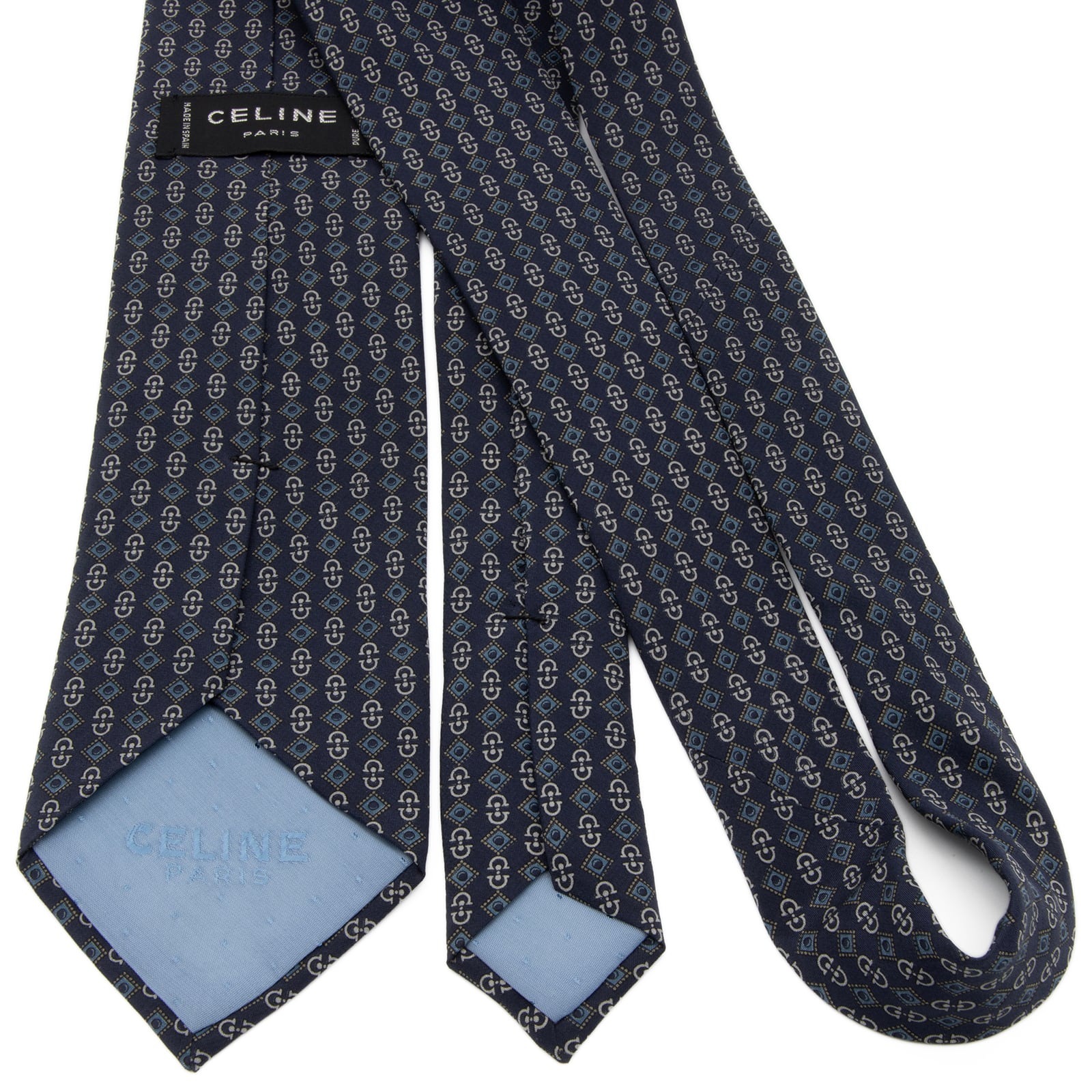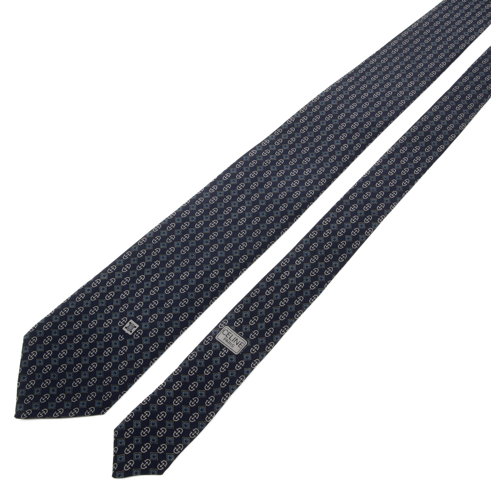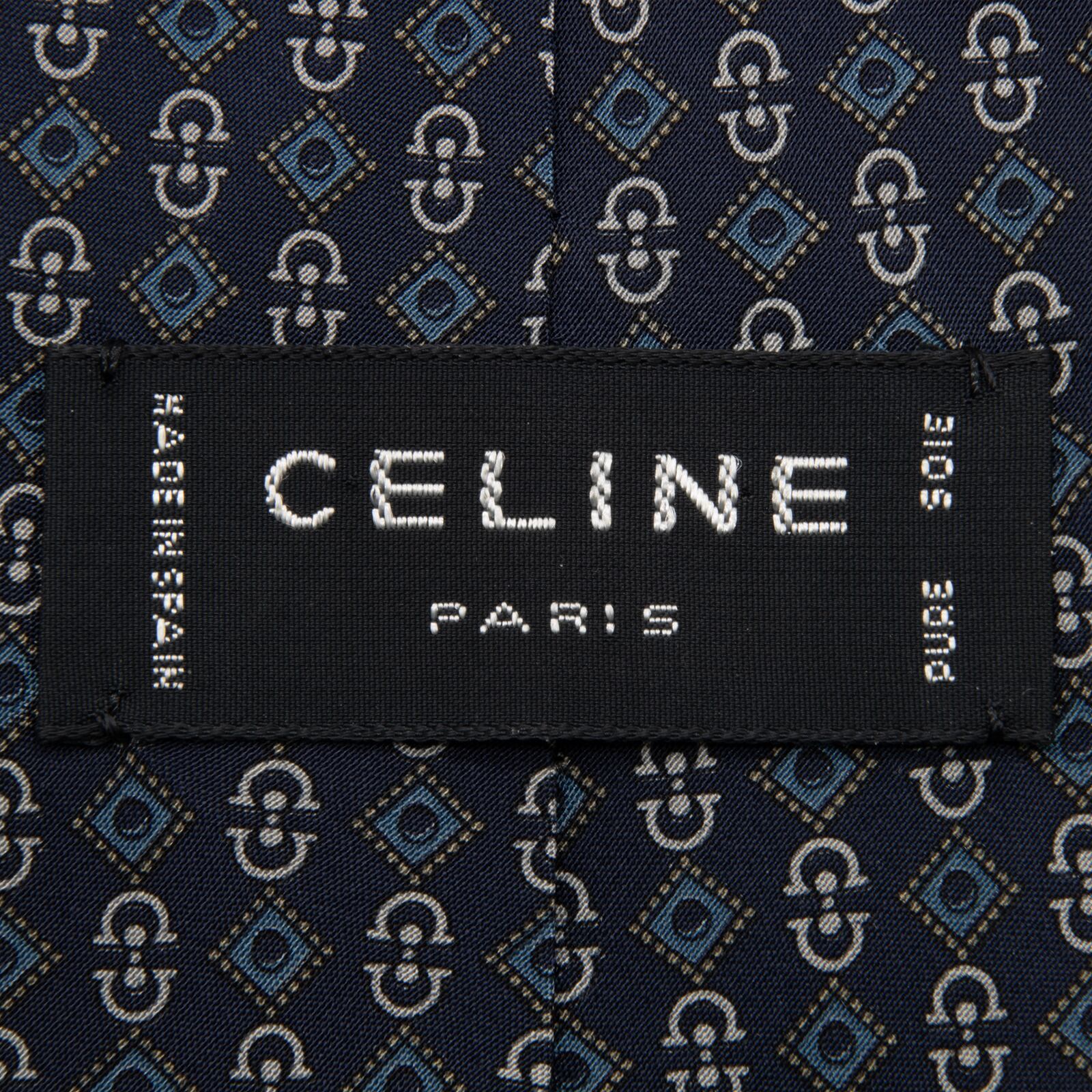 送料無料 セリーヌ ネクタイ レギュラータイ シルク ネイビーブルー 青 グレー 総柄 Y2K ホースビット マカダム ブラゾン ロゴ 綺麗 P741