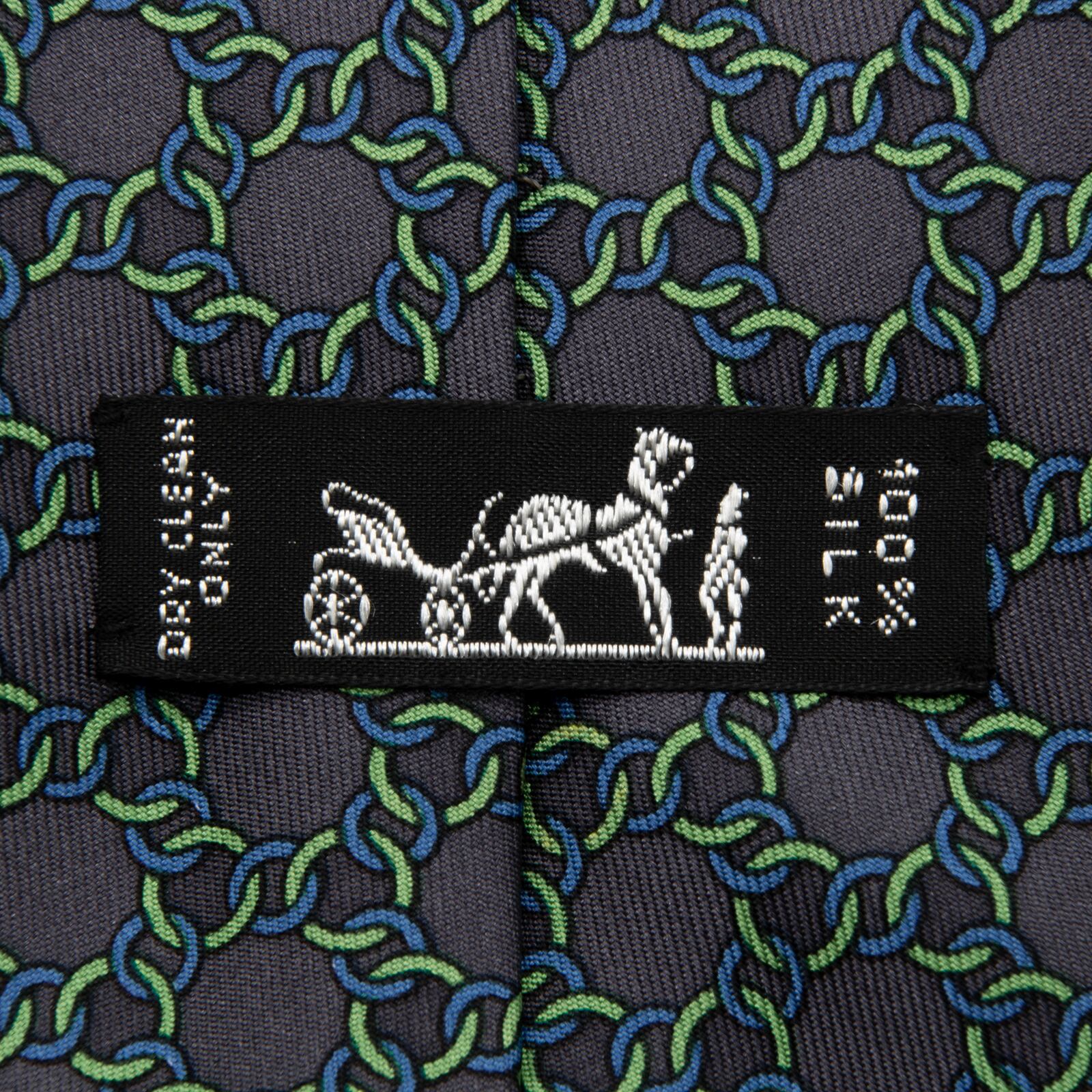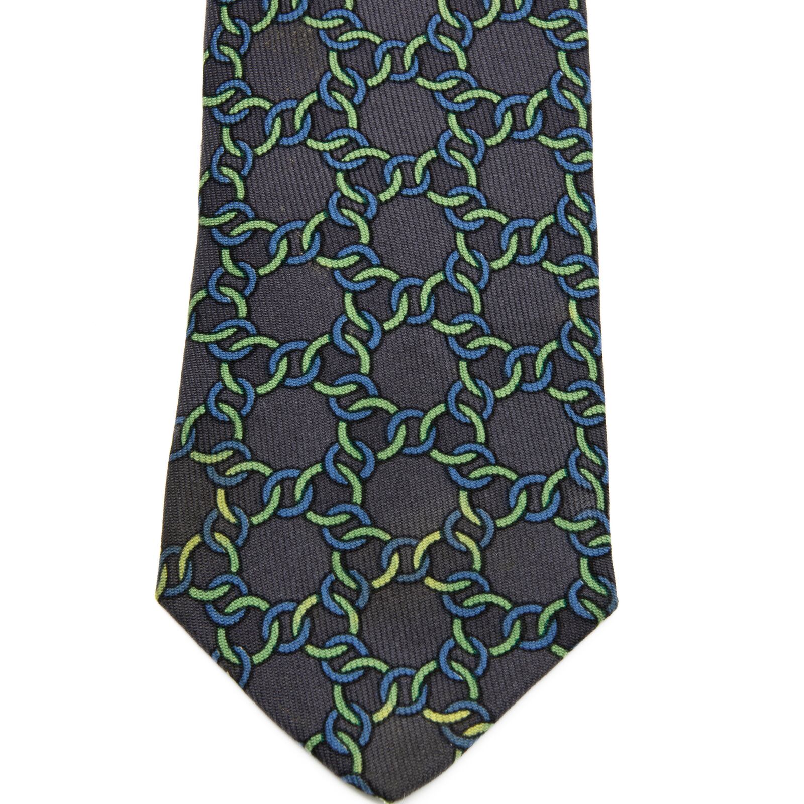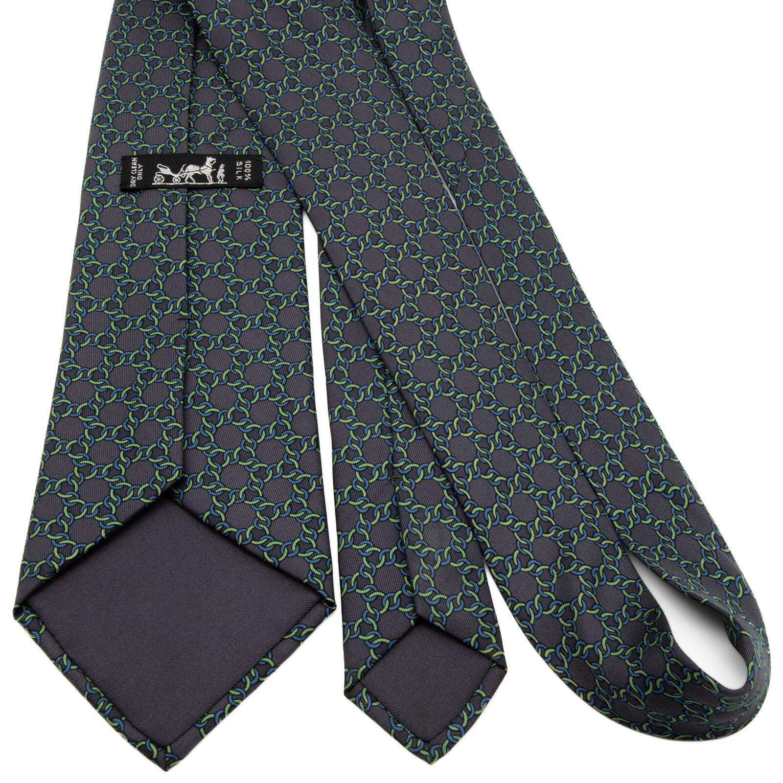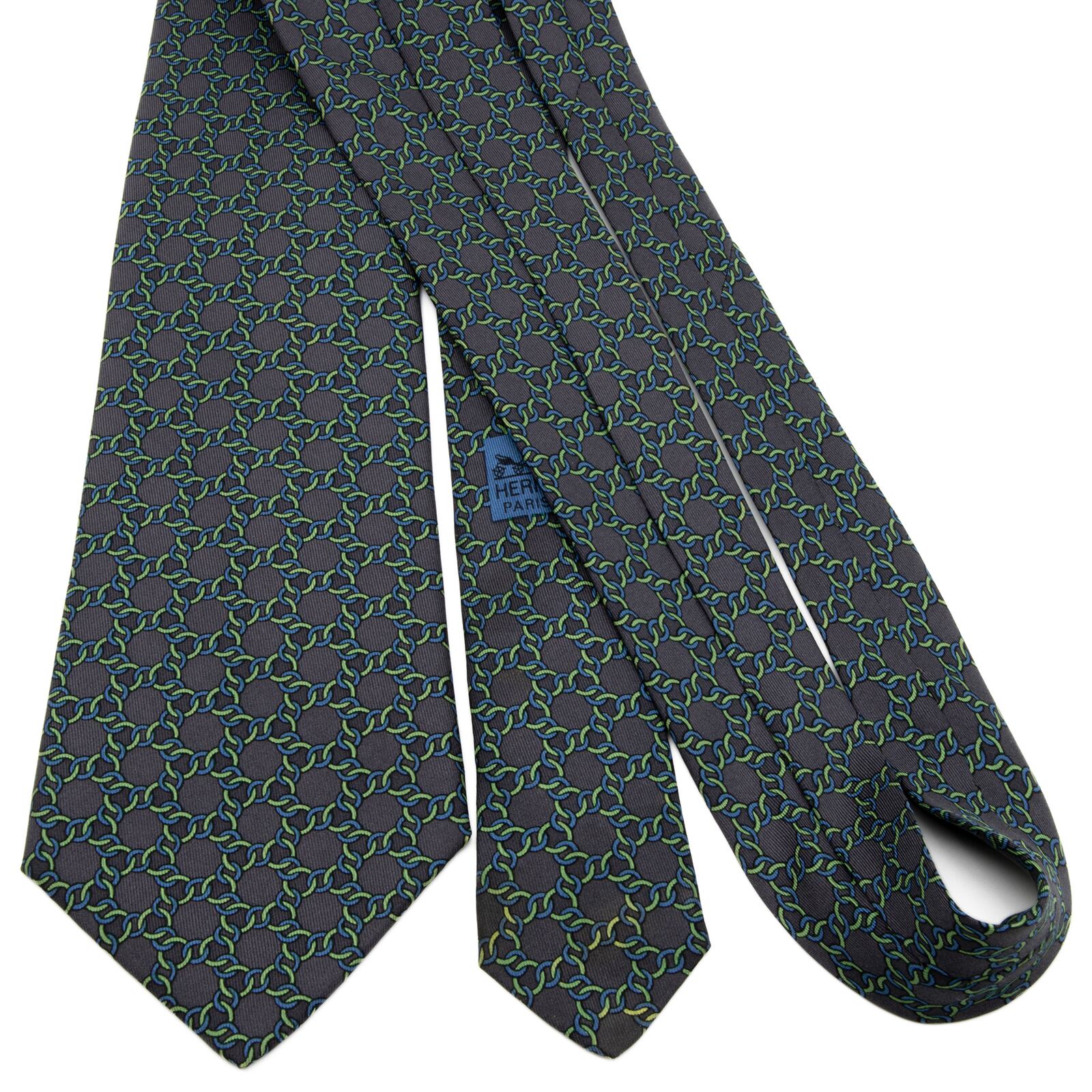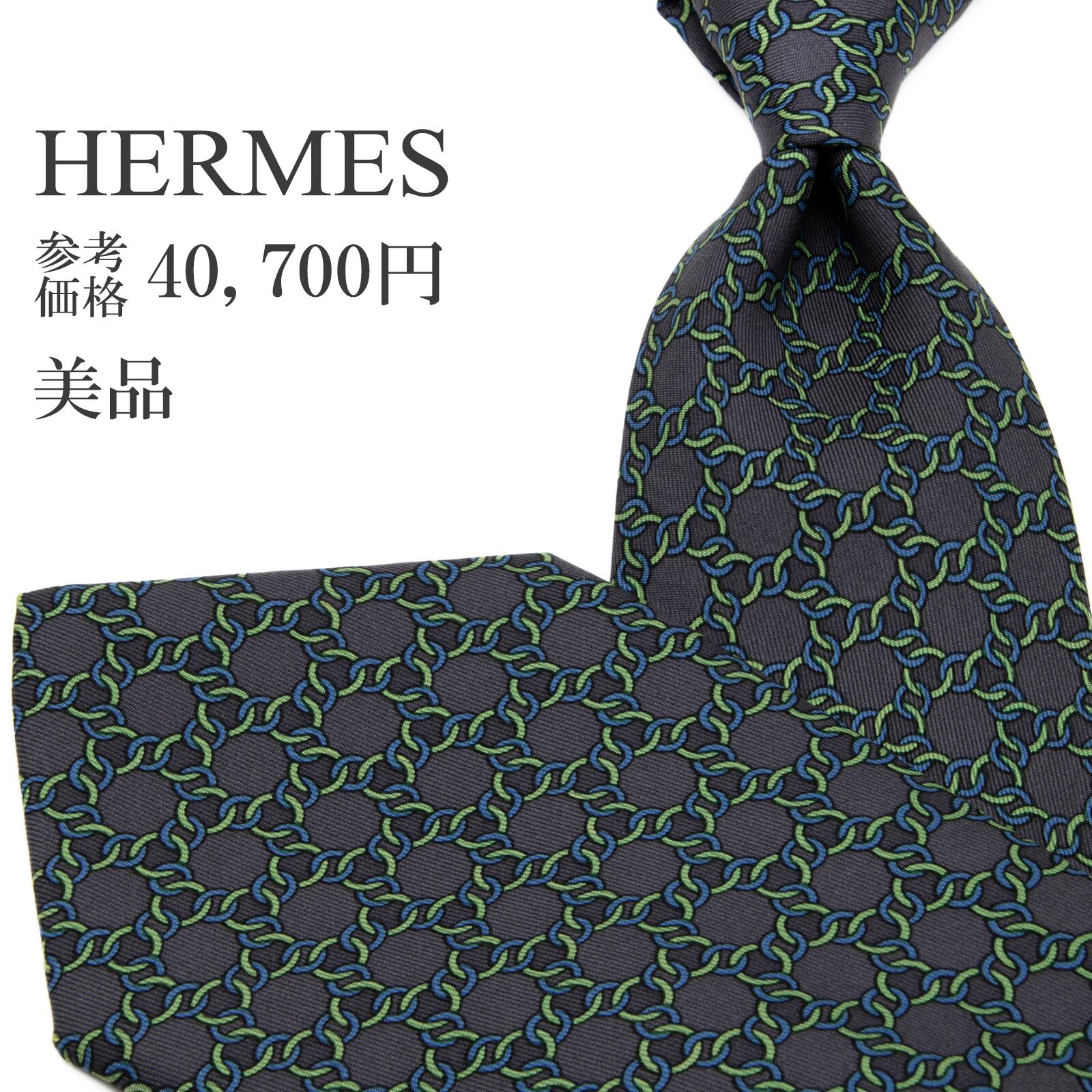 送料無料 エルメス ネクタイ レギュラータイ シルク グレーブルー 青 緑 グリーン 総柄 Y2K 鎖 チェーン ハイブランド フランス 綺麗 P795