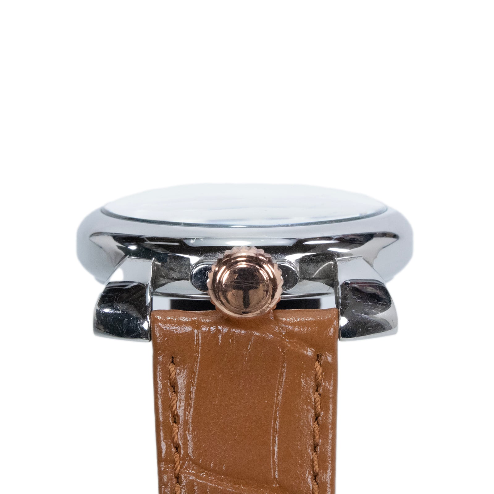 12時位置に配されたリューズはピンクゴールドカラーで彩られ、クールなシルバーケースにラグジュアリーなアクセントを添えております。