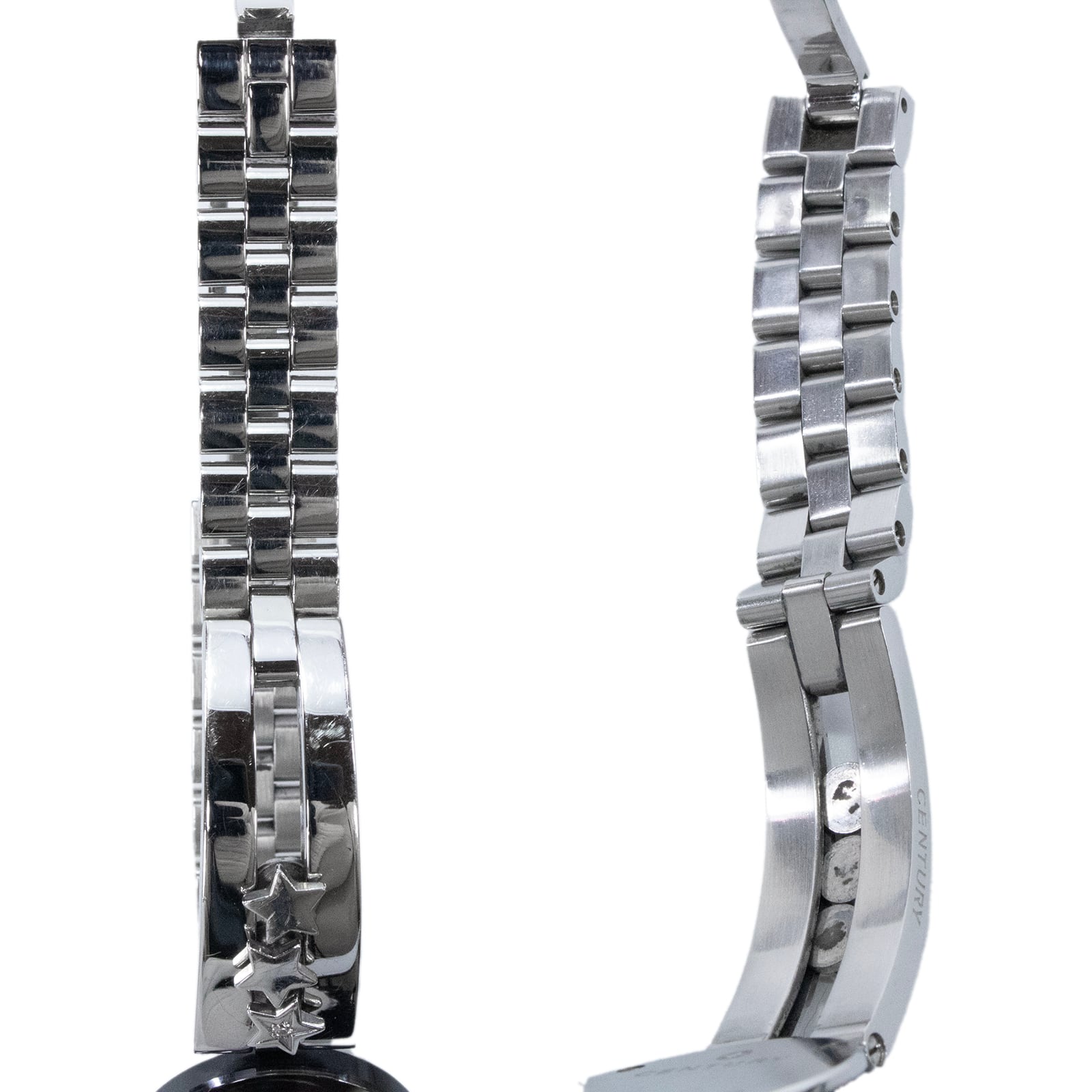 漆黒のブラックダイヤルに、夜空に瞬く星を思わせるカッティングと、2石のダイヤモンドが煌めく、ロマンティックなデザインです。