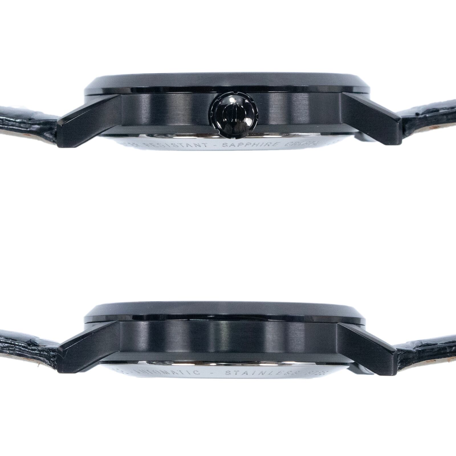 余計な装飾を削ぎ落としたミニマルなバーインデックスと、漆黒の文字盤が、都会的でシャープな印象を与えます。