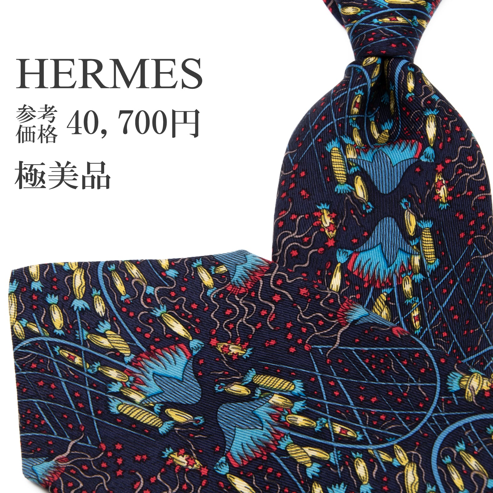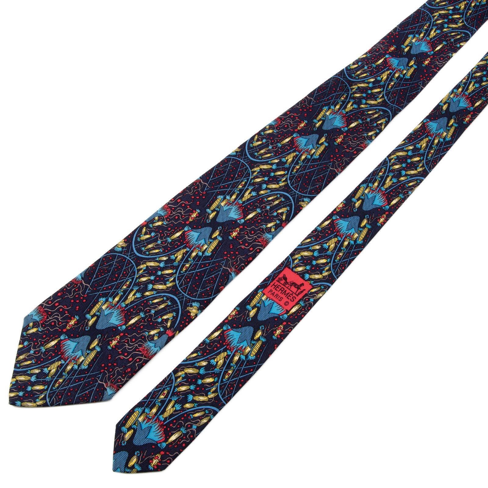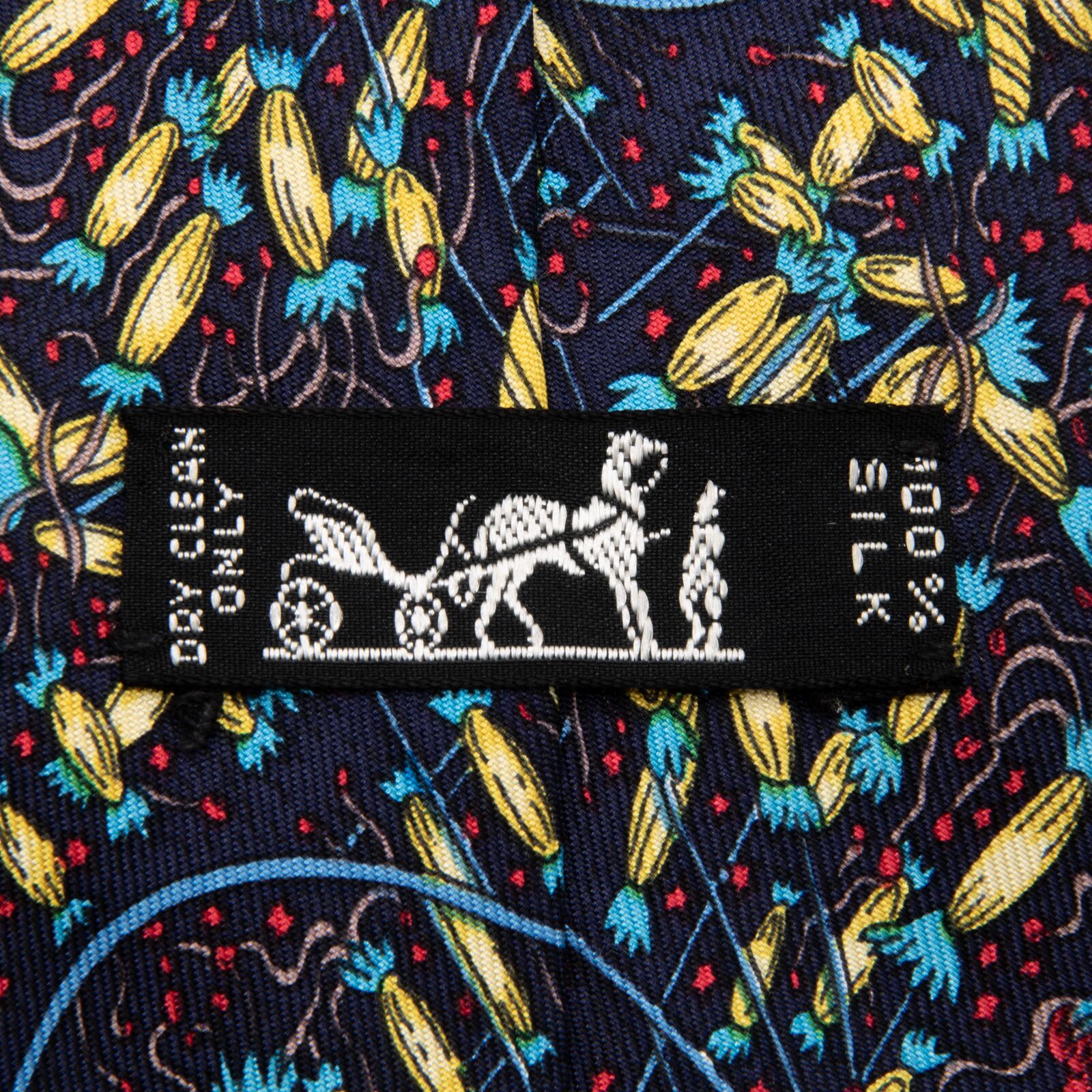 送料無料 エルメス ネクタイ レギュラータイ シルク ネイビーブルー 青 黄色 赤 総柄 Y2K 派手 目立つ ハイブランド フランス製 綺麗 P313