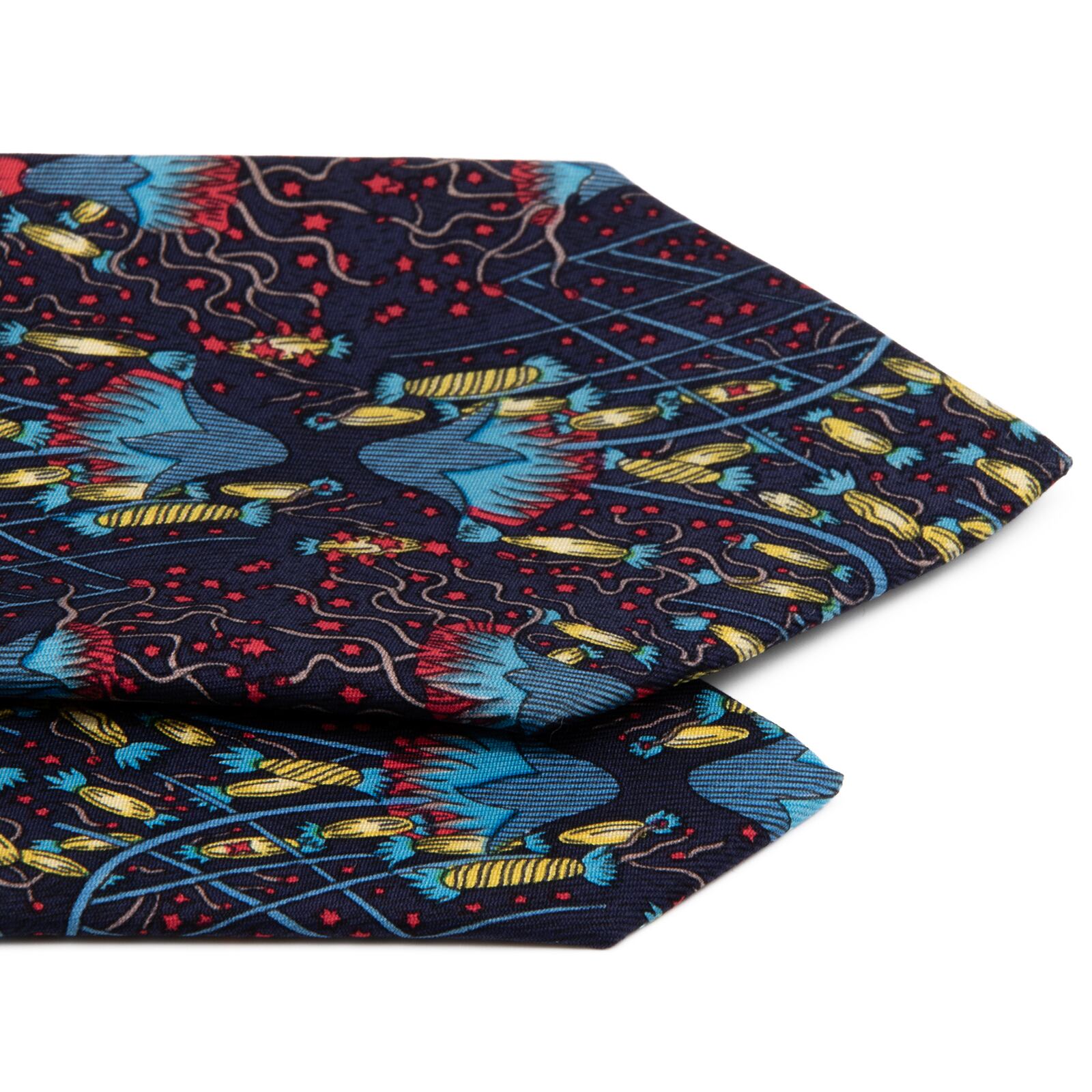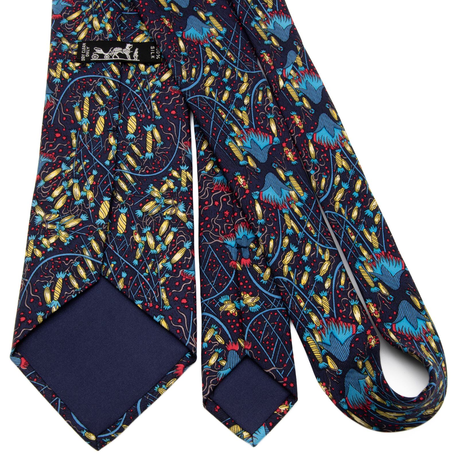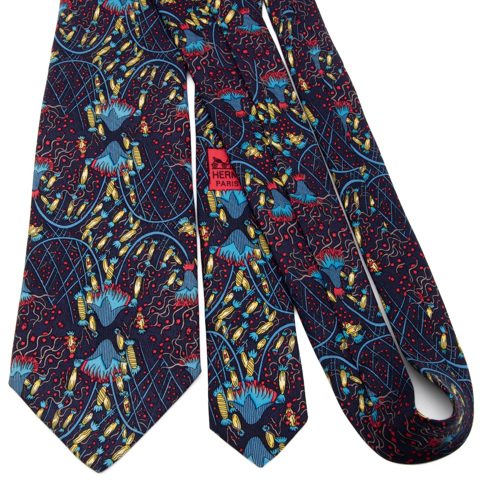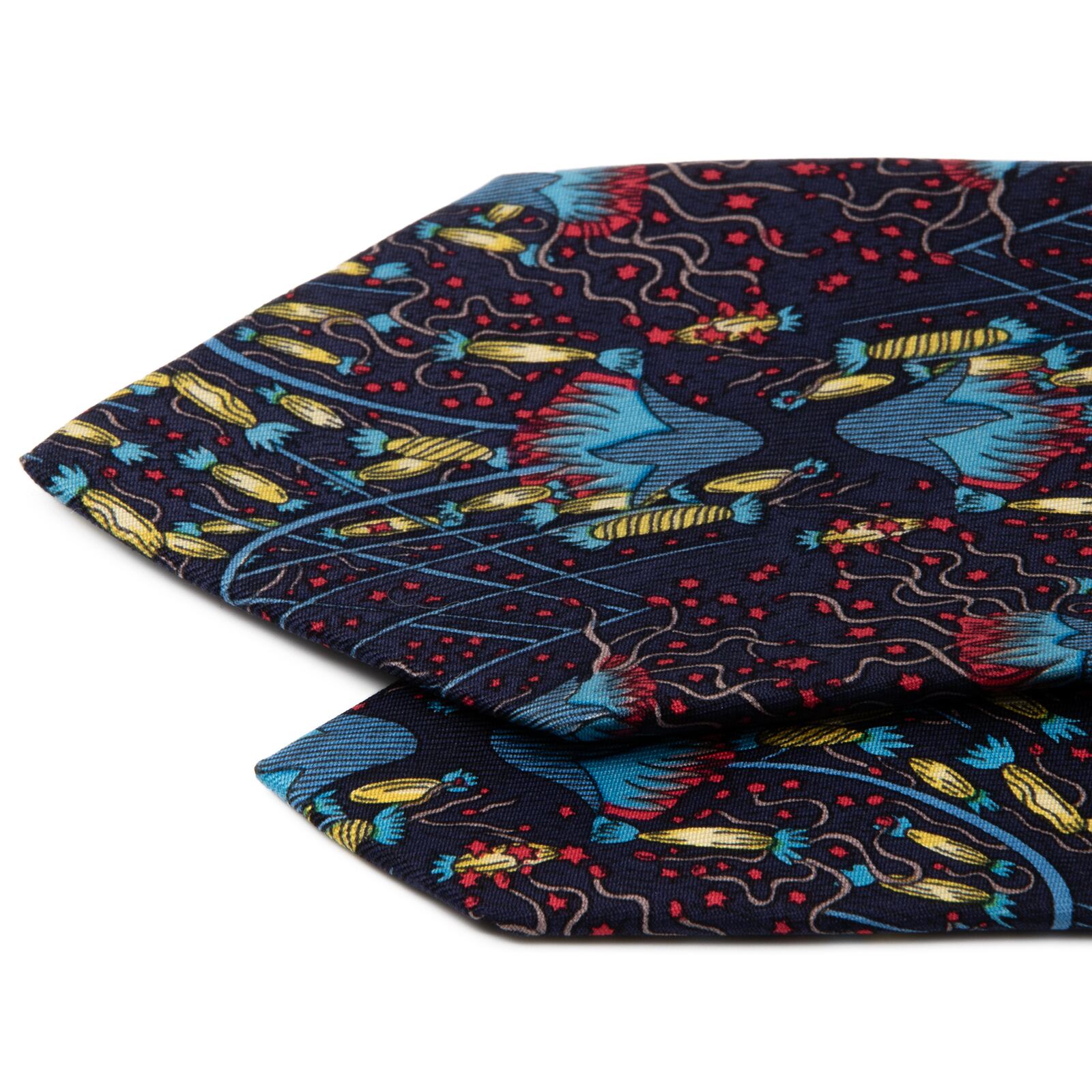 送料無料 エルメス ネクタイ レギュラータイ シルク ネイビーブルー 青 黄色 赤 総柄 Y2K 派手 目立つ ハイブランド フランス製 綺麗 P313