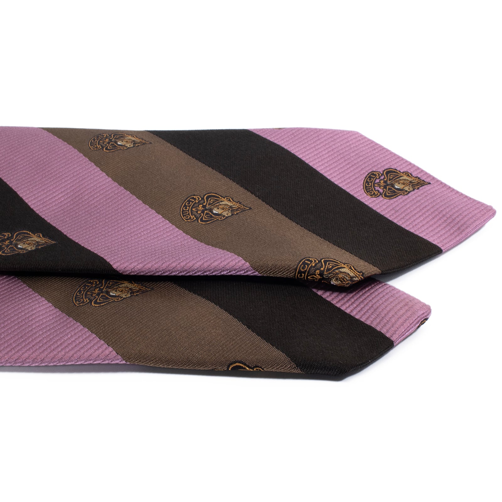 伝統的なレジメンタル柄に紋章を配したデザインが、クラシカルな美学と現代的な感性を融合させております。