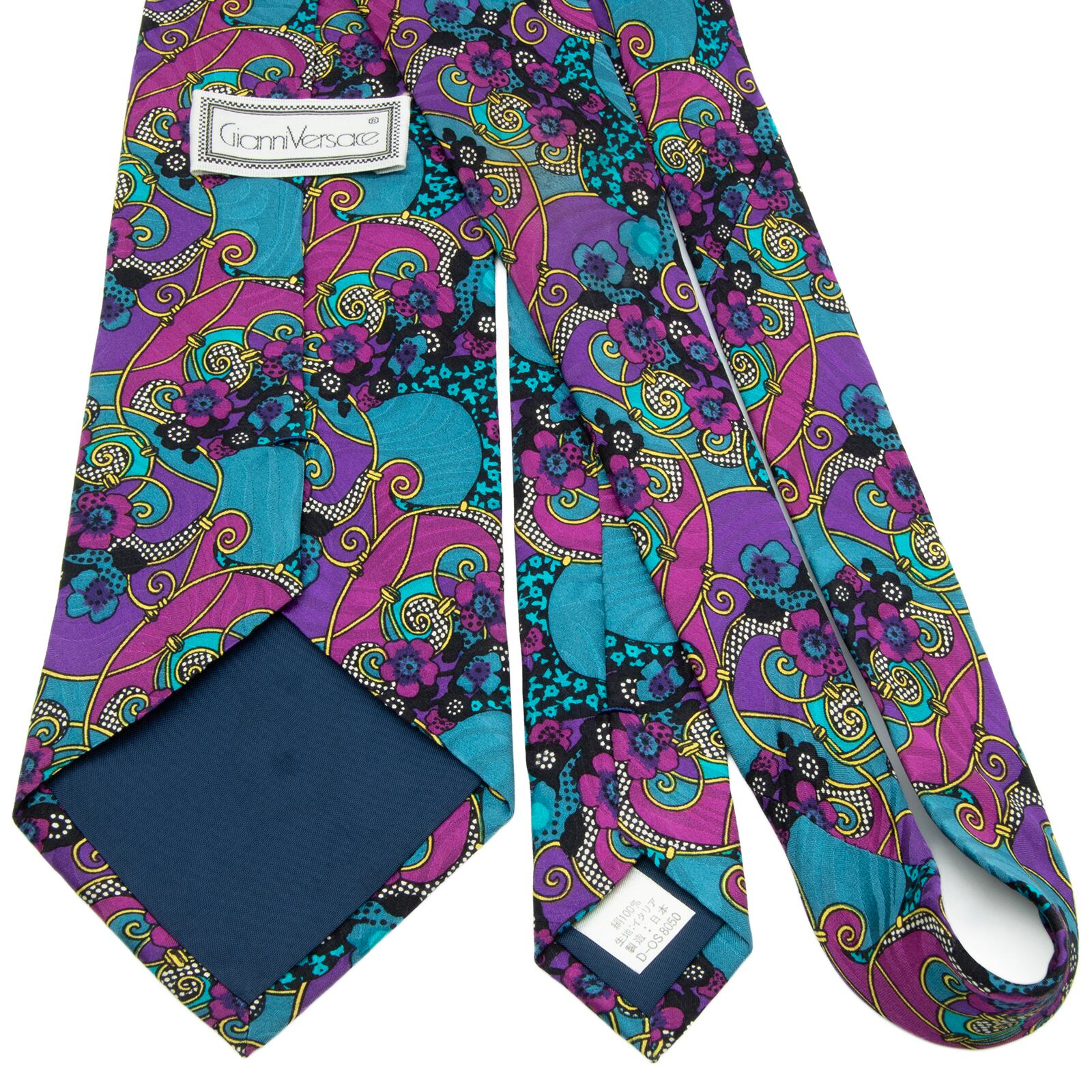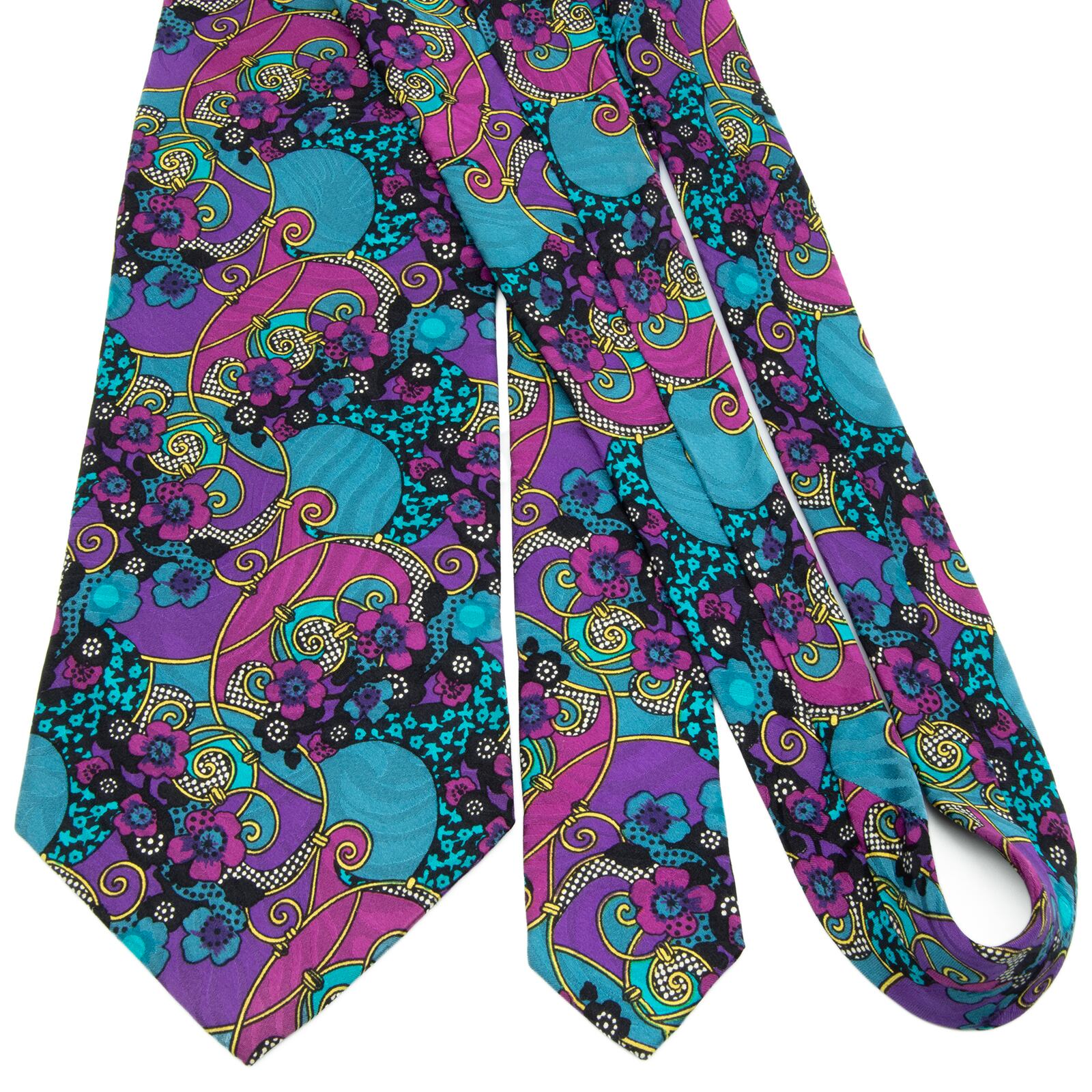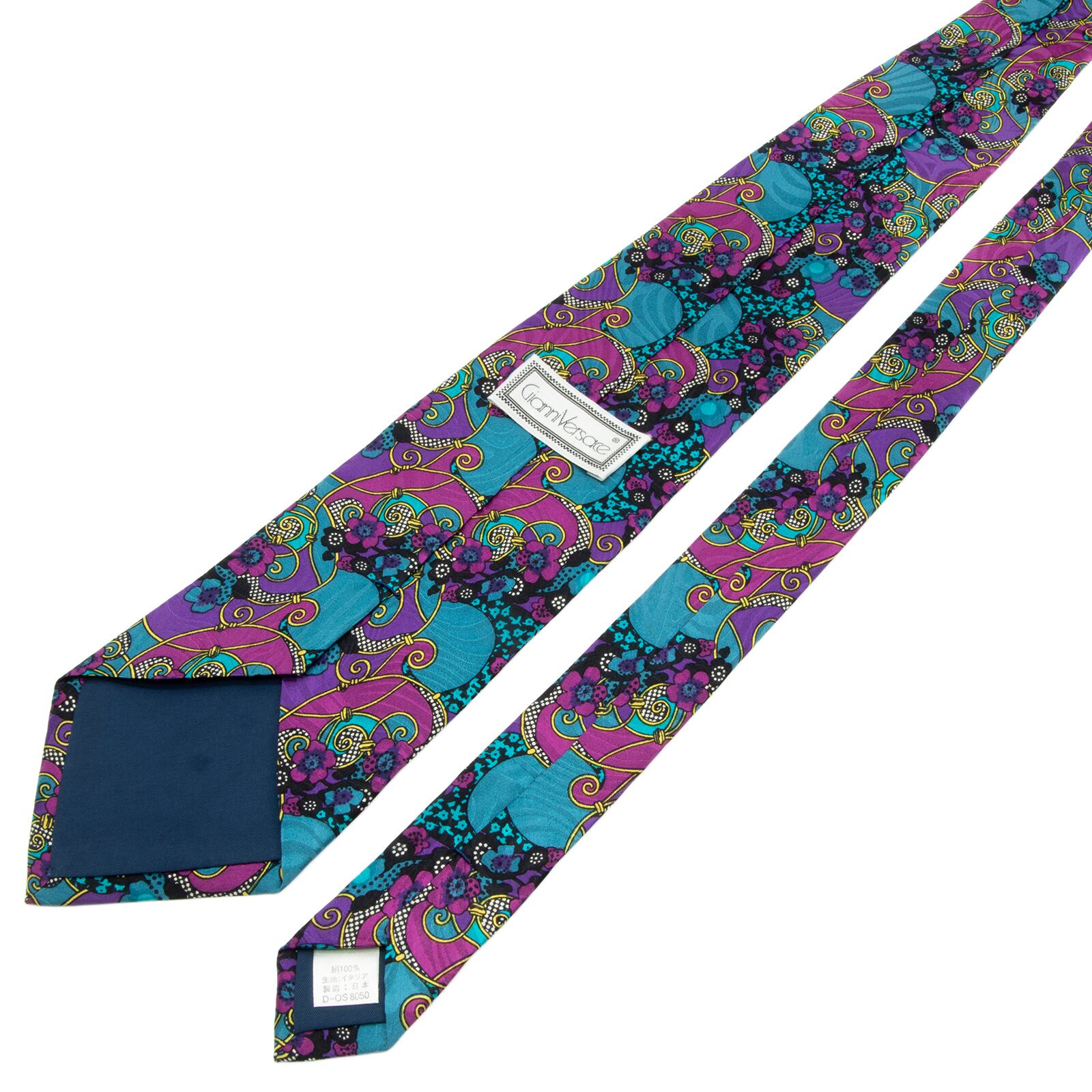 送料無料 ジャンニヴェルサーチェ ネクタイ レギュラータイ シルク 青緑色 パープル 赤紫色 黒 総柄 Y2K 光沢 花 派手 ハイブランド P308