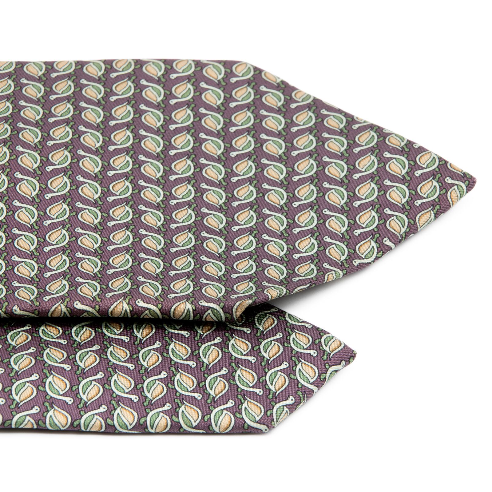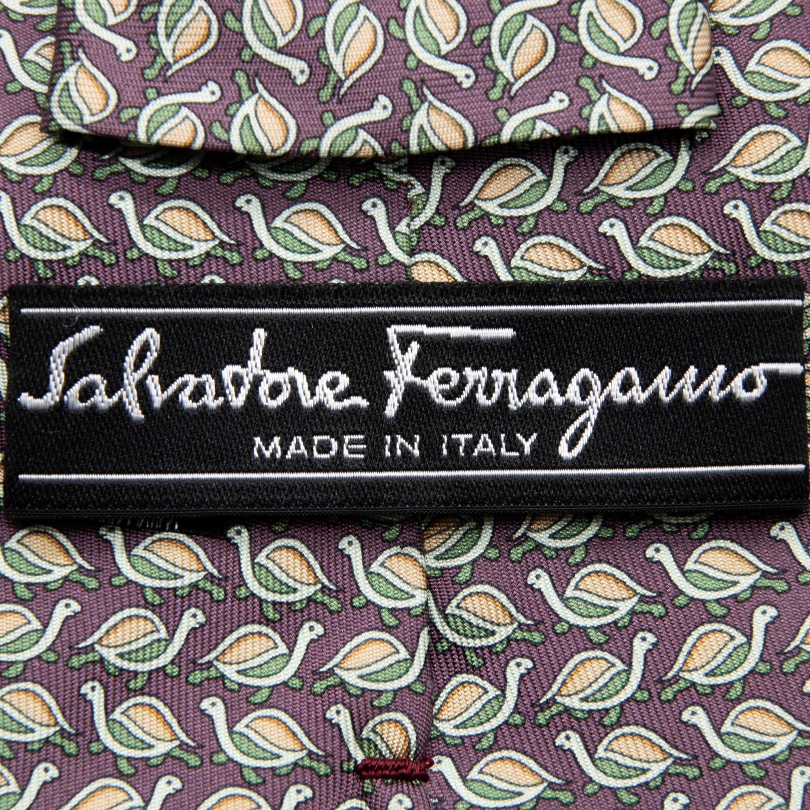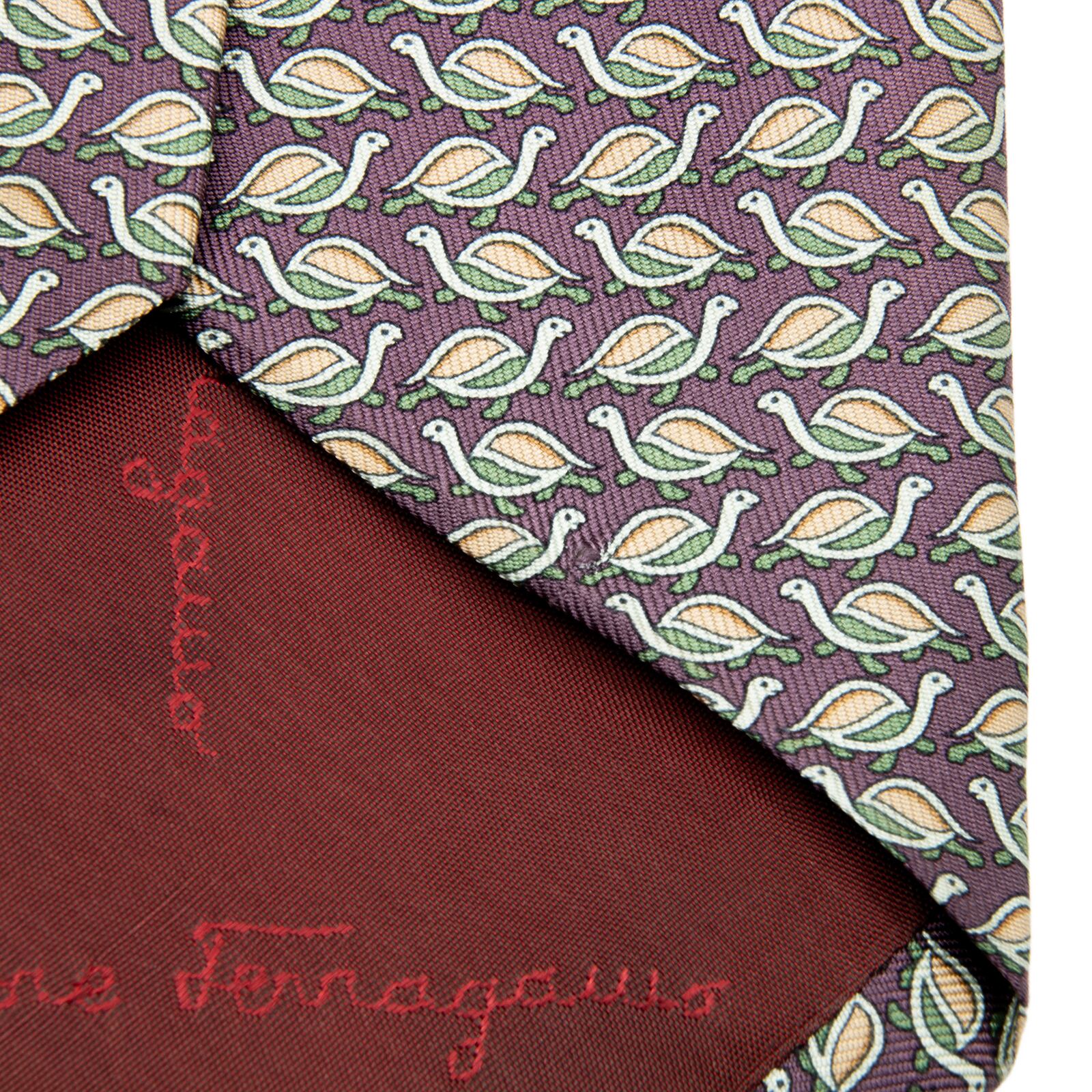 送料無料 フェラガモ ネクタイ シルク 紫 パープル 緑 黄緑色 オレンジ 総柄 動物 アニマル 亀 ハイブランド 珍しい イタリア製 綺麗 P484