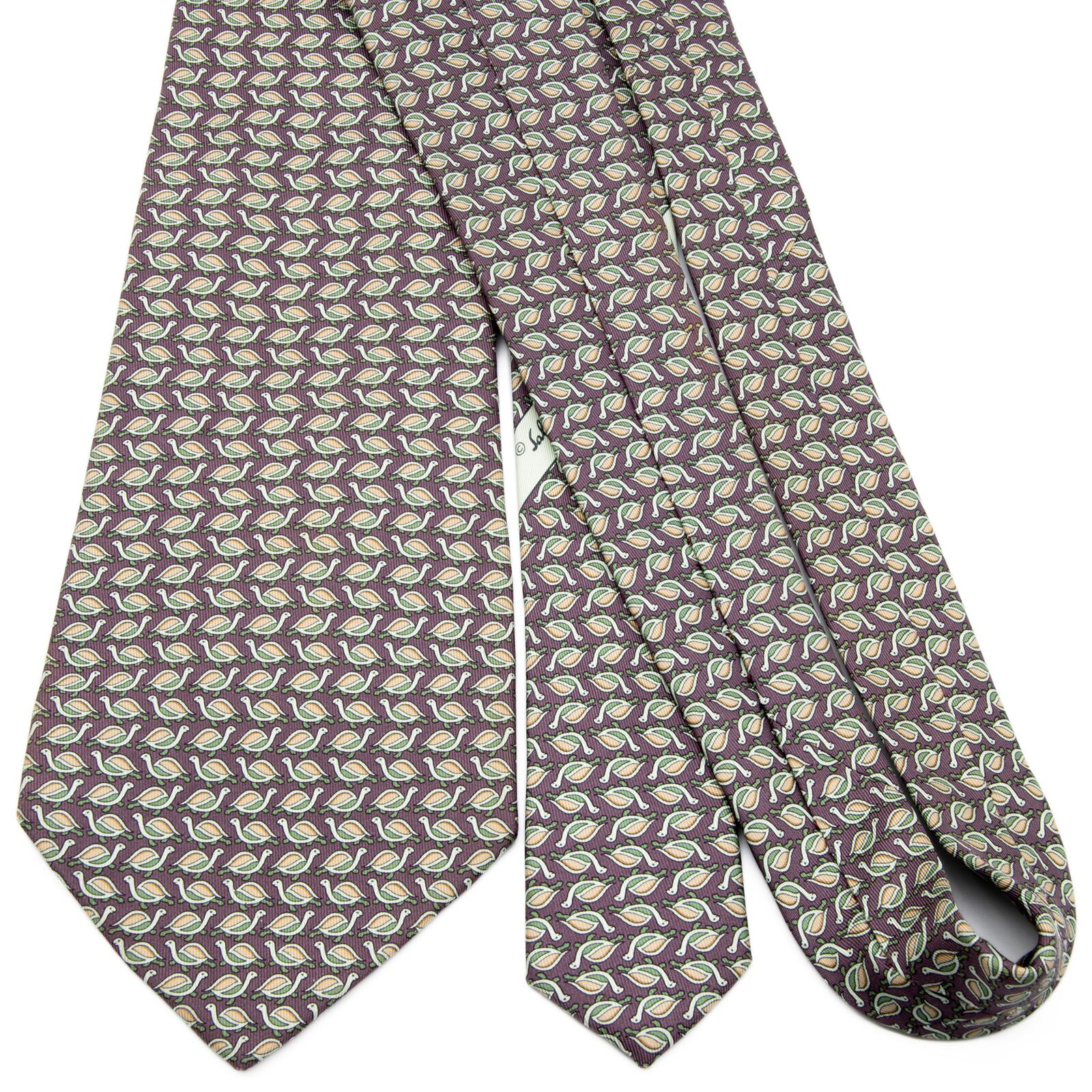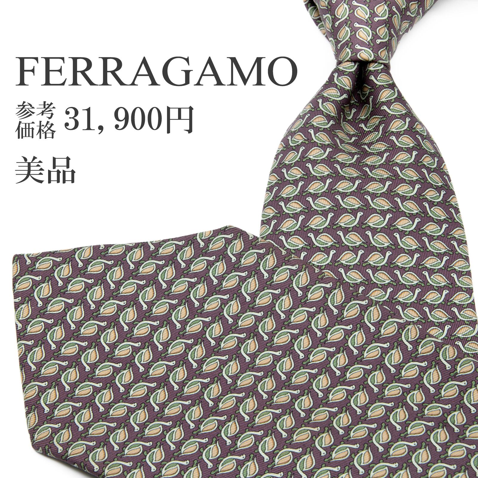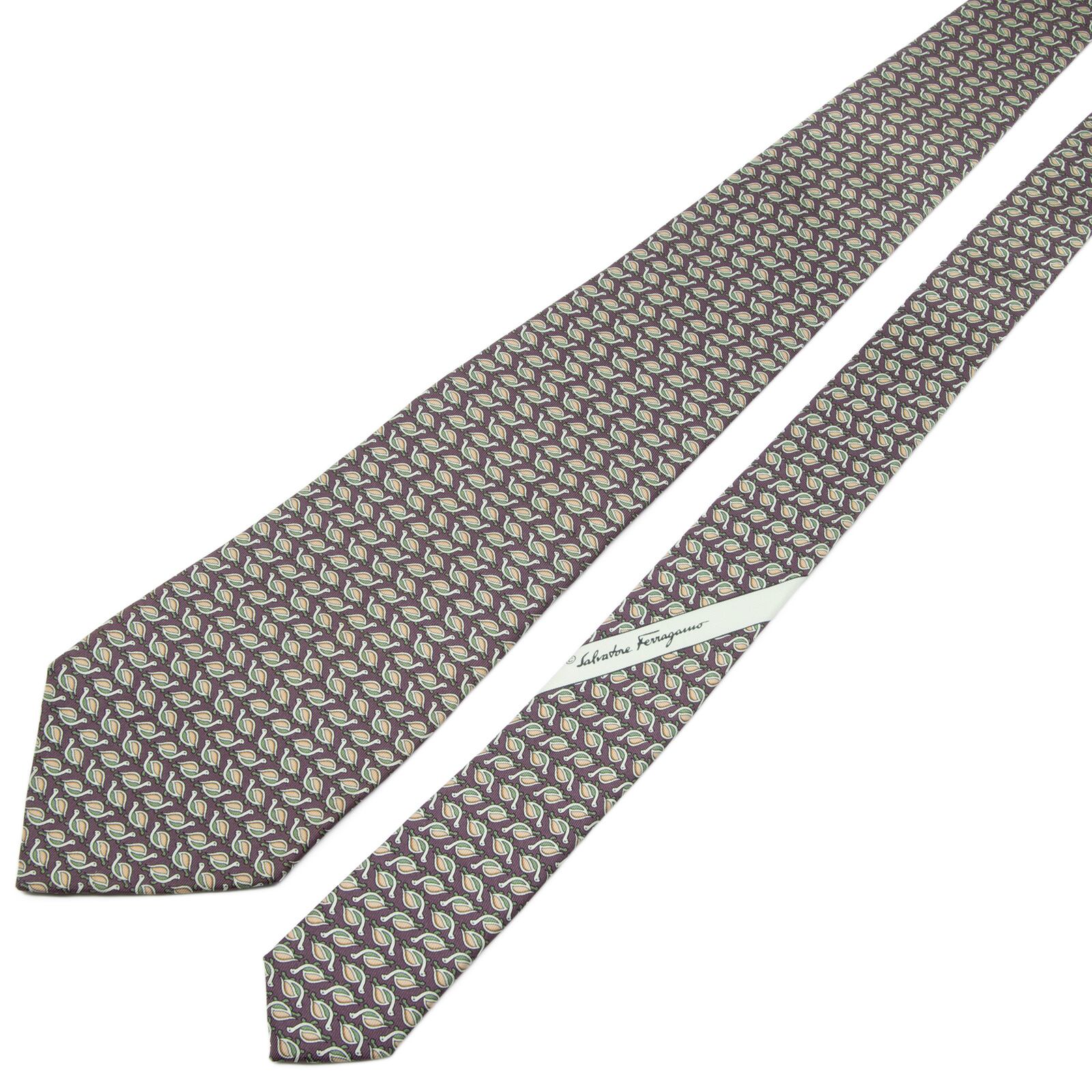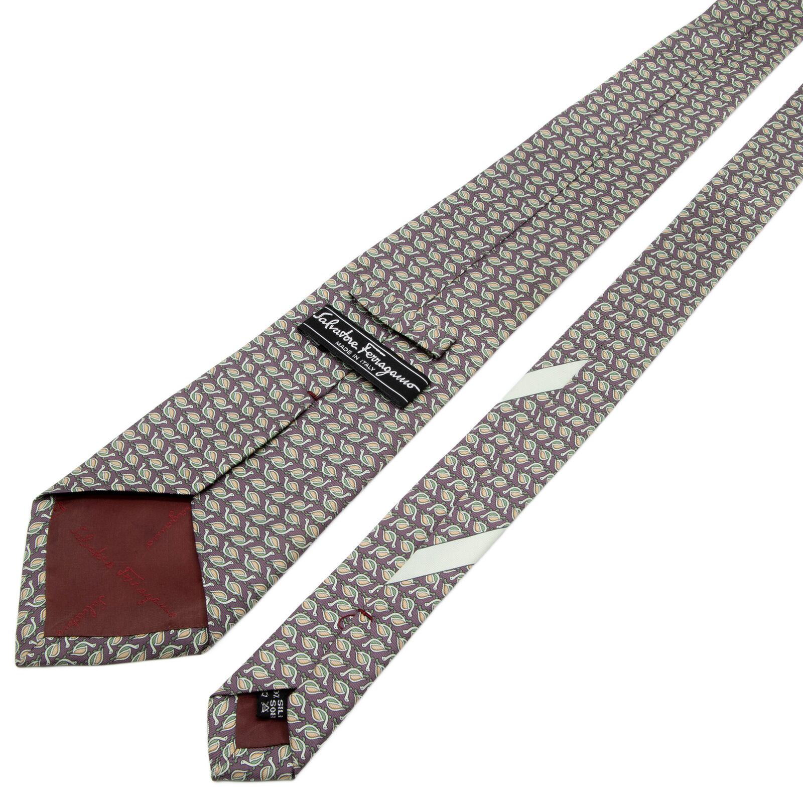 送料無料 フェラガモ ネクタイ シルク 紫 パープル 緑 黄緑色 オレンジ 総柄 動物 アニマル 亀 ハイブランド 珍しい イタリア製 綺麗 P484