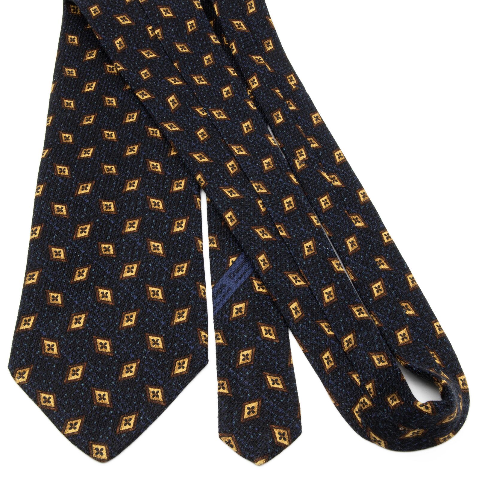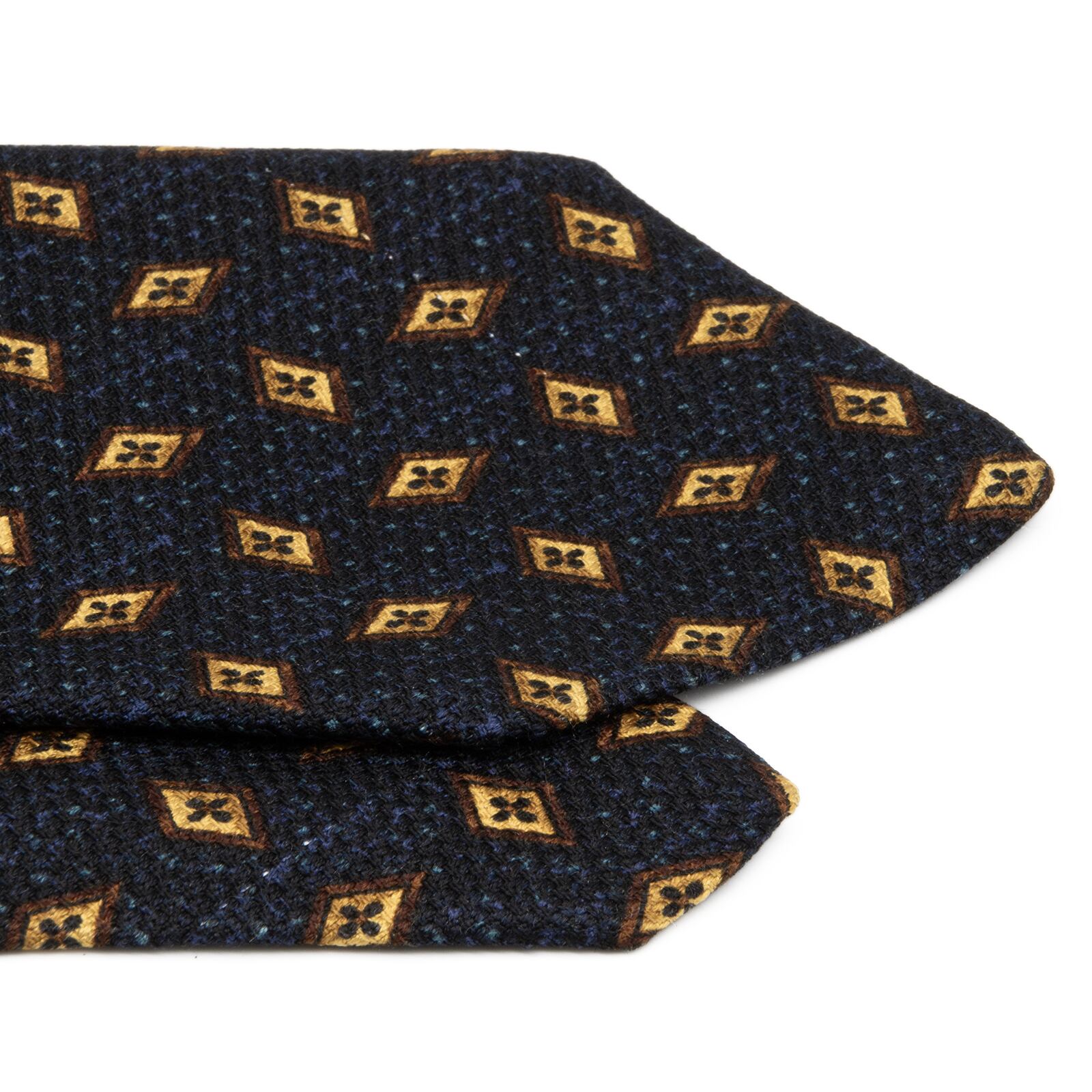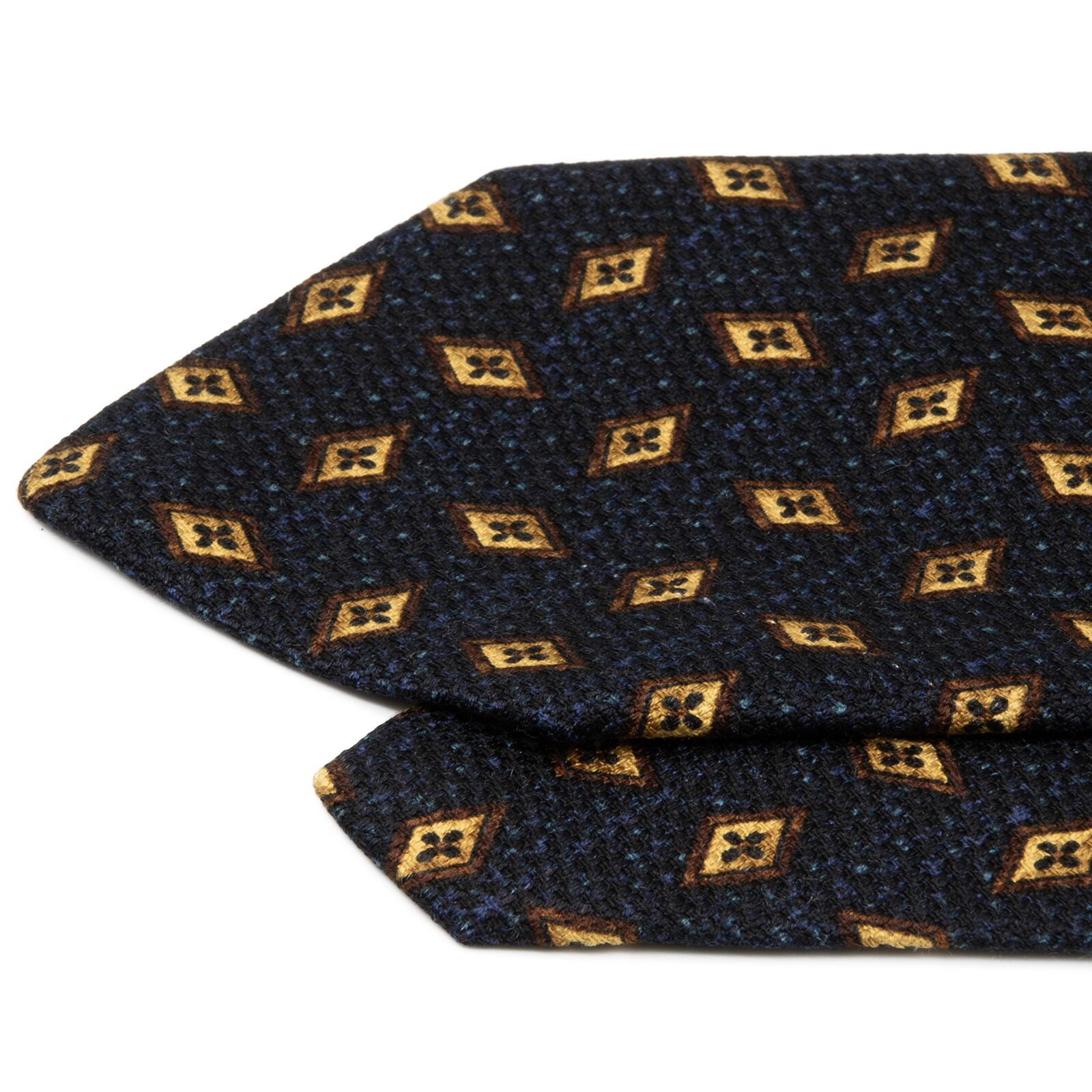 深みのあるネイビーブルーにブラウンのひし形模様が規則正しく並び、知的で落ち着いた大人の雰囲気を演出いたします。